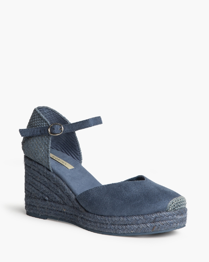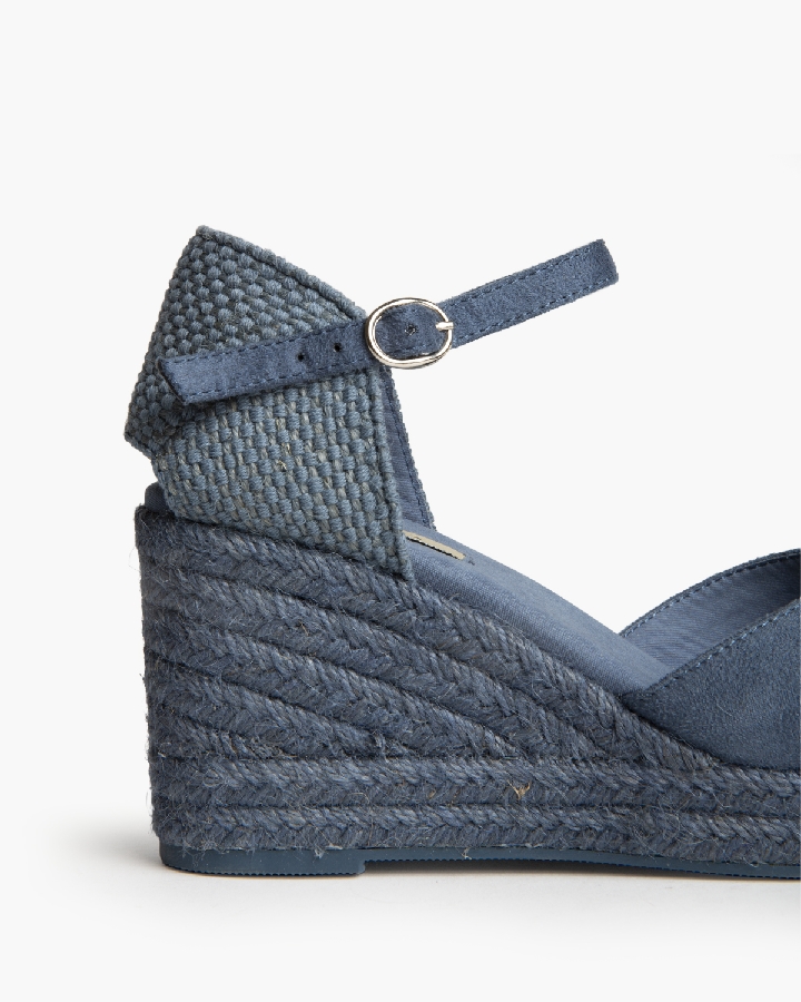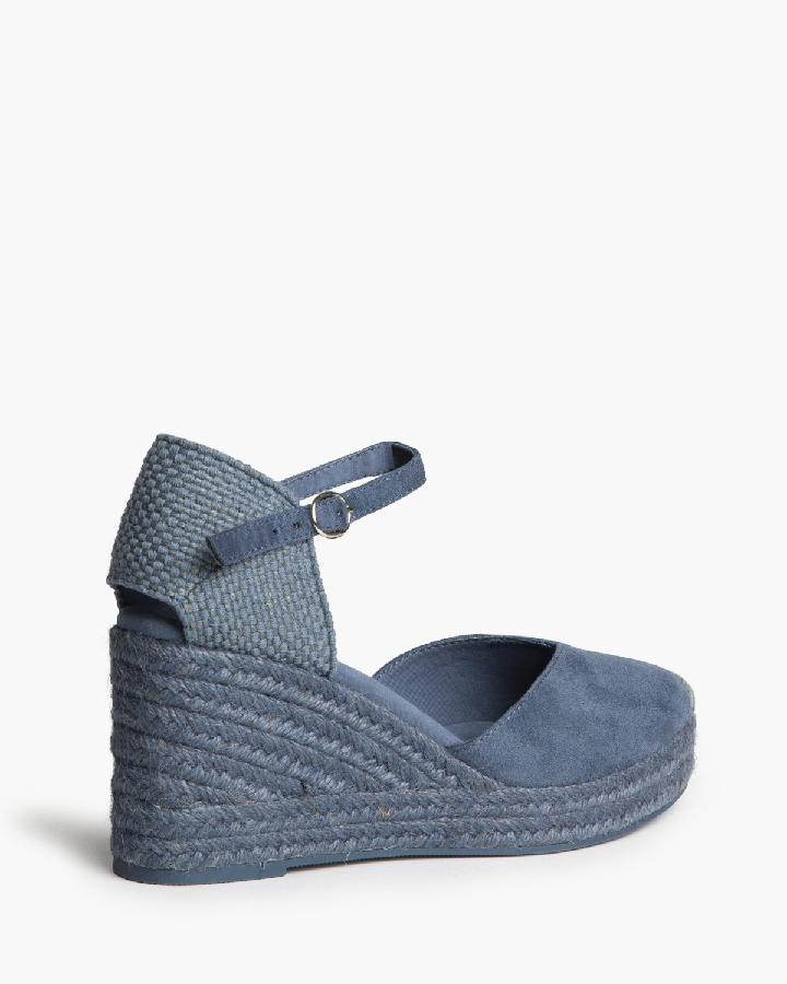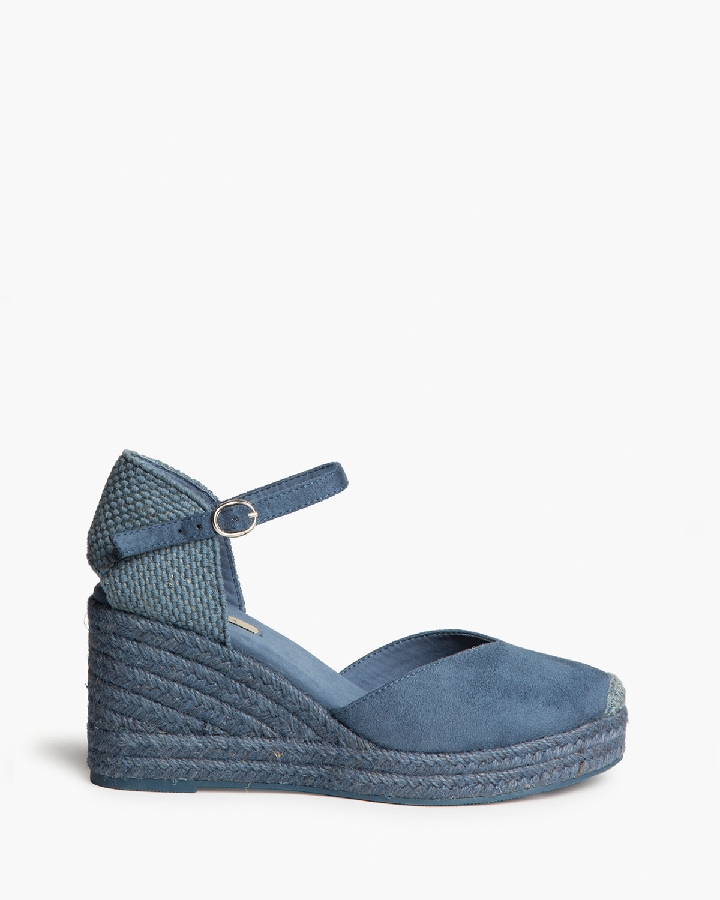 Plataforma tipo valenciana, con cuña en yute. Escote en pico. Cierre hebilla en la tira del talón.