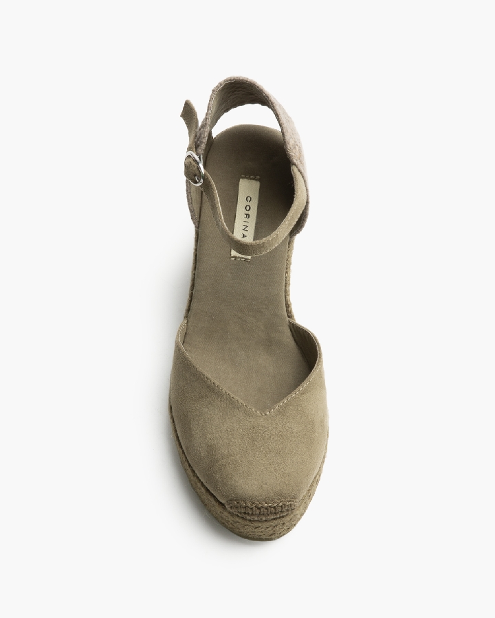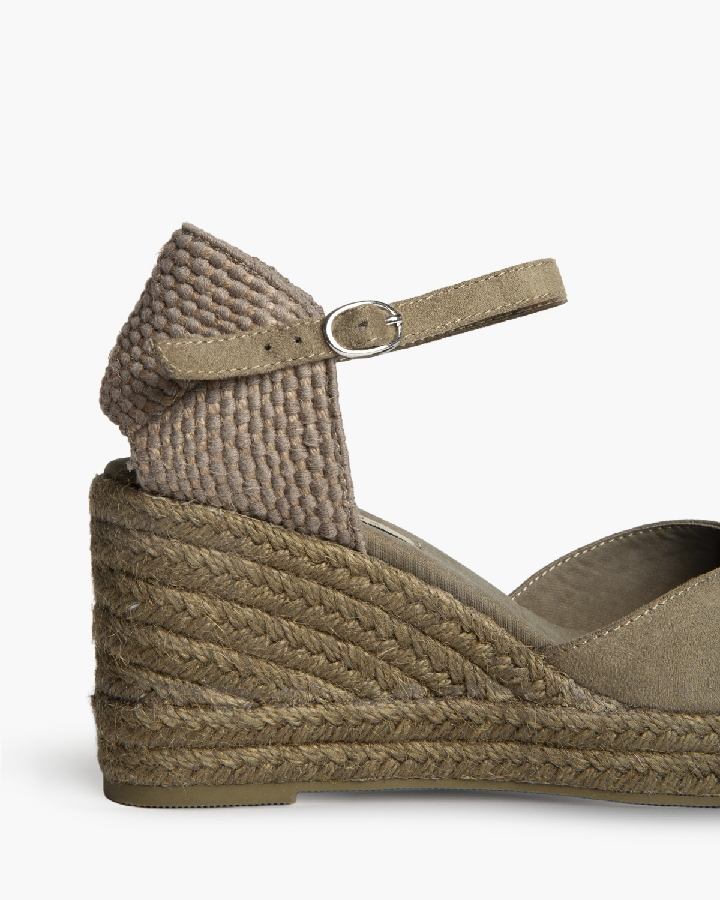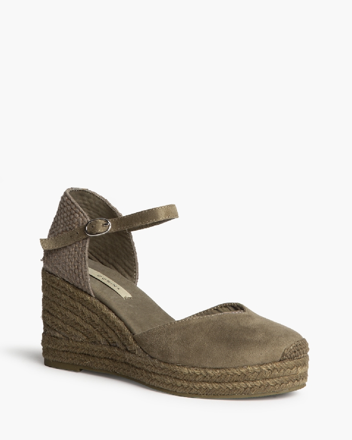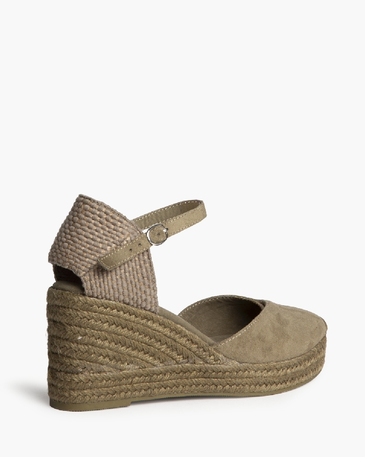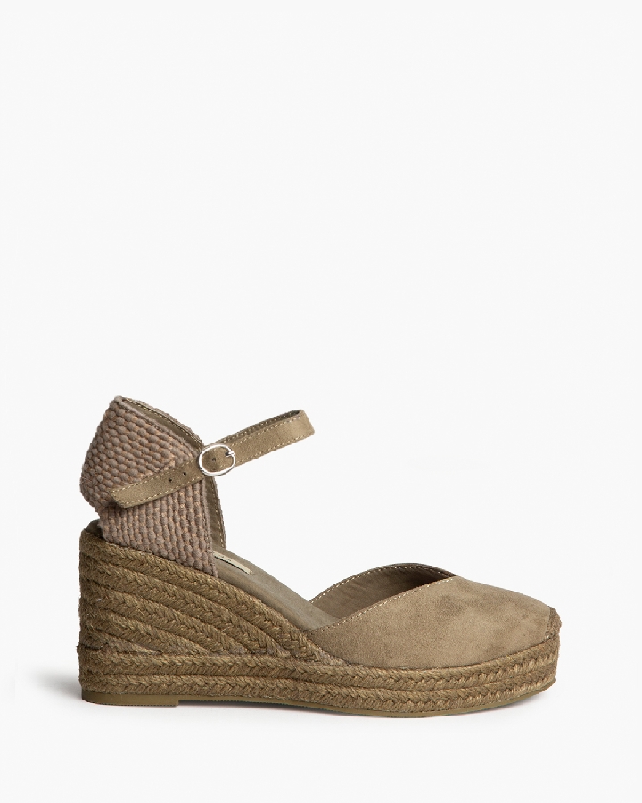 Plataforma tipo valenciana, con cuña en yute. Escote en pico. Cierre hebilla en la tira del talón.