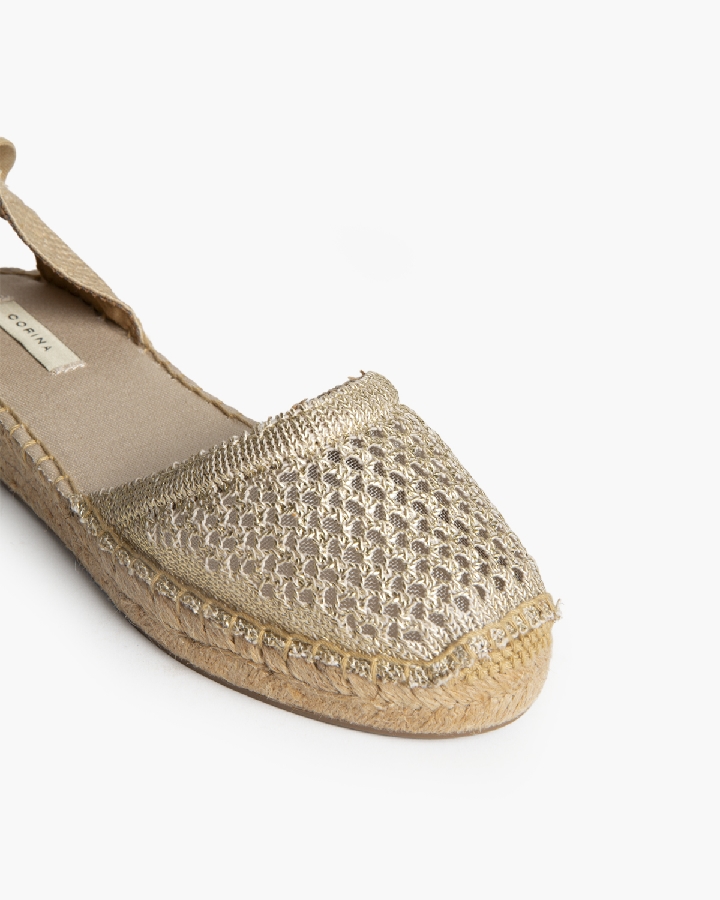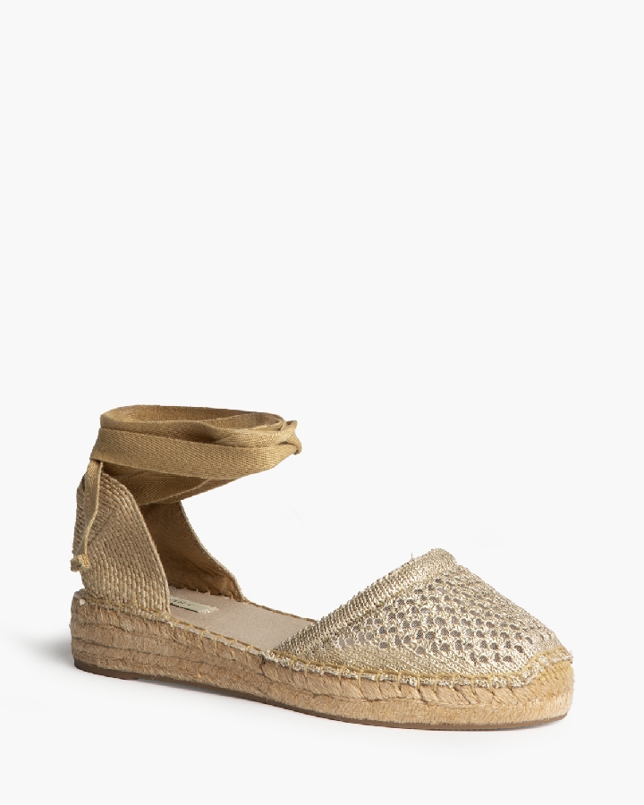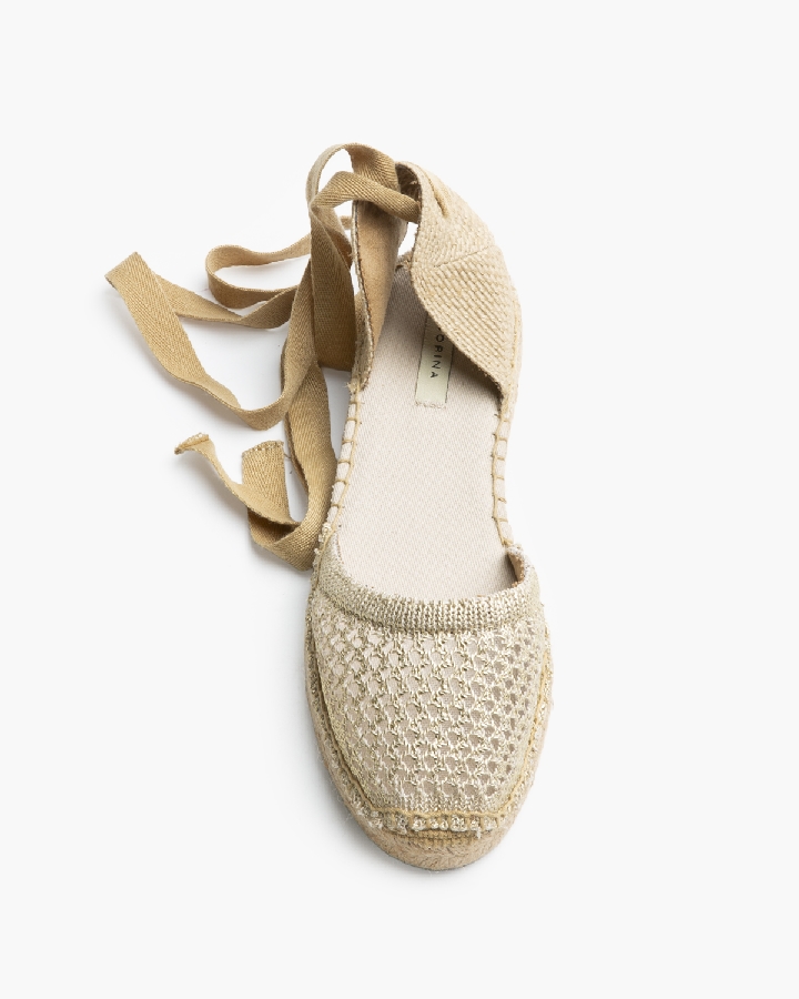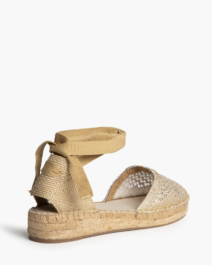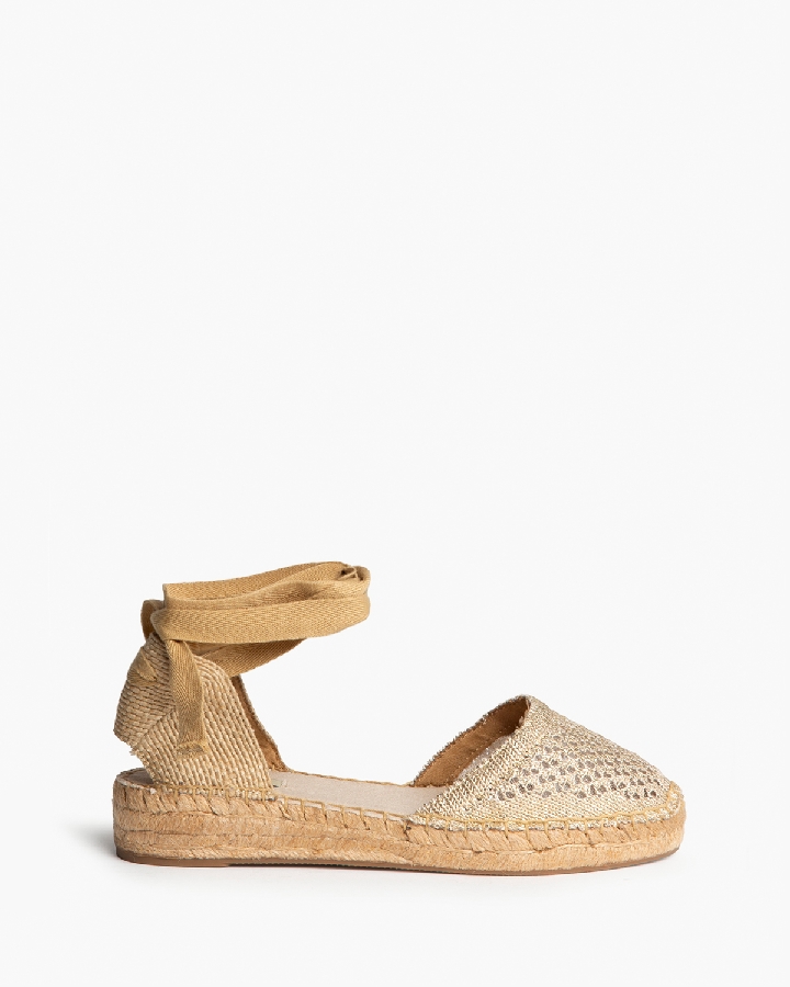 Sandalia plana, tipo alpargata, con suela en yute. Corte calado. Cierre mediante tiras anudadas al tobillo.