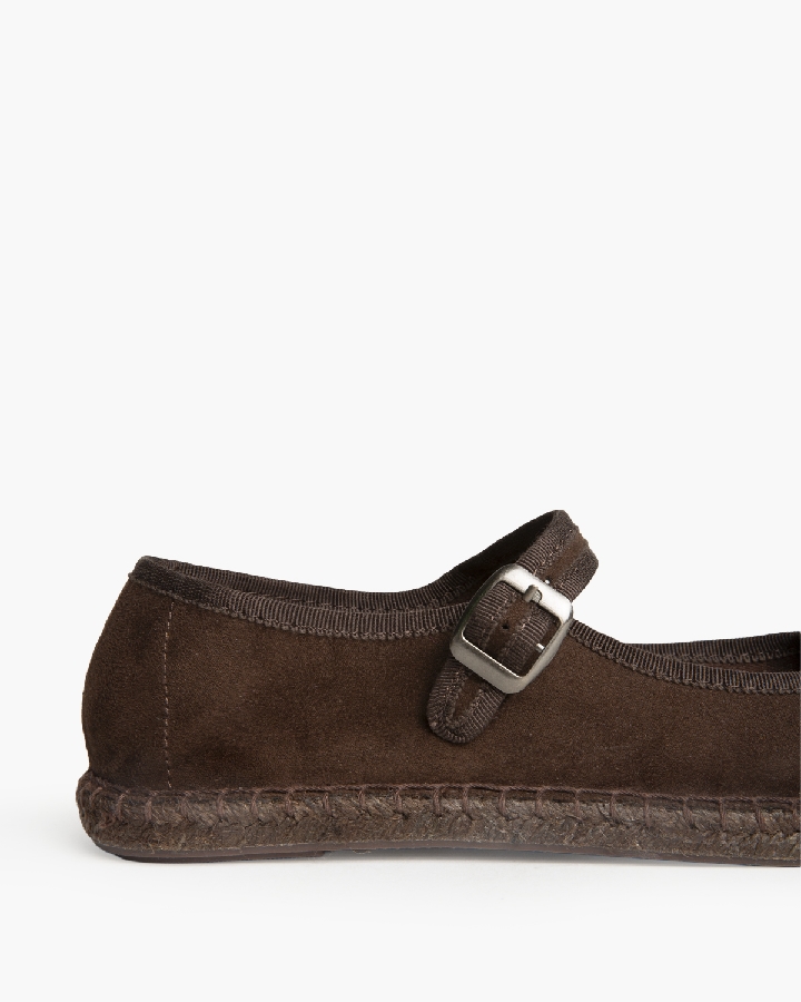 Zapato plano tipo mary jane con suela de yute. Cierre mediante hebi-Ila en el lateral. Acabado en punta redonda.