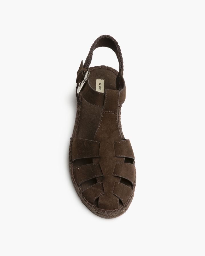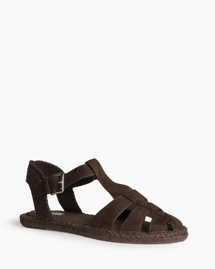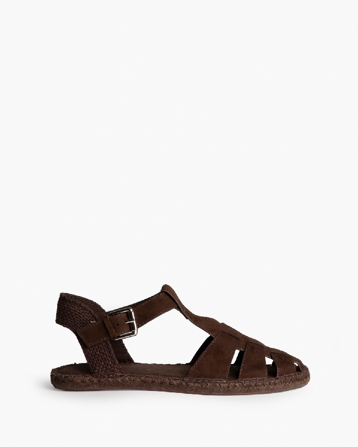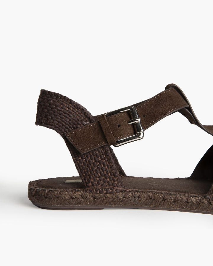 Sandalia plana, tipo cangrejera, con suela en yute. Cierre mediante hebilla en el lateral.