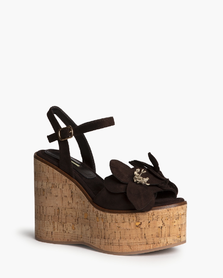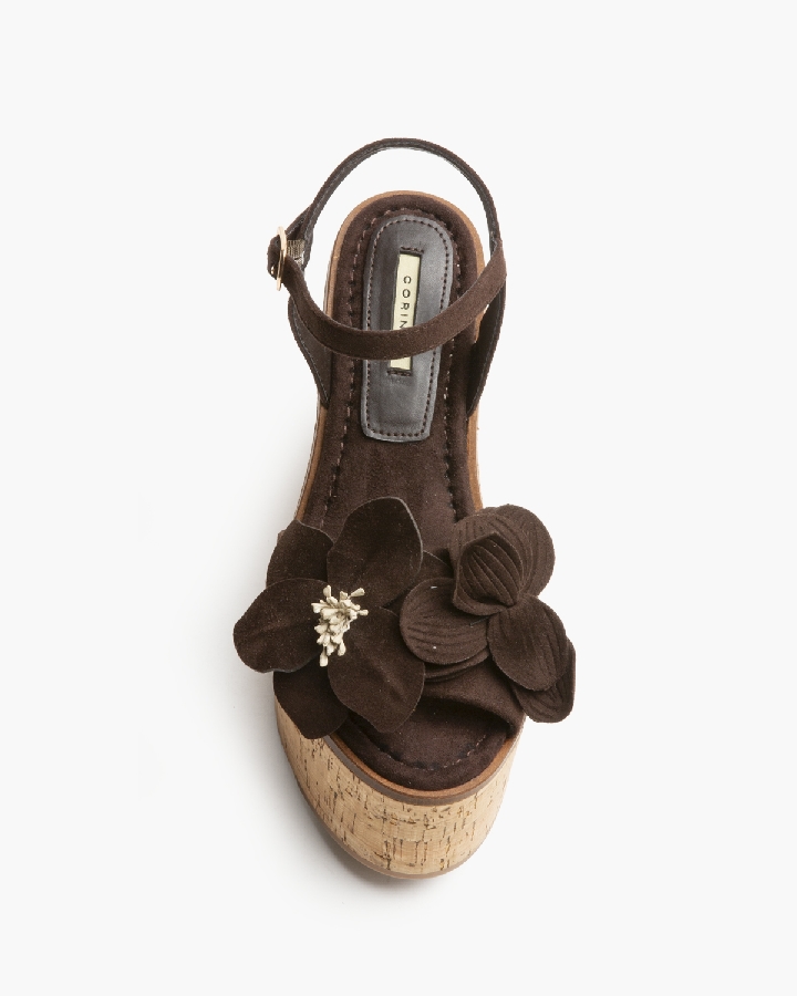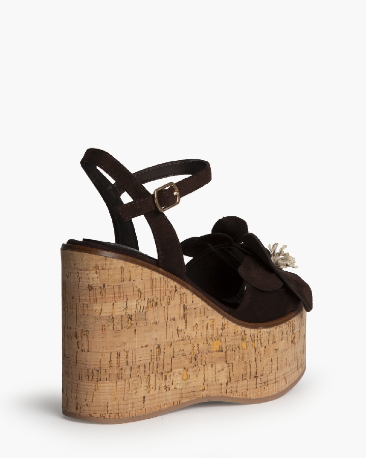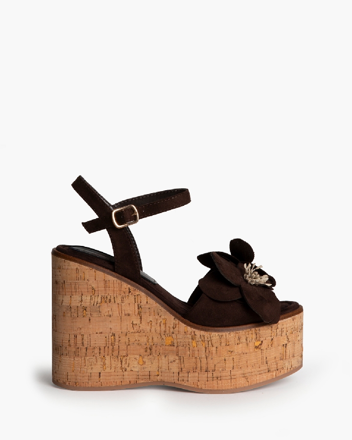 Sandalia con cuña. Corte con detalle de flores. Cierre mediante hebilla en el lateral. Cuña en corcho.