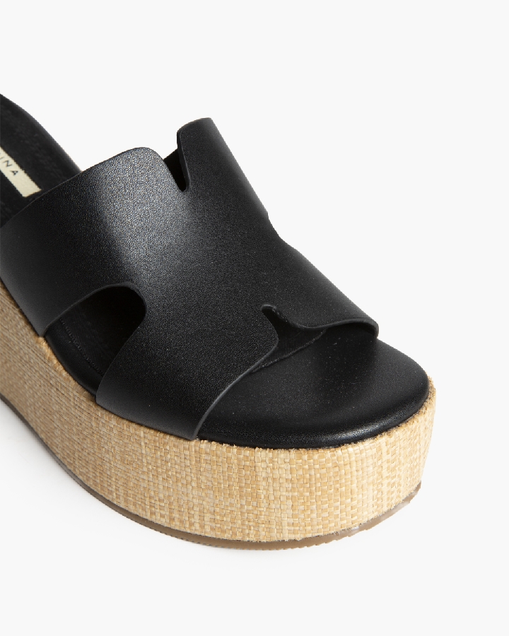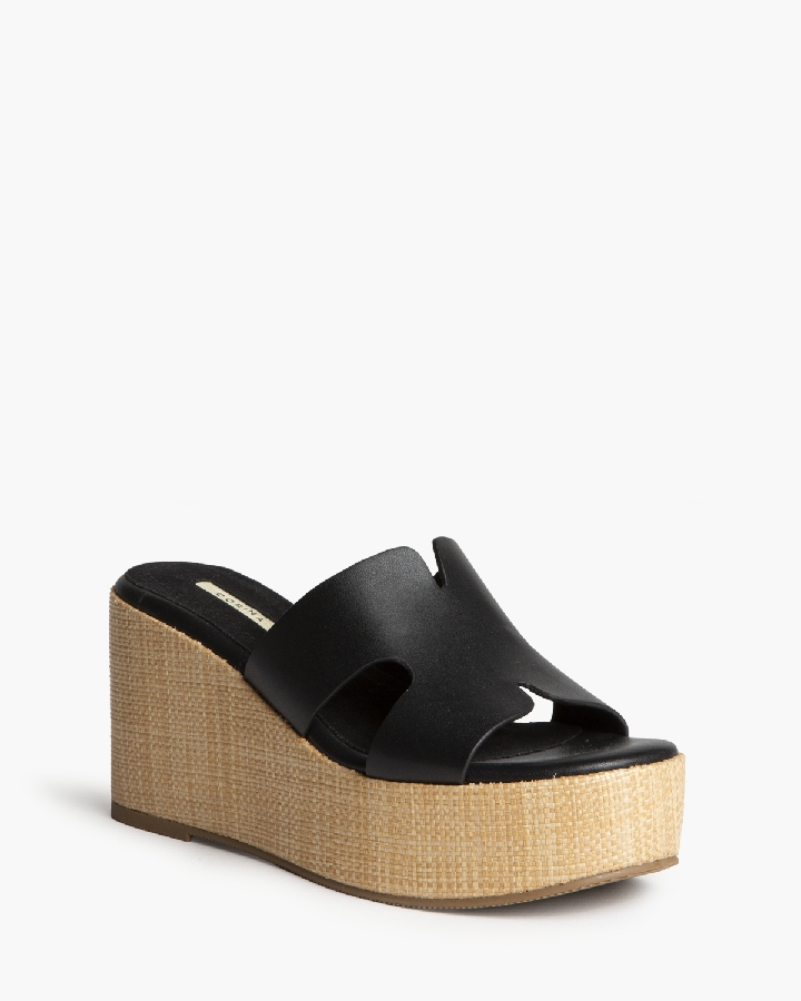 Sandalia con cuña. Corte de pala ancha con corte simétrico. Cuña en rafia.