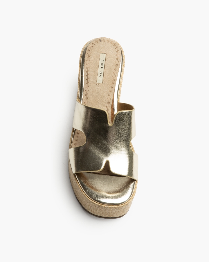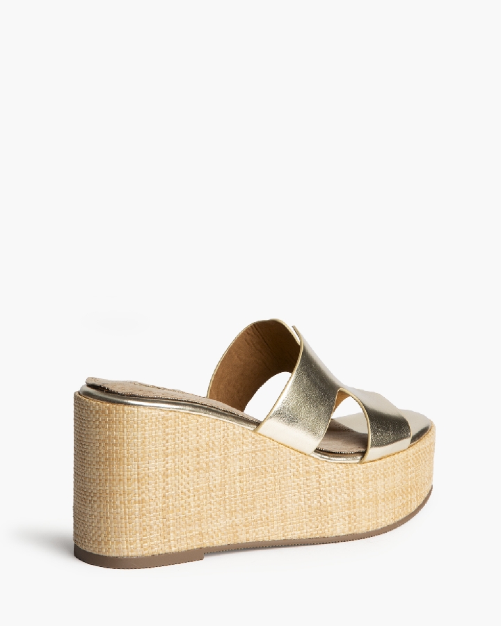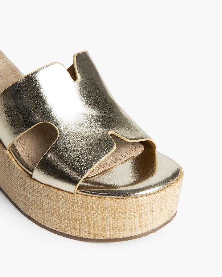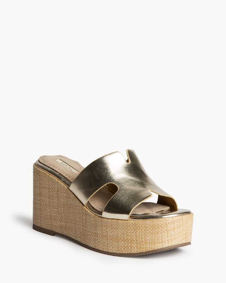 Sandalia con cuña. Corte de pala ancha con corte simétrico. Cuña en rafia.