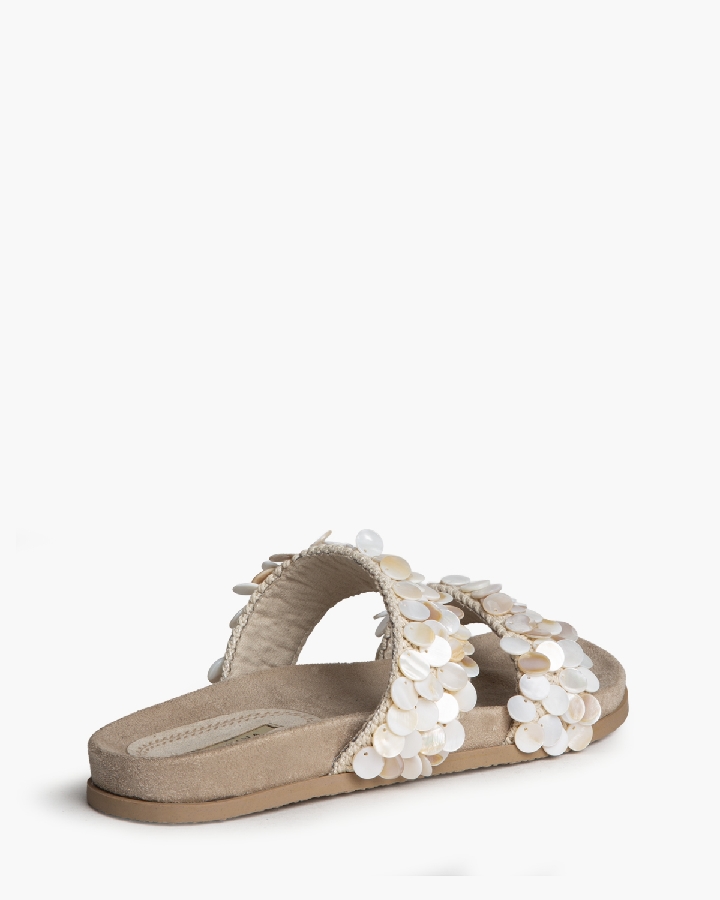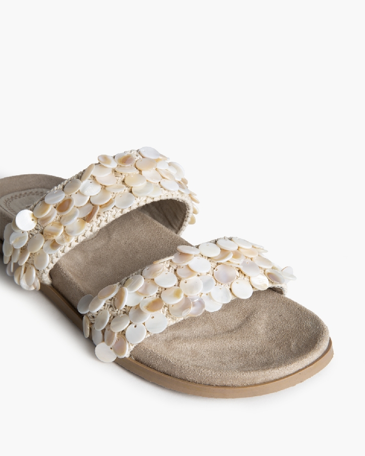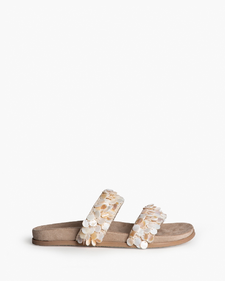 Sandalia plana. Corte de tiras anchas, detalle de abalorios. Plantilla ergonómica.