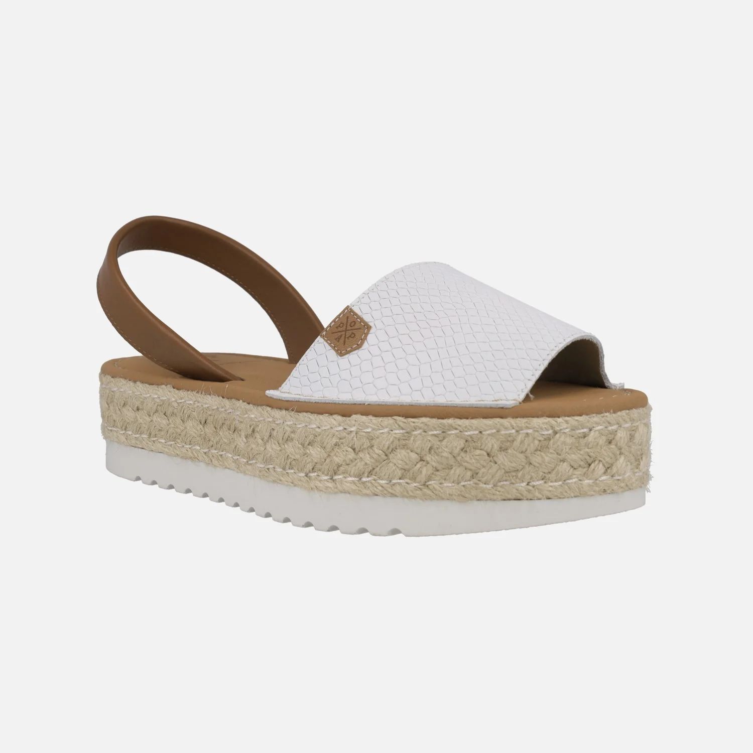 Menorquinas Popa Saona Snake blancas. Menorquinas con pala en piel blanca grabada, efecto serpiente. Detalle de logo de la marca. Tira de piel al talón en color cuero. Interior forrado en piel vegana (sintéticos), con planta acolchada. Plataforma de yute natural, con suela de goma. Altura total 4 cms. Made in Spain.