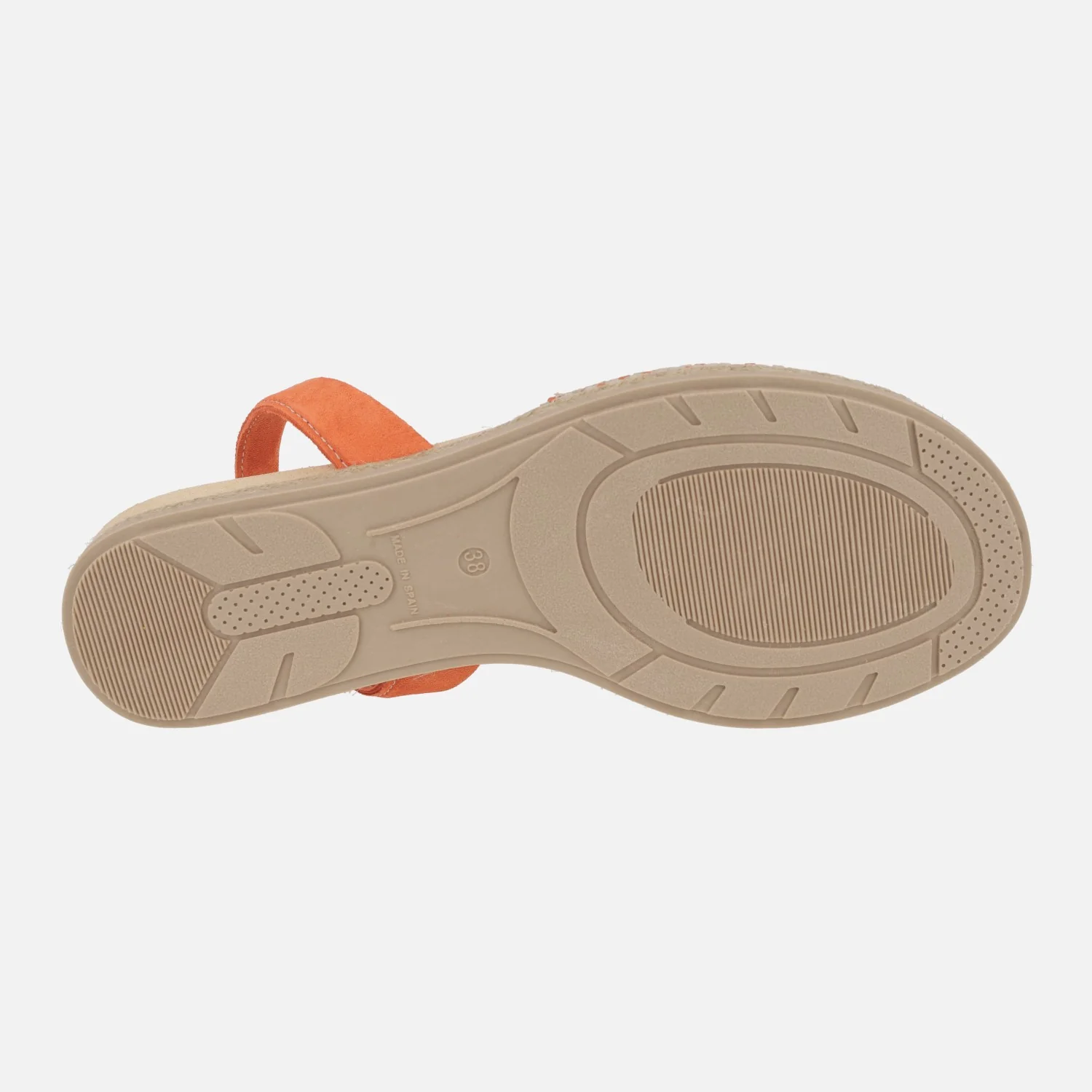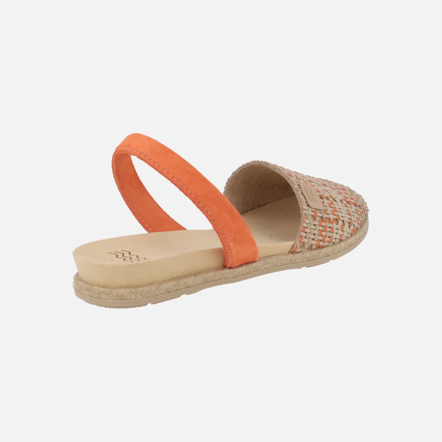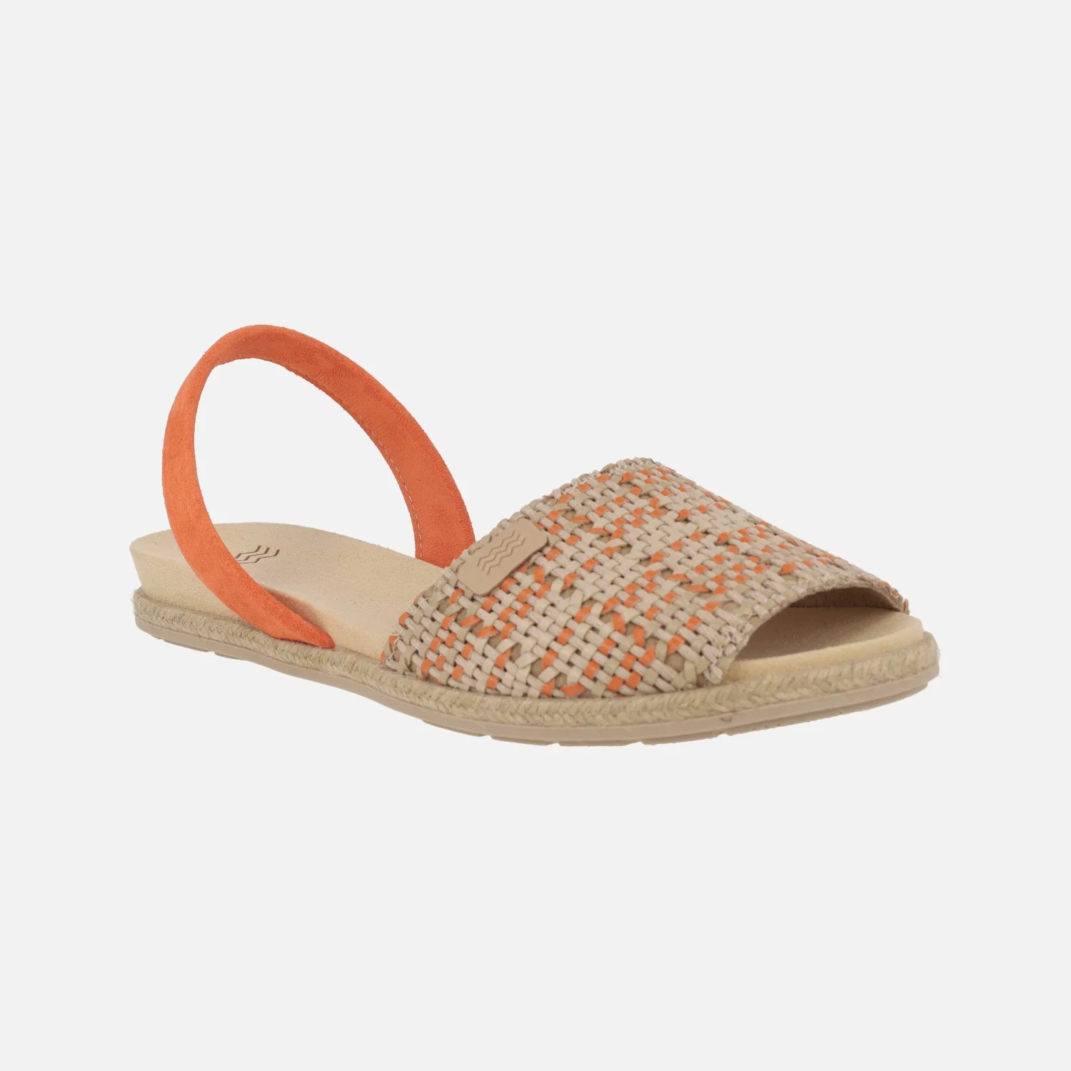Abarcas menorquinas para mujer de la marca Castell modelo A0007526 Dora Yute trenzado naranja. Sandalias planas, elaboradas en tejido trenzado en tonos naranja y beige, con tira de serraje color naranja al talón. Forro y planta de piel. Plantillas anatómicas acolchadas. Entresuela de yute y piso de goma, altura total 2,5 cms. Made in Spain.