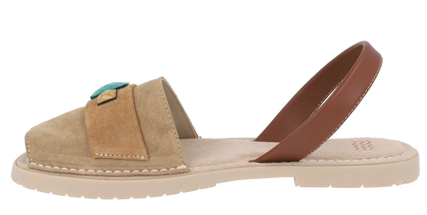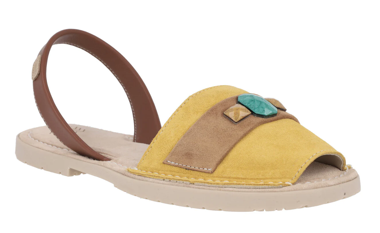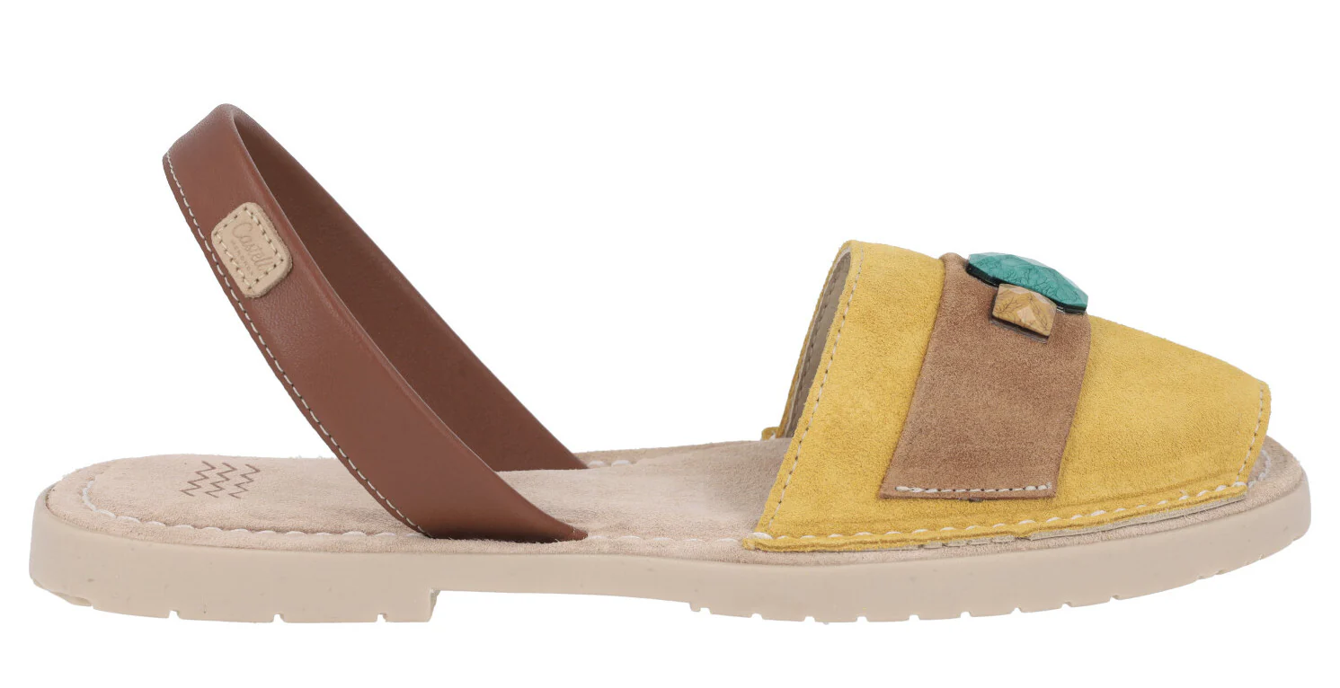 Preciosas menorquinas para mujer de la marca española Castell modelo 2441. Disponibles en combinado camel y en combinado mostaza, están elaboradas en piel nobuck, con tira de piel lisa al talón. Adorno de pedrería en la pala. Forro y planta de piel. Suela de goma. Planas, apenas 1 cm de altura de piso. Made in Spain.