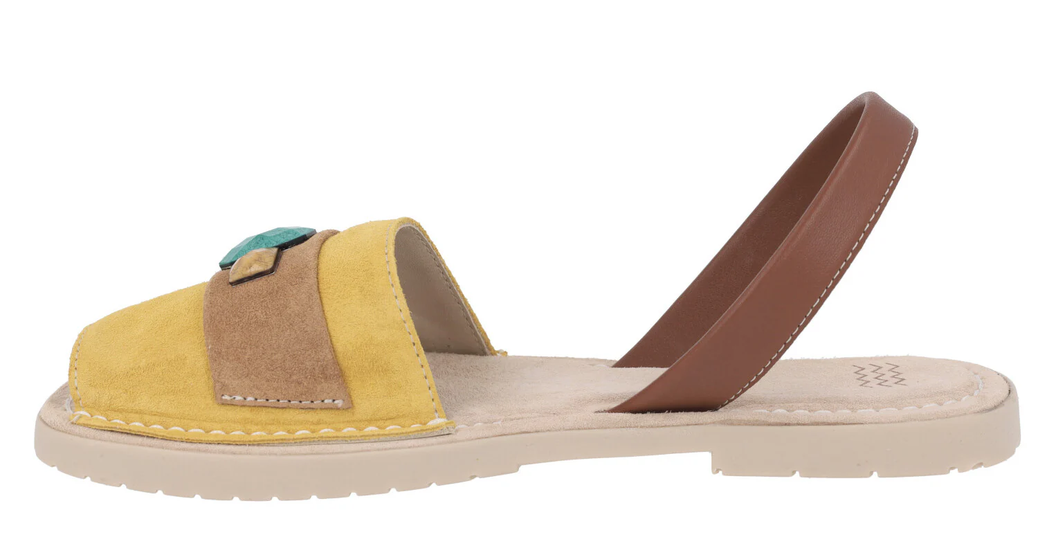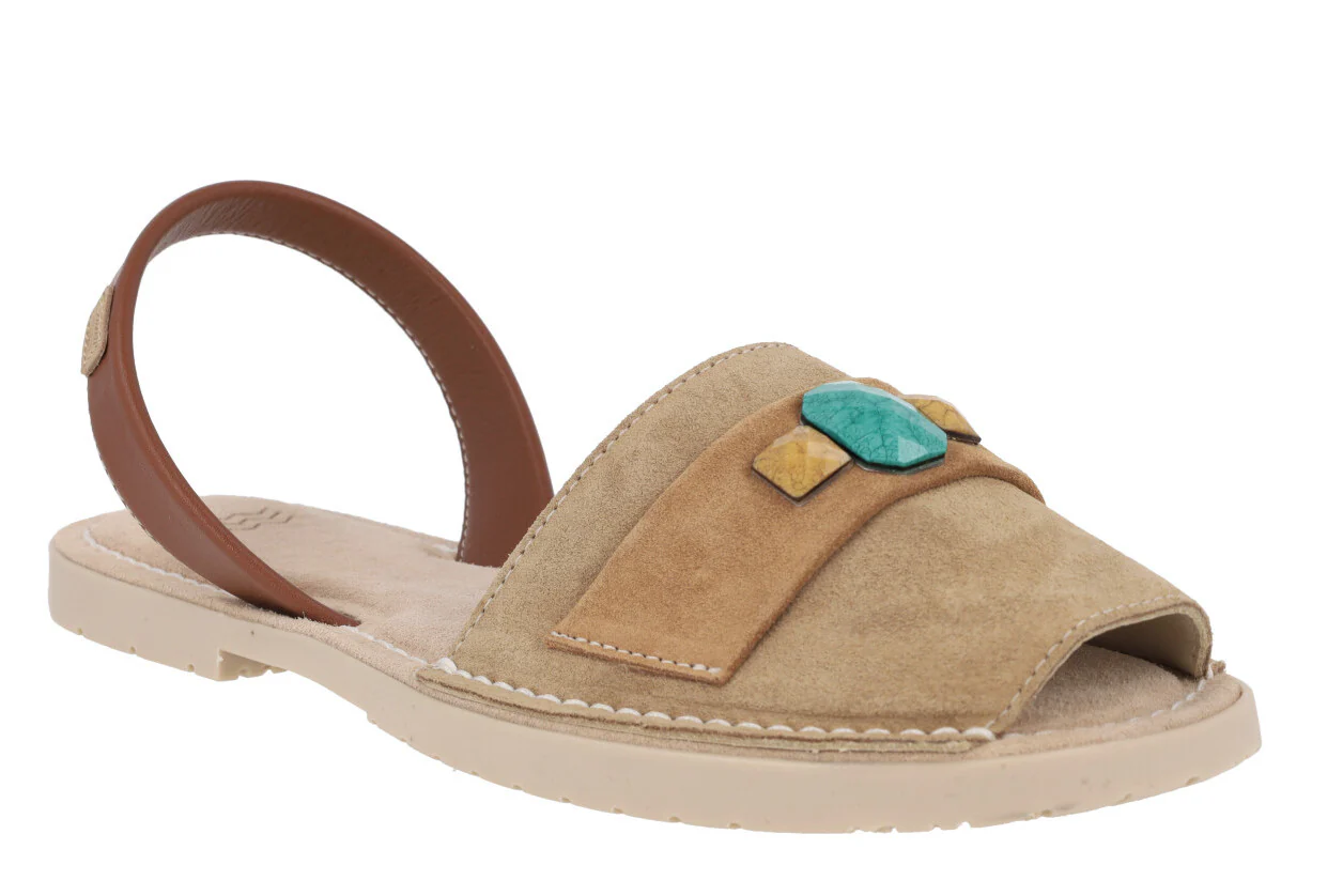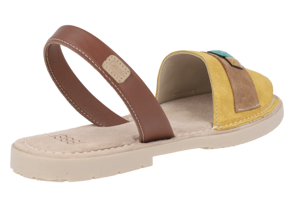 Preciosas menorquinas para mujer de la marca española Castell modelo 2441. Disponibles en combinado camel y en combinado mostaza, están elaboradas en piel nobuck, con tira de piel lisa al talón. Adorno de pedrería en la pala. Forro y planta de piel. Suela de goma. Planas, apenas 1 cm de altura de piso. Made in Spain.