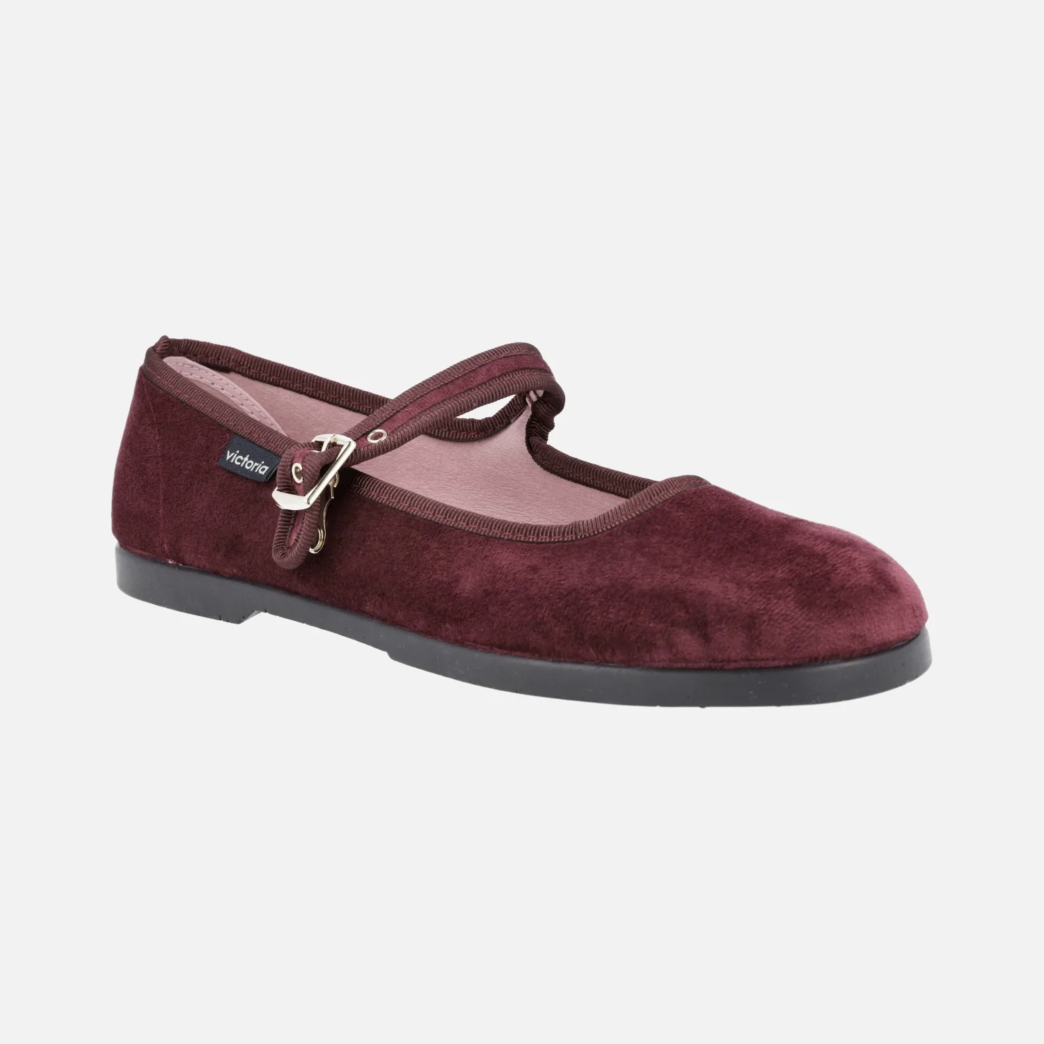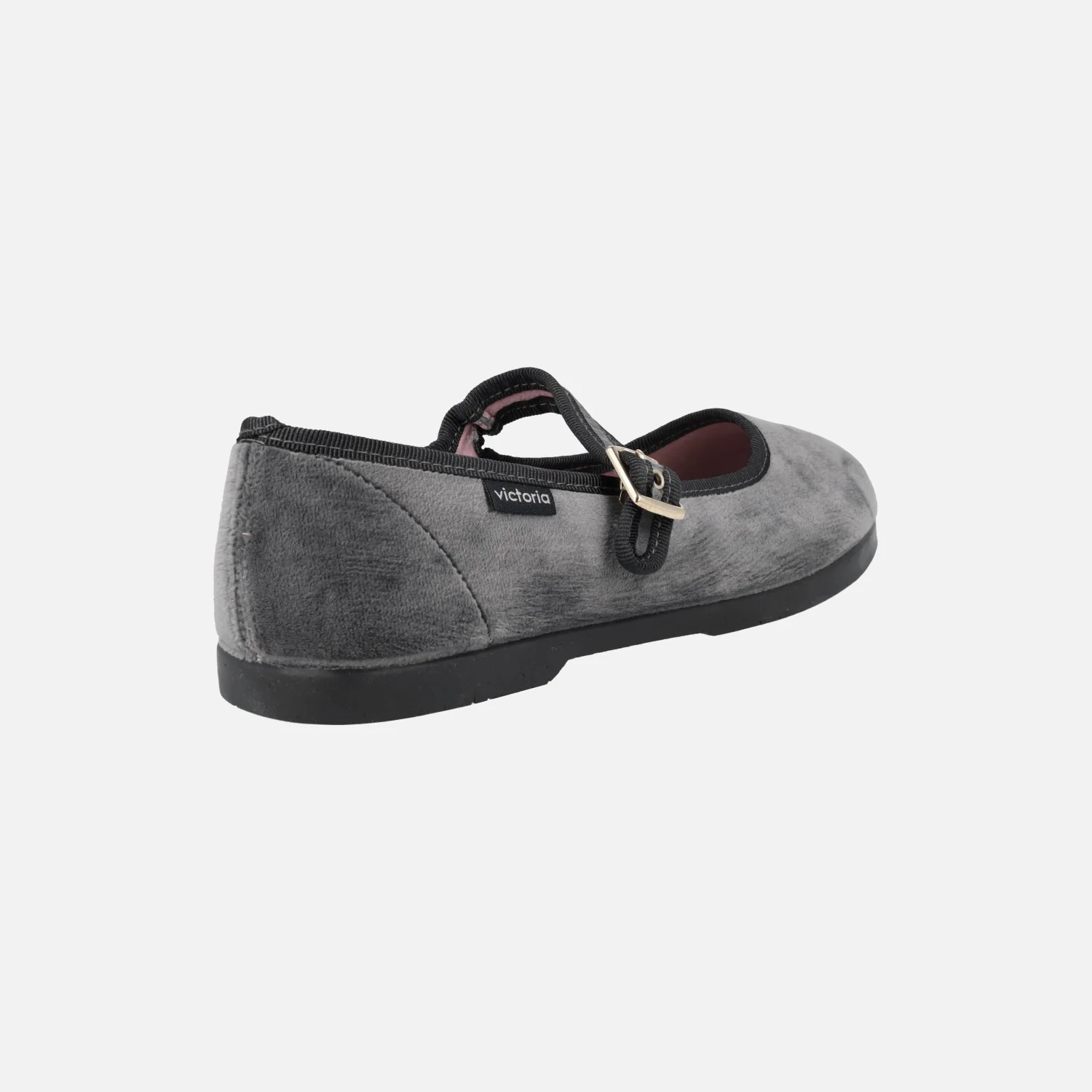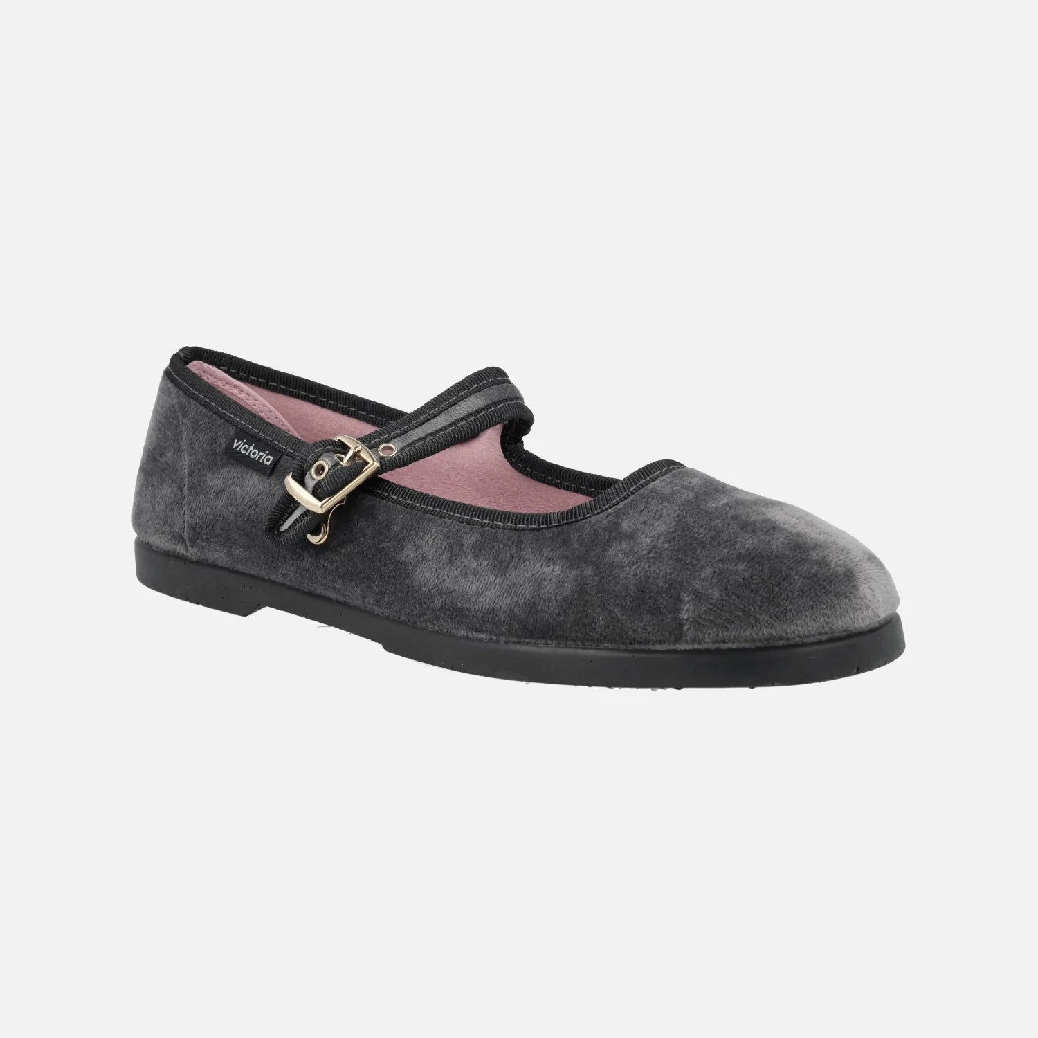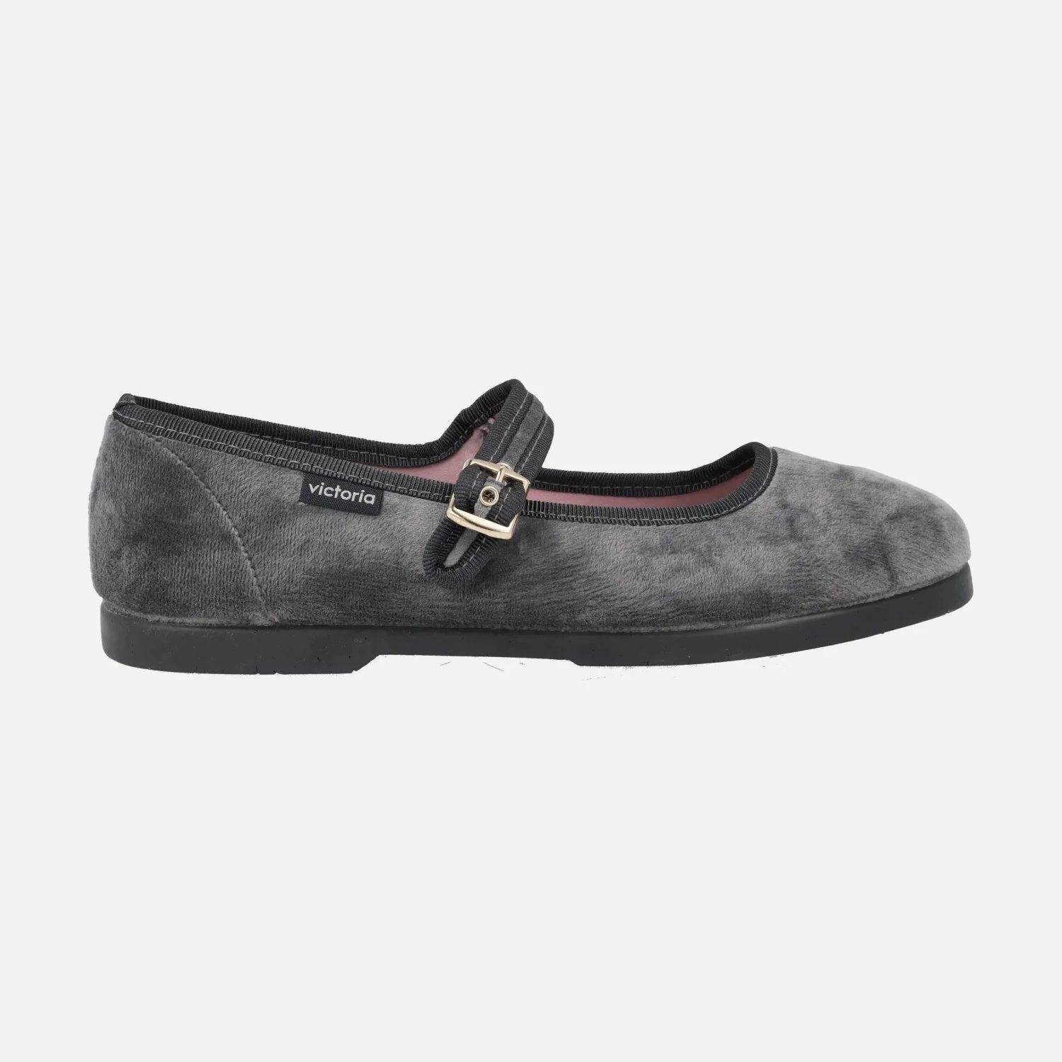 Bailarinas para mujer Victoria Gong-Fu 1080111. Merceditas, con tira al empeine y cierre de hebilla, elaboradas en tejido terciopelo y disponibles en negro, burdeos y gris. Interiores de microfibra. Suela de caucho vulcanizado, de 1,5 cms de altura trasera.