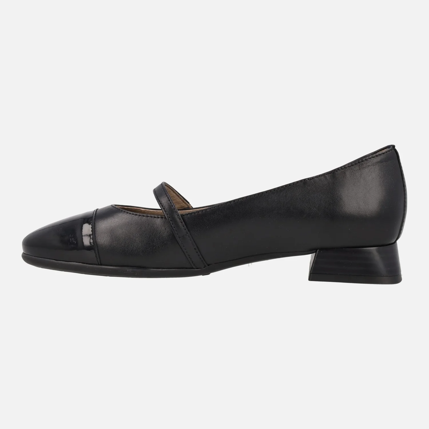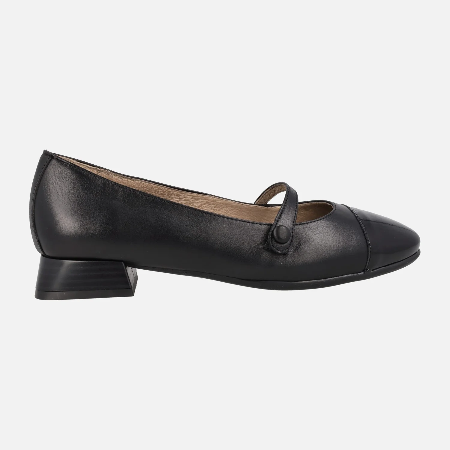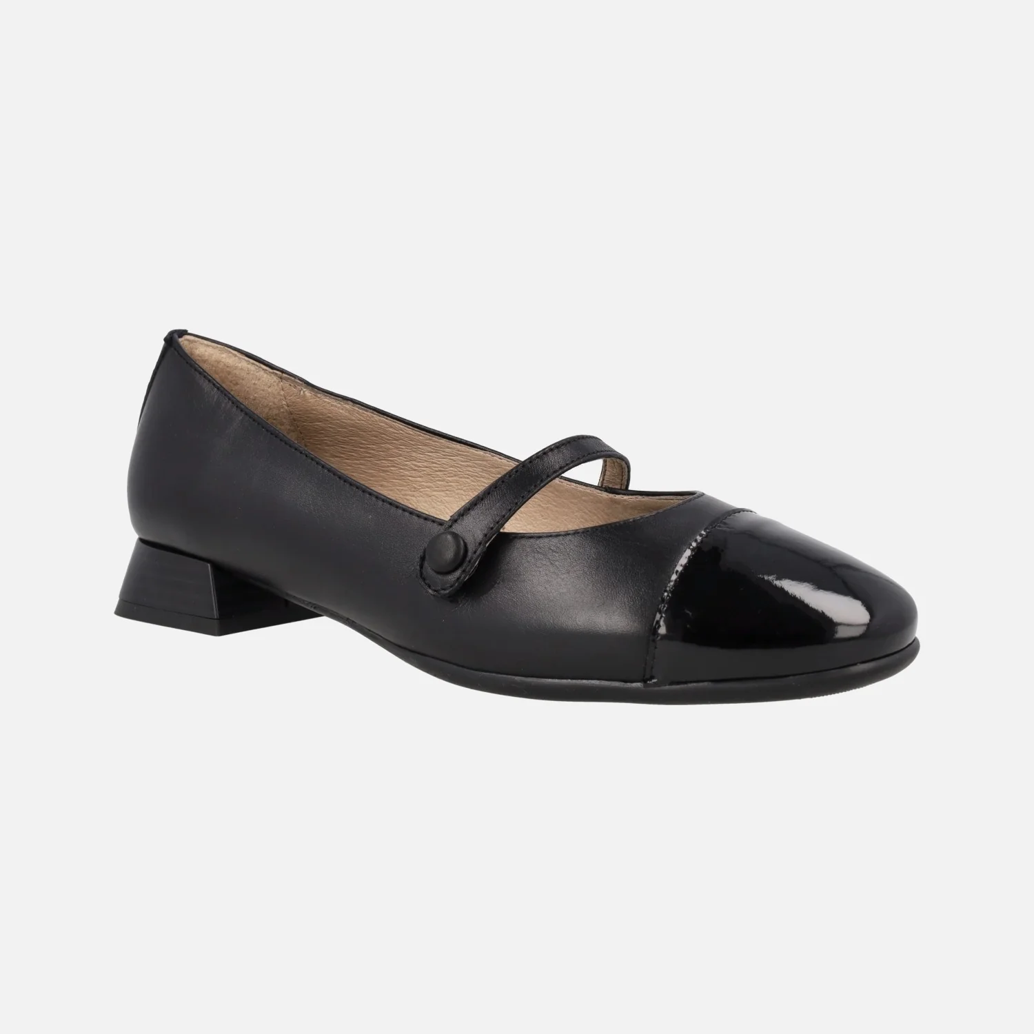 Bailarinas negras de piel estilo merceditas de la marca Lince, modelo 45705 Negro. Bailarinas de piel con puntera contrastada en charol. Tira cruzando el empeine, con broche metálico. Interiores forrados de piel. Tacones bajos, con 2,5 cms de altura.