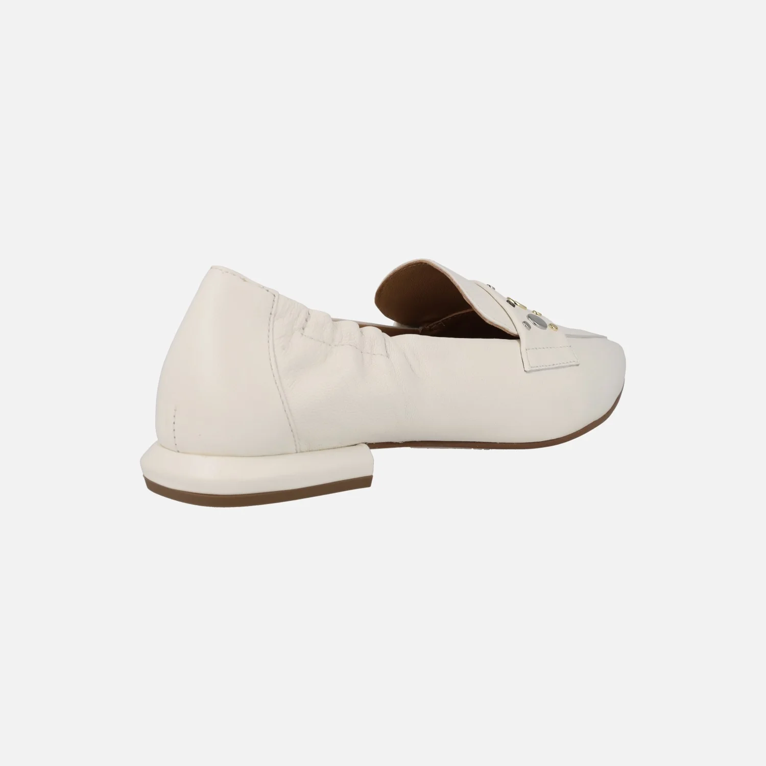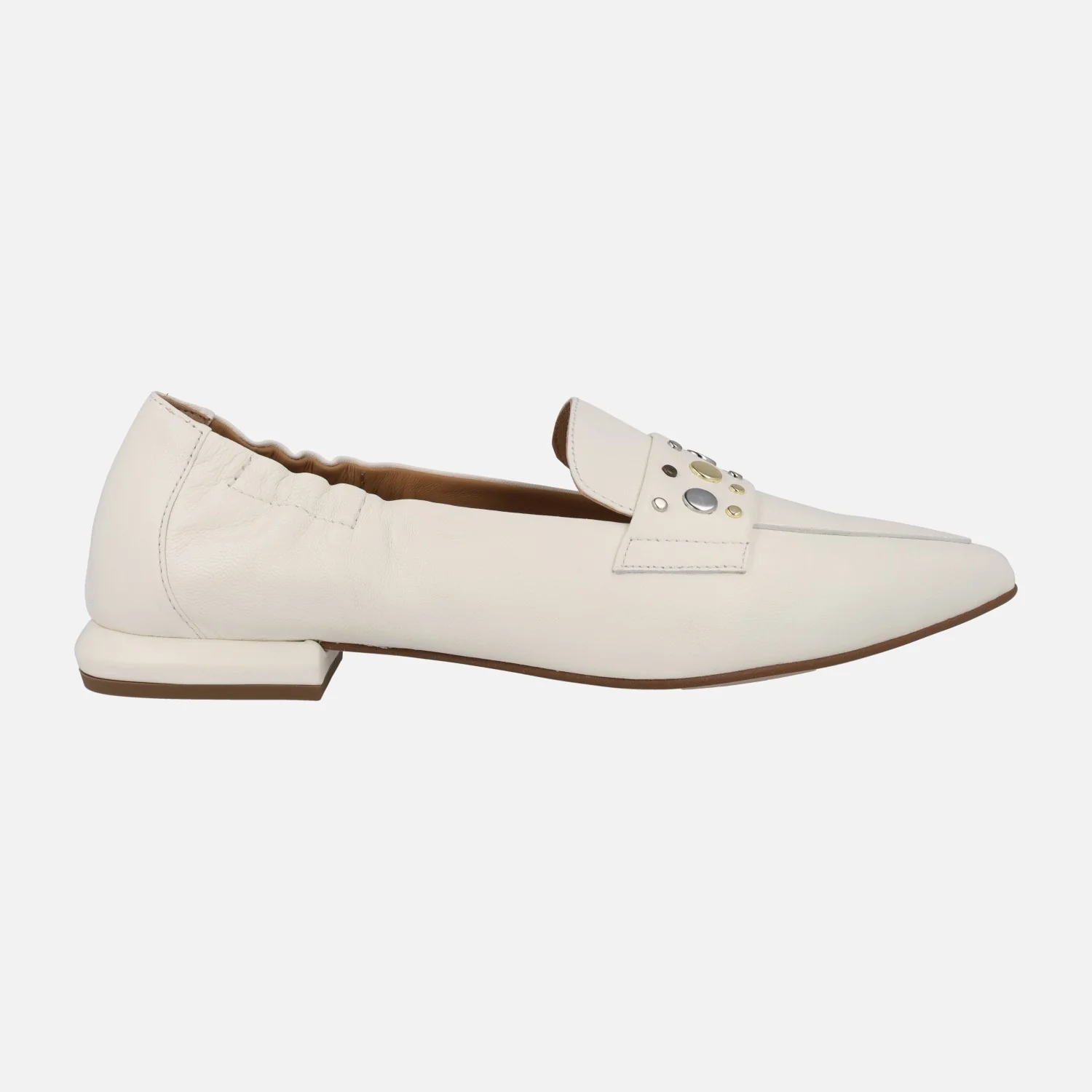Elegantes mocasines de la nueva colección Pedro Miralles modelo 14479 Panna. Mocasines elaborados en piel, en color blanco roto (crudo), con detalle de tachas metálicas en oro y plata en la pala. Elásticos en el talón para una mejor sujeción. Forro y planta de piel. Mocasines planos, de apenas 1,5 cms de tacón. Made in Spain.