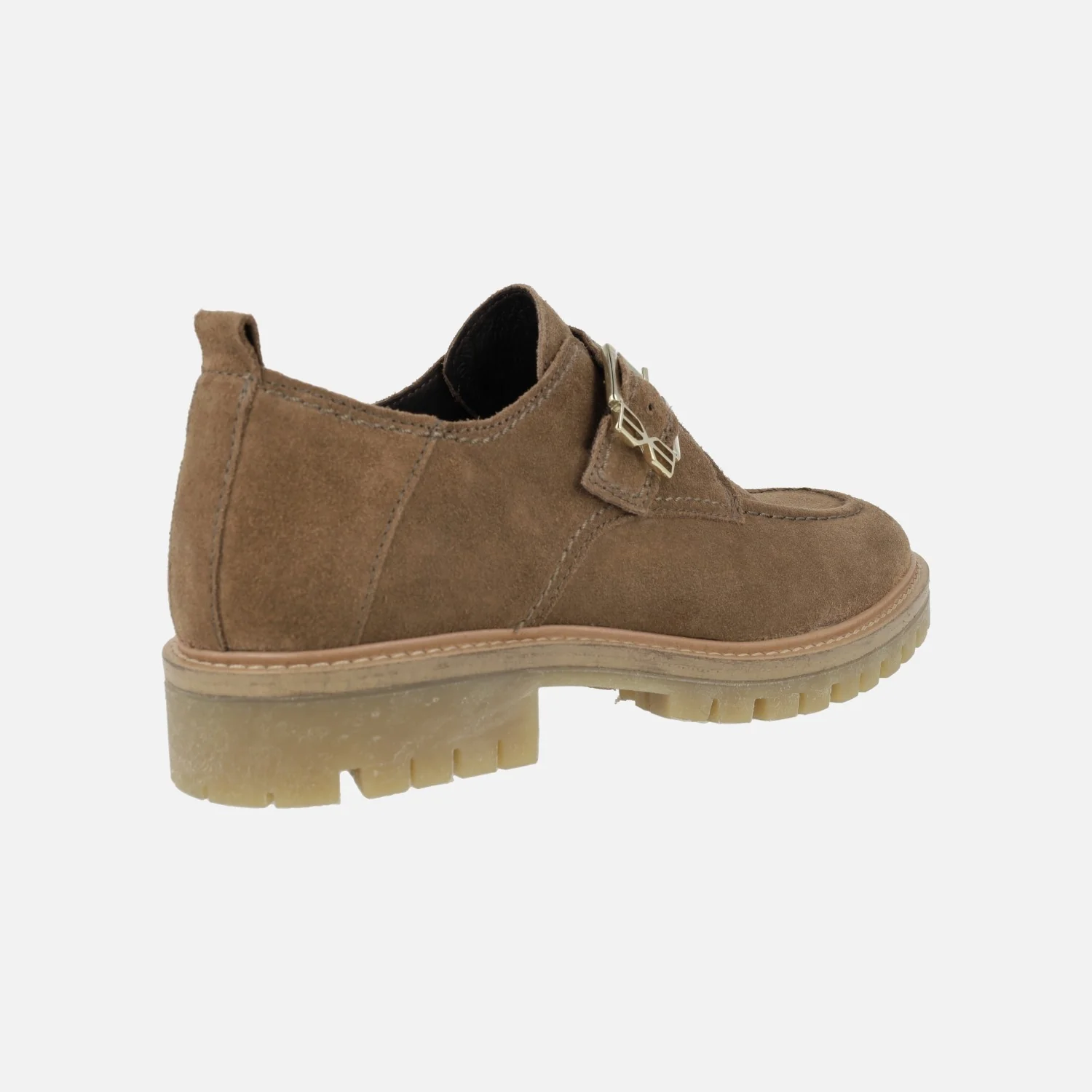 Zapatos para mujer con adorno de hebilla modelo Cataleya taupe de la marca Vexed. Zapatos elaborados en piel serraje color camel/taupe con cierre de hebilla metálica dorada. Forro y planta de piel. Piso de goma, con una altura trasera de 3,5 cms (2 cms parte delantera).