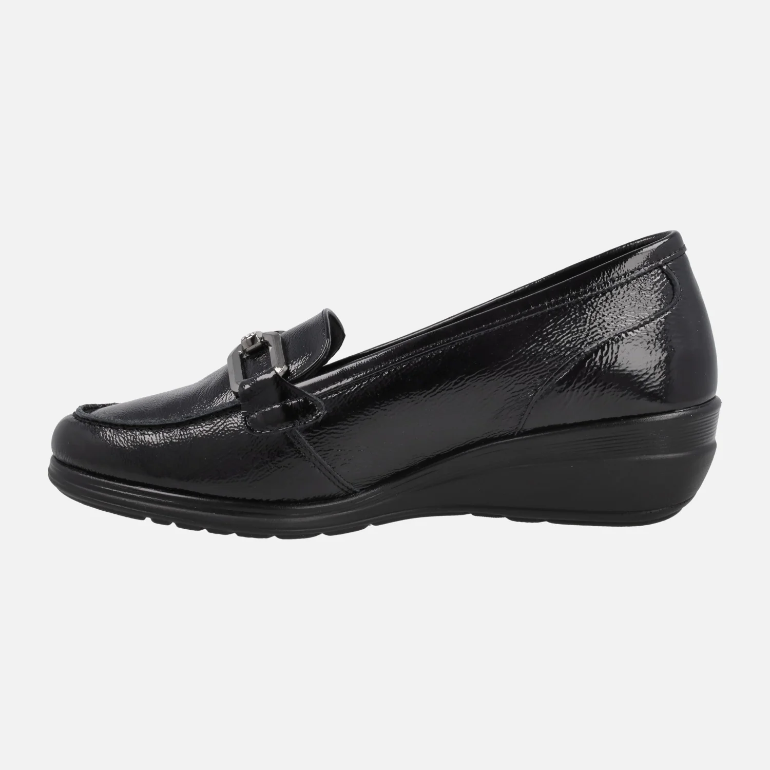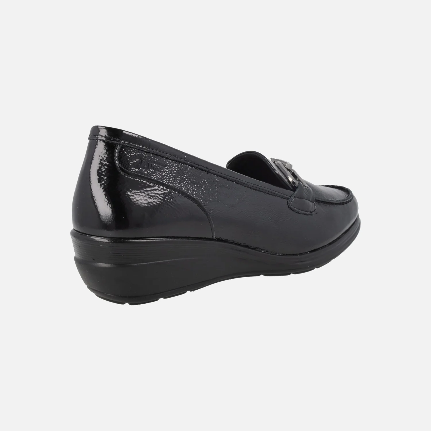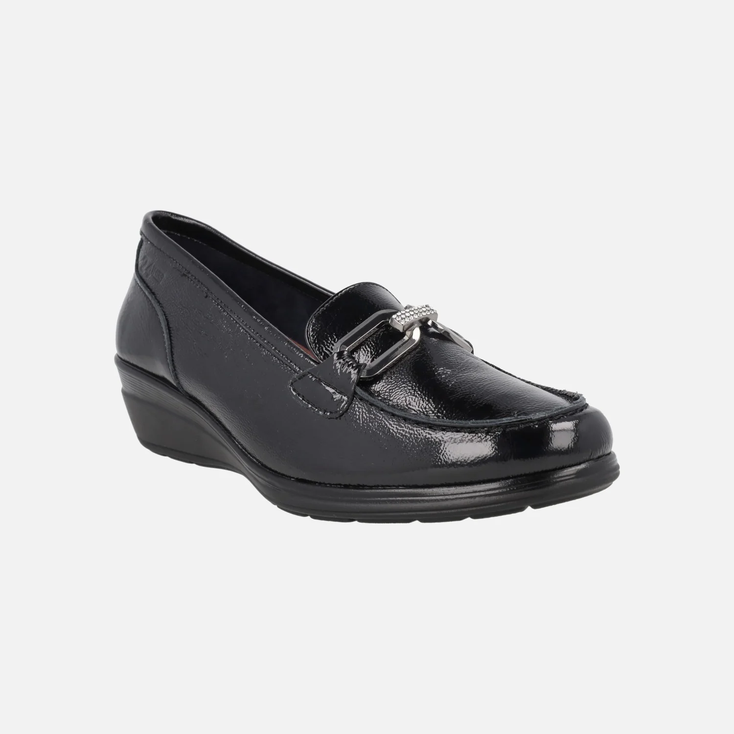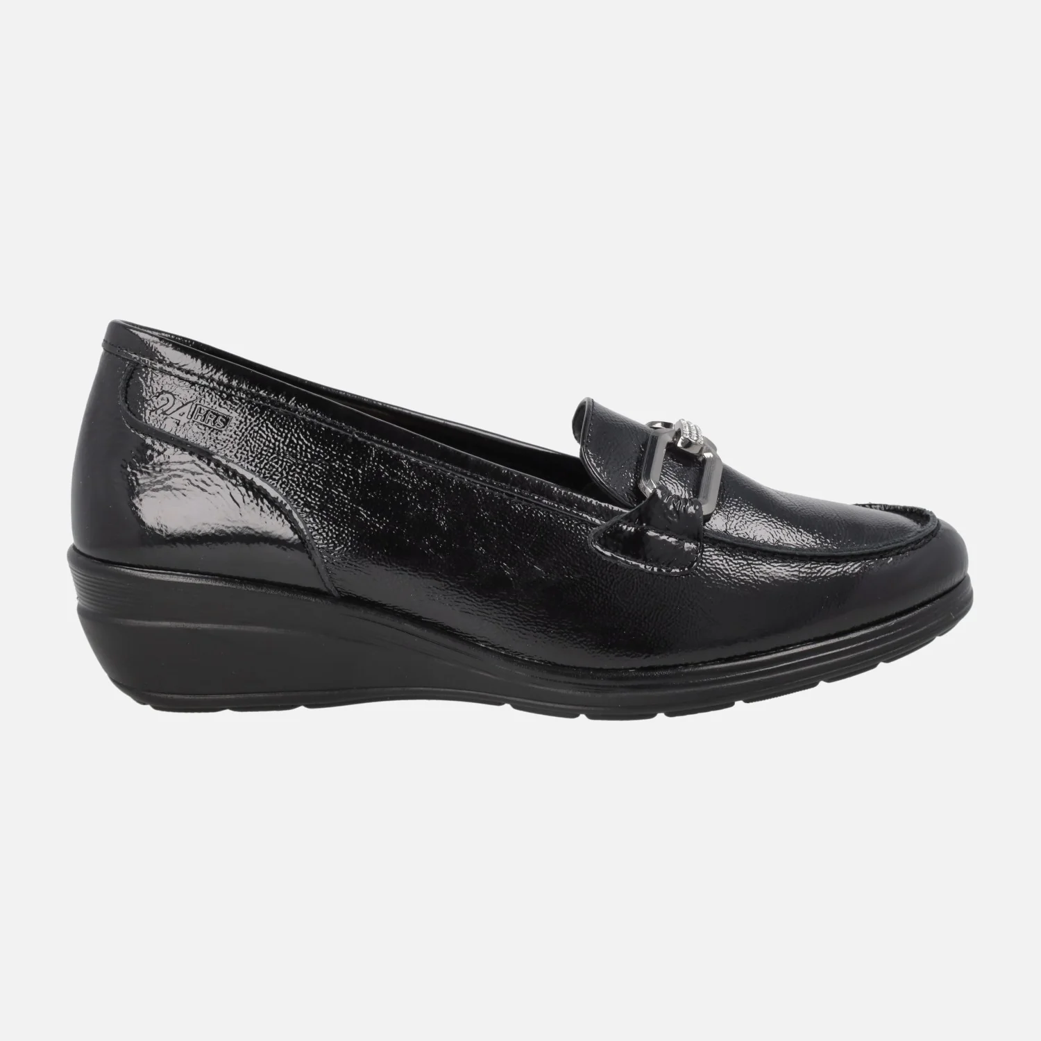 Mocasines confort para mujer de la marca española 24 Horas, modelo 26558 I5Palak negro. Mocasines elaborados en charol negro, con adorno de cadena metálica plateada en el empeine (también lleva una pieza con brillantitos). Forro y planta de piel, plantillas extraíbles. Cuña baja de goma, de 4 cms de altura trasera (1,5 cm parte delantera).