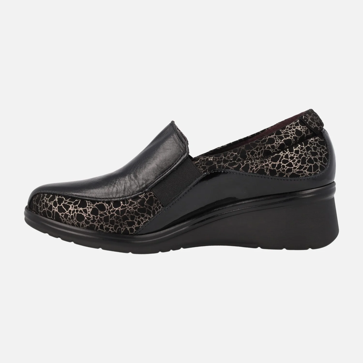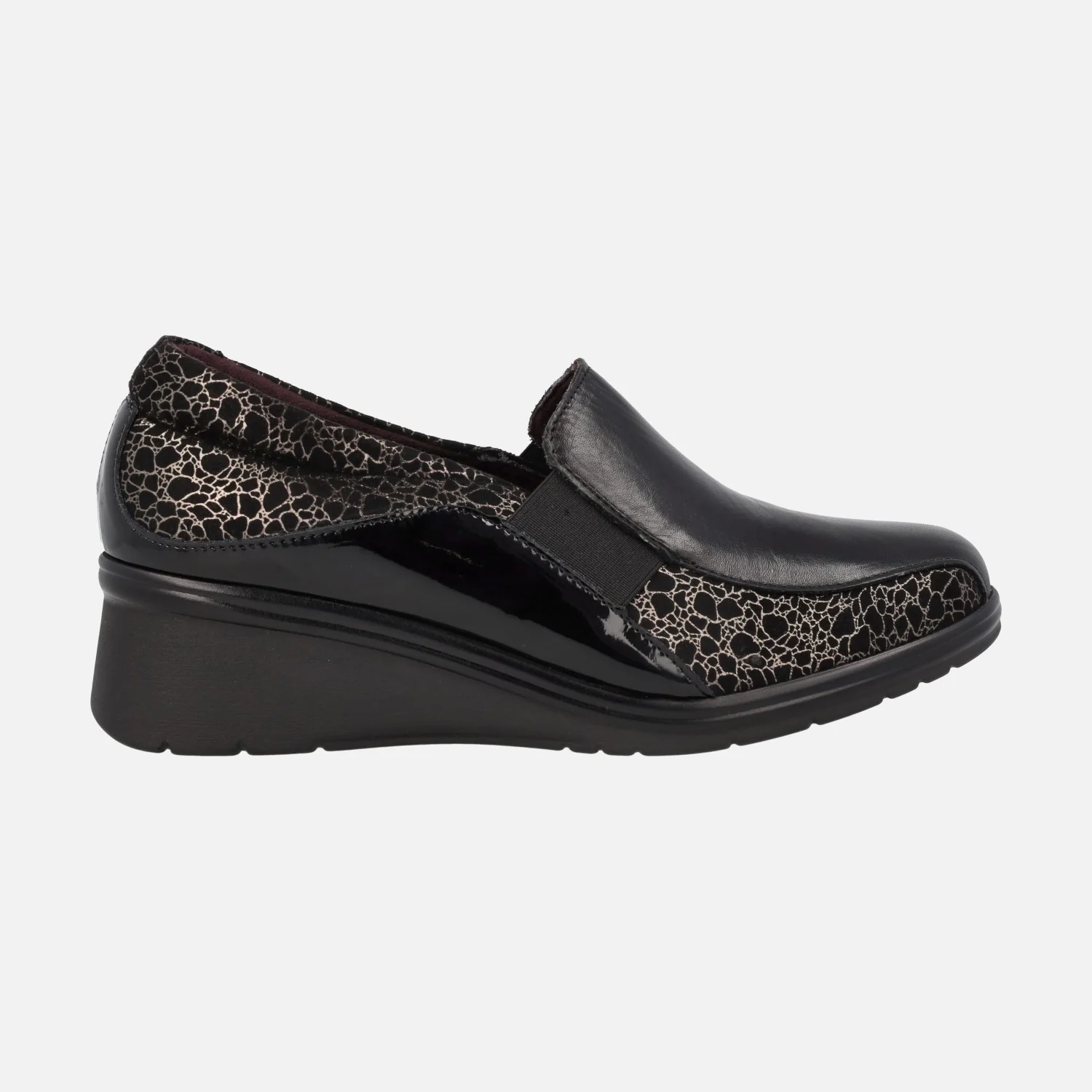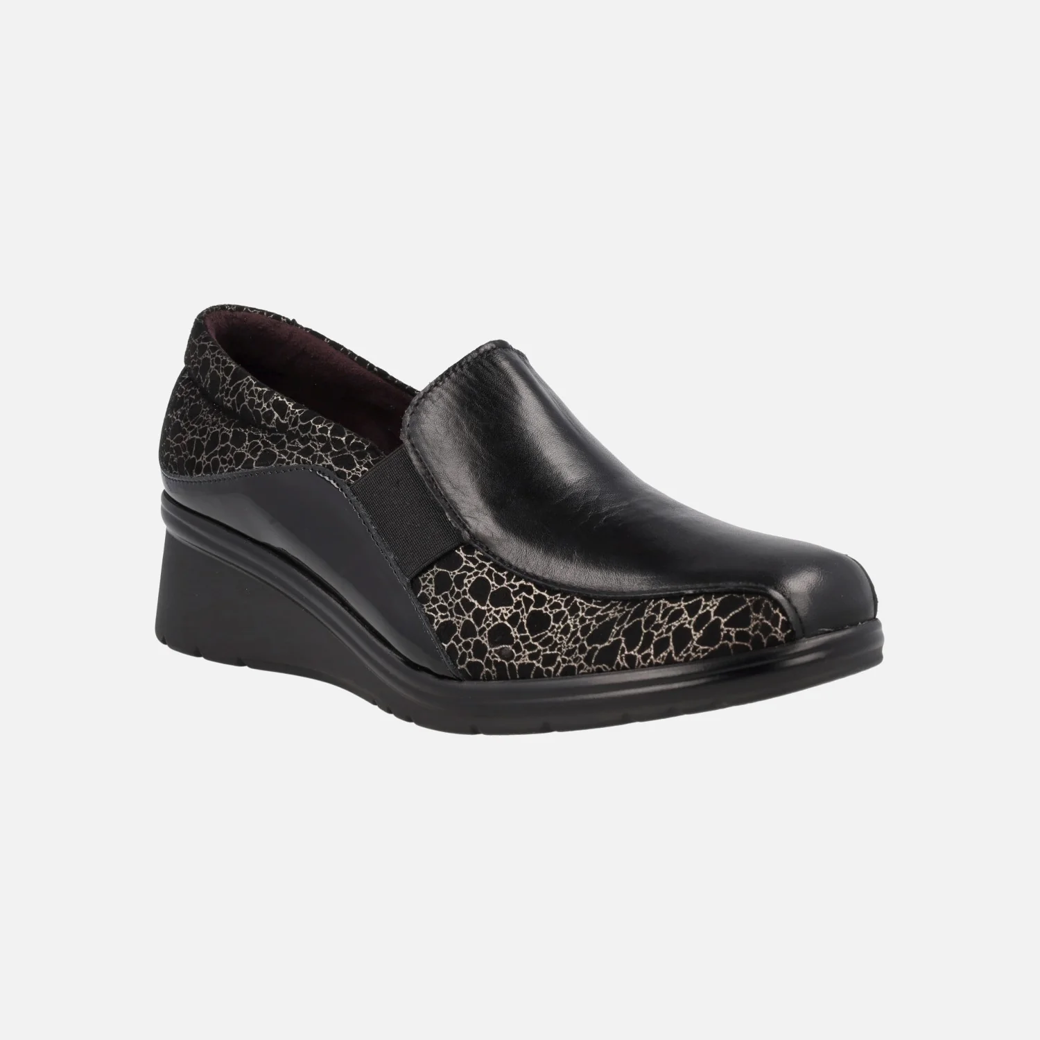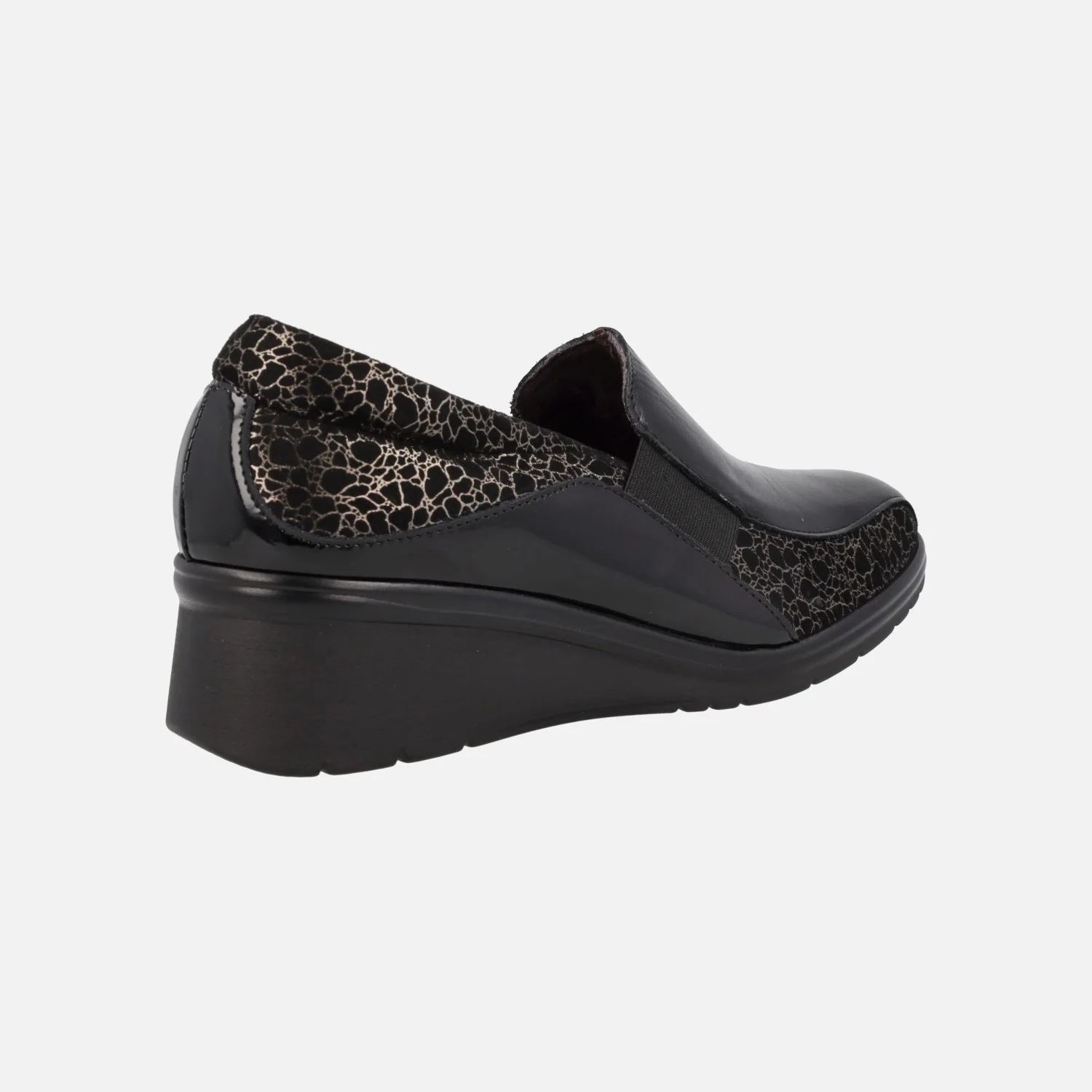 Mocasines para mujer de la marca Pitillos, modelo 5323 Negro. Mocasines negros elaborados en piel y charol, con grabado hecho en metalizado dorado. Elásticos laterales para un mayor calce y sujeción. Interior textil, plantillas extraíbles. Cuña de goma de altura media, muy ligera, con 4,5 cms de altura en la parte trasera (1 cm parte delantera). Made in Spain.