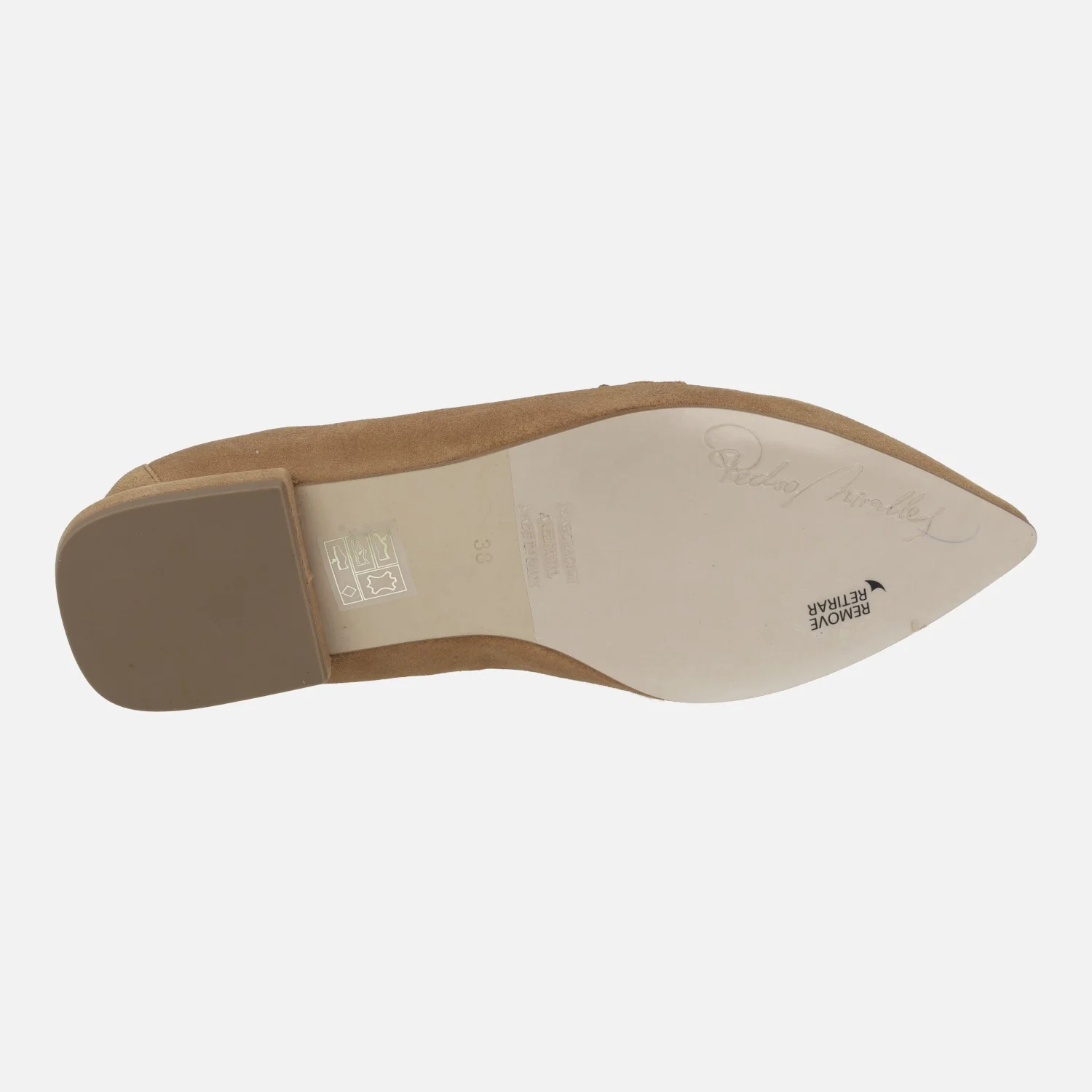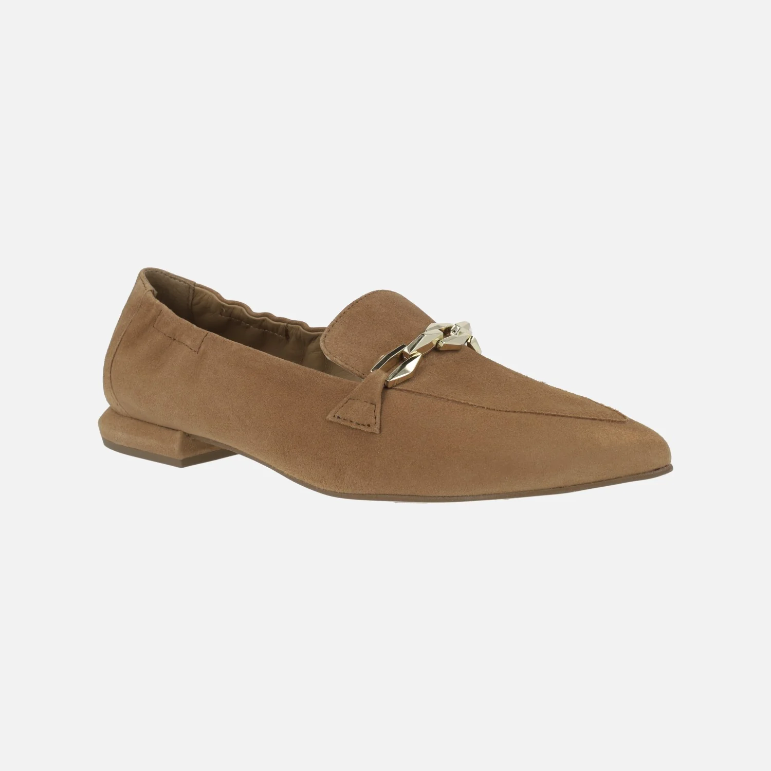 Mocasines de ante Pedro Miralles 14477 cuero. Mocasines de horma ligeramente afilada, elaborados en ante cuero con adorno metálico dorado de cadena en la pala. Forro y planta de piel. Suela de caucho, con tacones de apenas 2 cms de altura. Made in Spain.