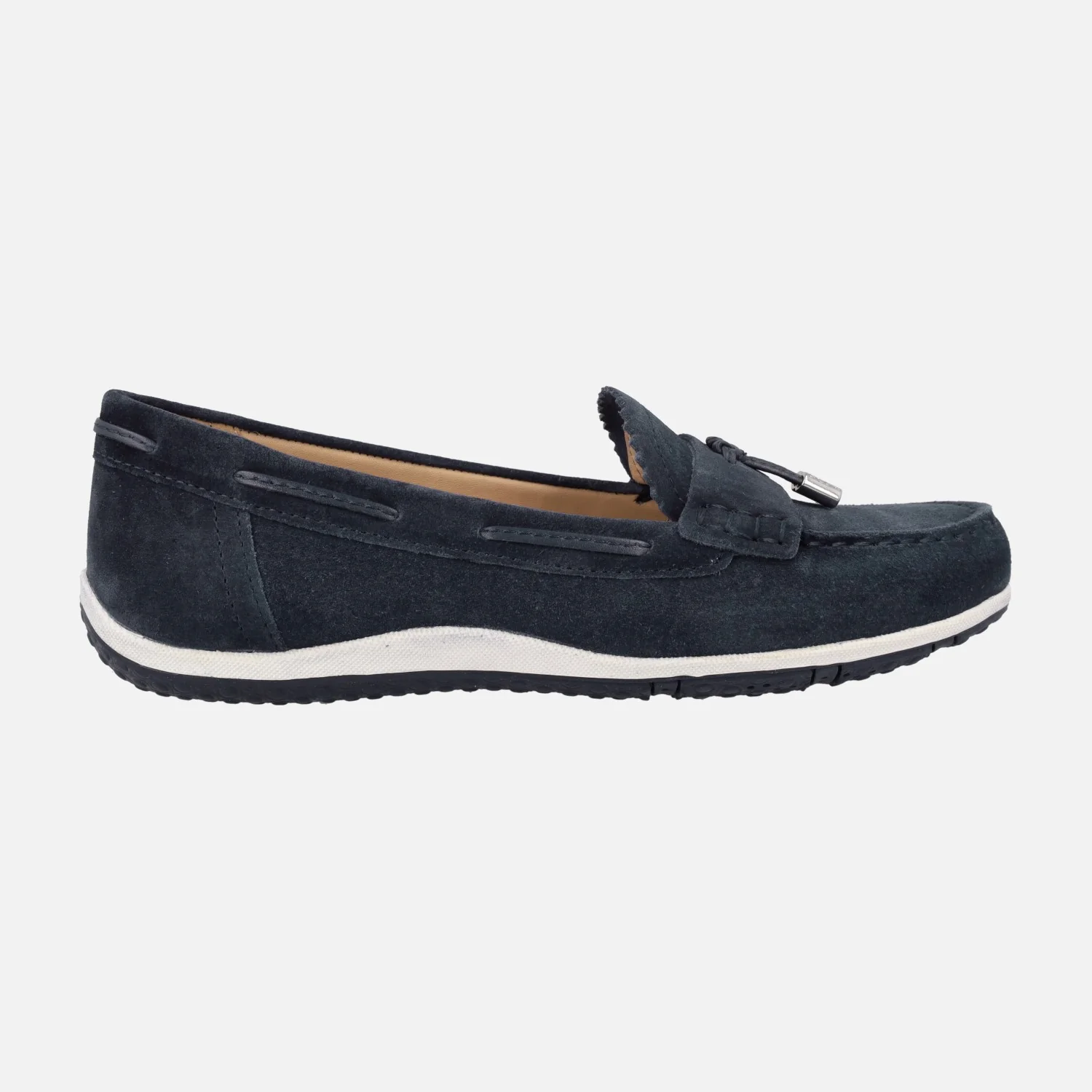 Mocasines con inspiración naútica para mujer de la italiana Geox, modelo D35DNA Vega Moc A disponibles en Azul marino NAVY o en camel COGNAC. Mocasines de ante, con adorno de borlas en la parte superior. Interiores de piel. Piso plano de goma, de apenas 1 cm de altura.