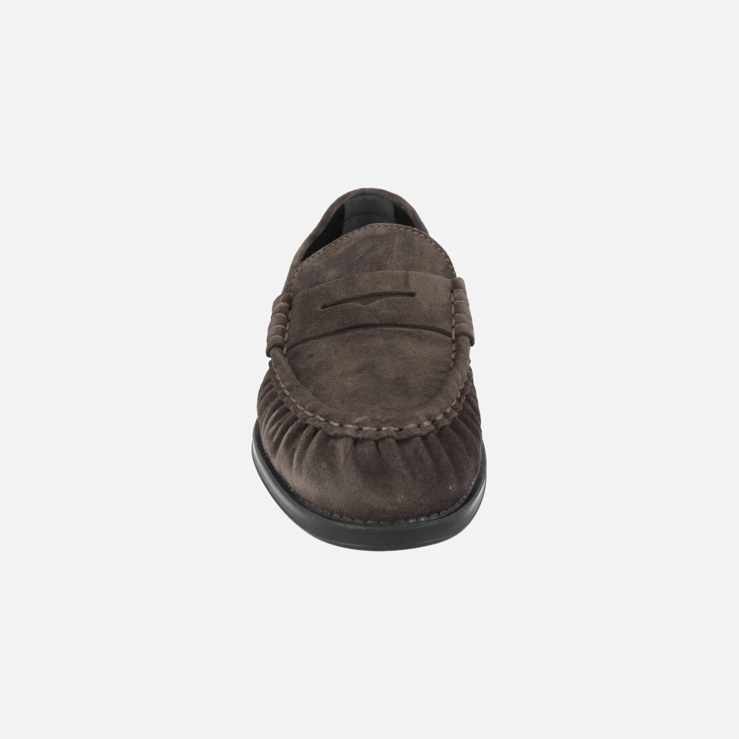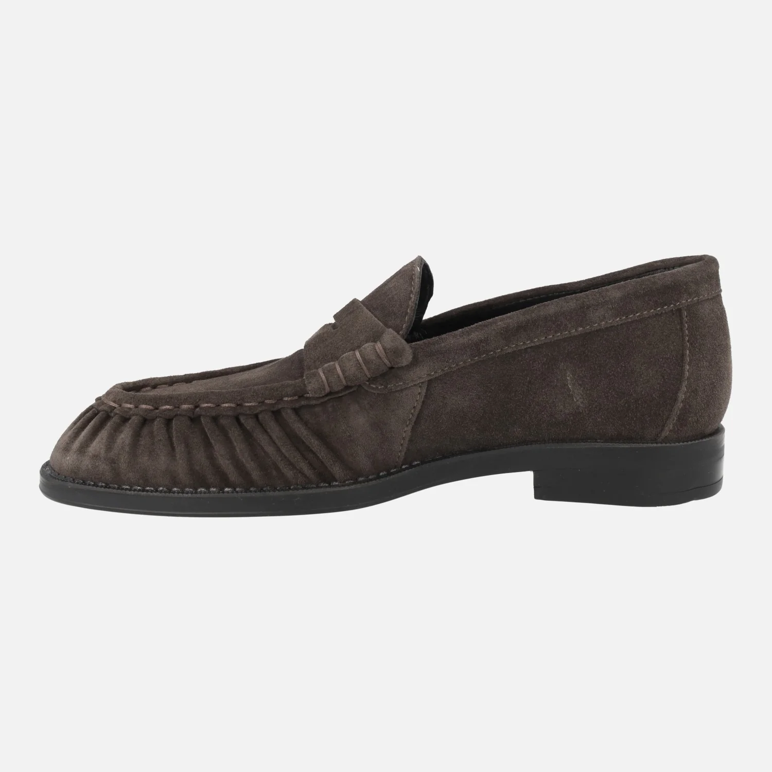 Mocasines para mujer de la marca Alpe modelo Oxford 5328 Baby silk Testa. Mocasines con fruncidos en la parte delantera y adorno de antifaz, elaborados en piel serraje marrón oscuro. Forro y planta de piel. Piso sintético, con 2,5 cm de tacón.