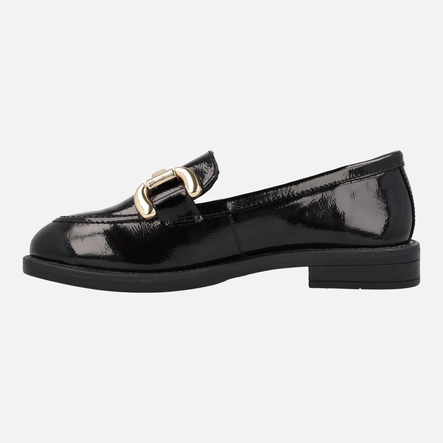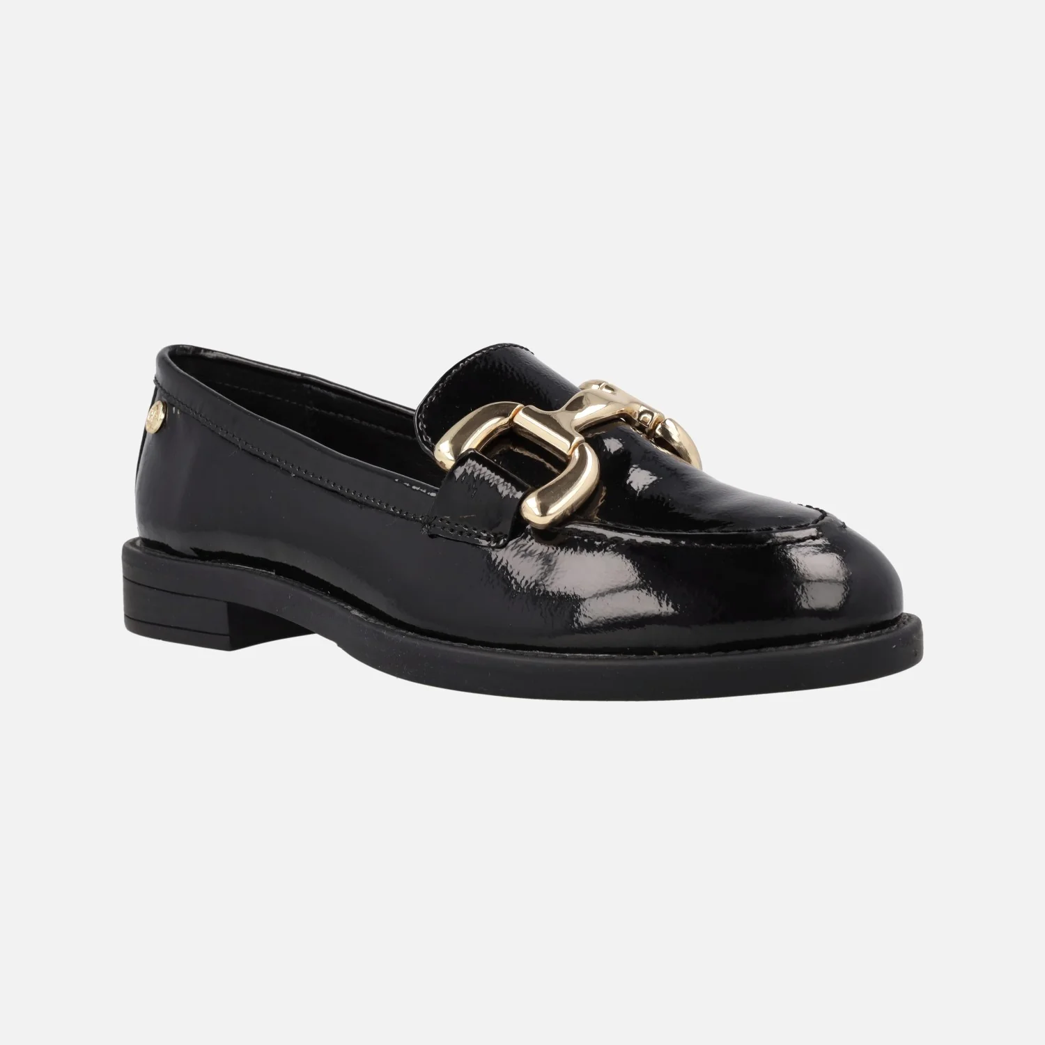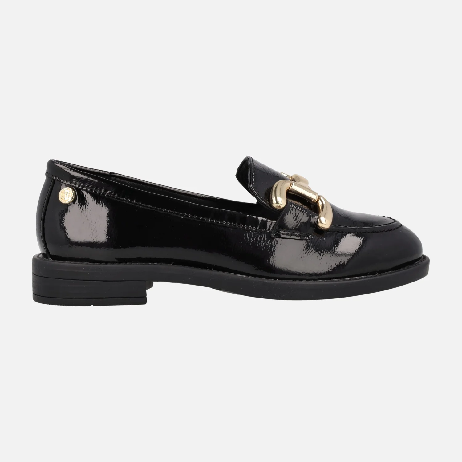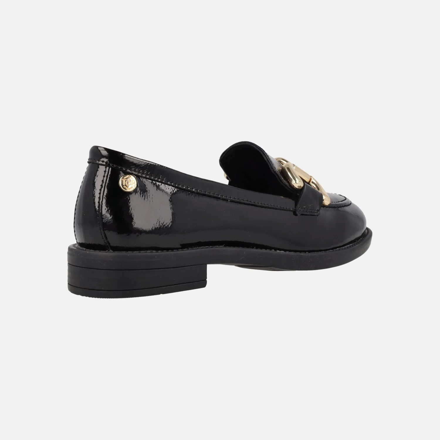 Mocasines negros de charol para mujer de la marca Top3 modelo 23845. Mocasines elaborados en piel charol, con adorno metálico dorado en el copete. Forro y planta de piel. Piso de goma con tacón de 2,5 cms de altura.
