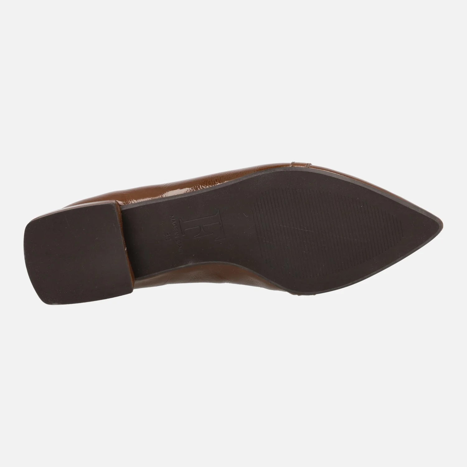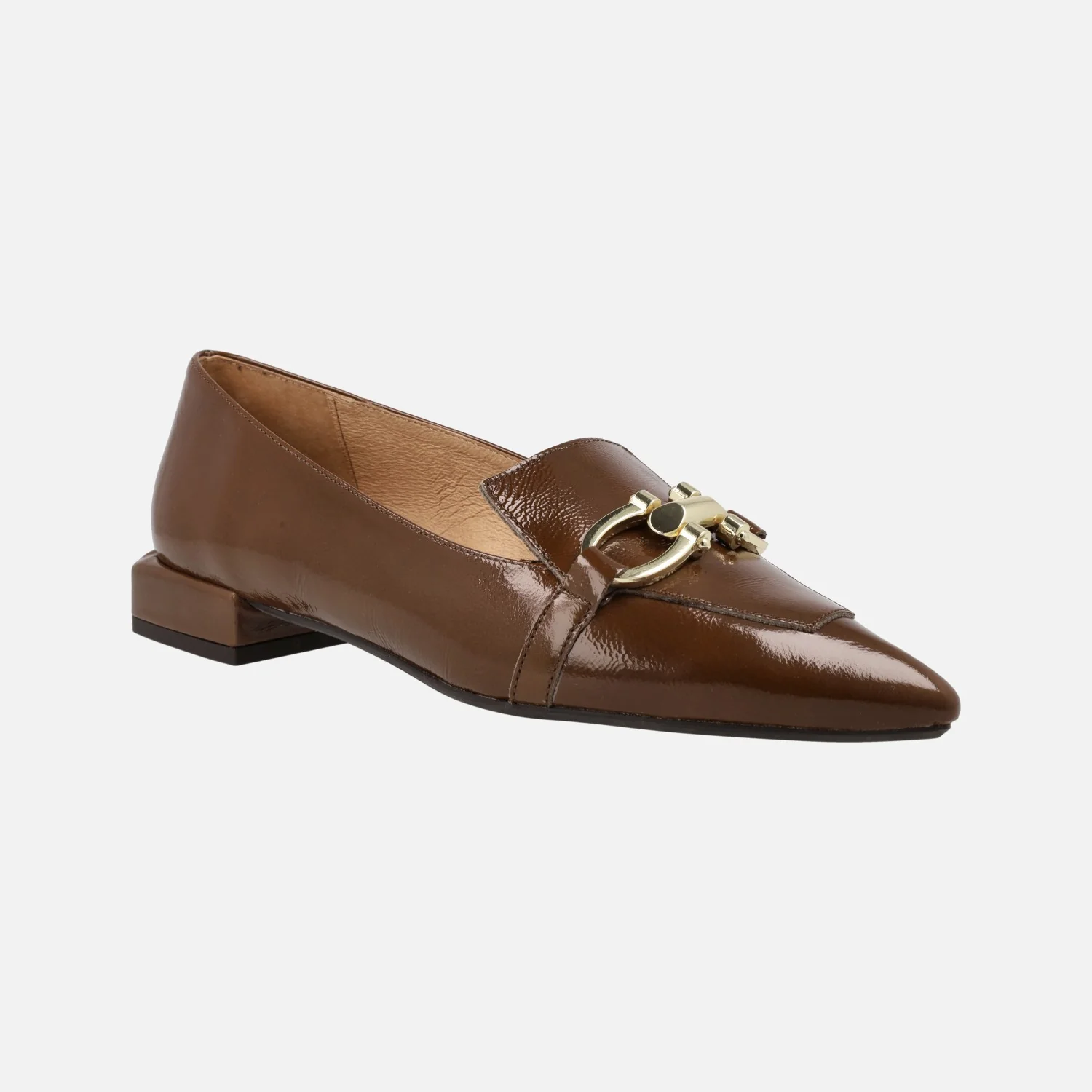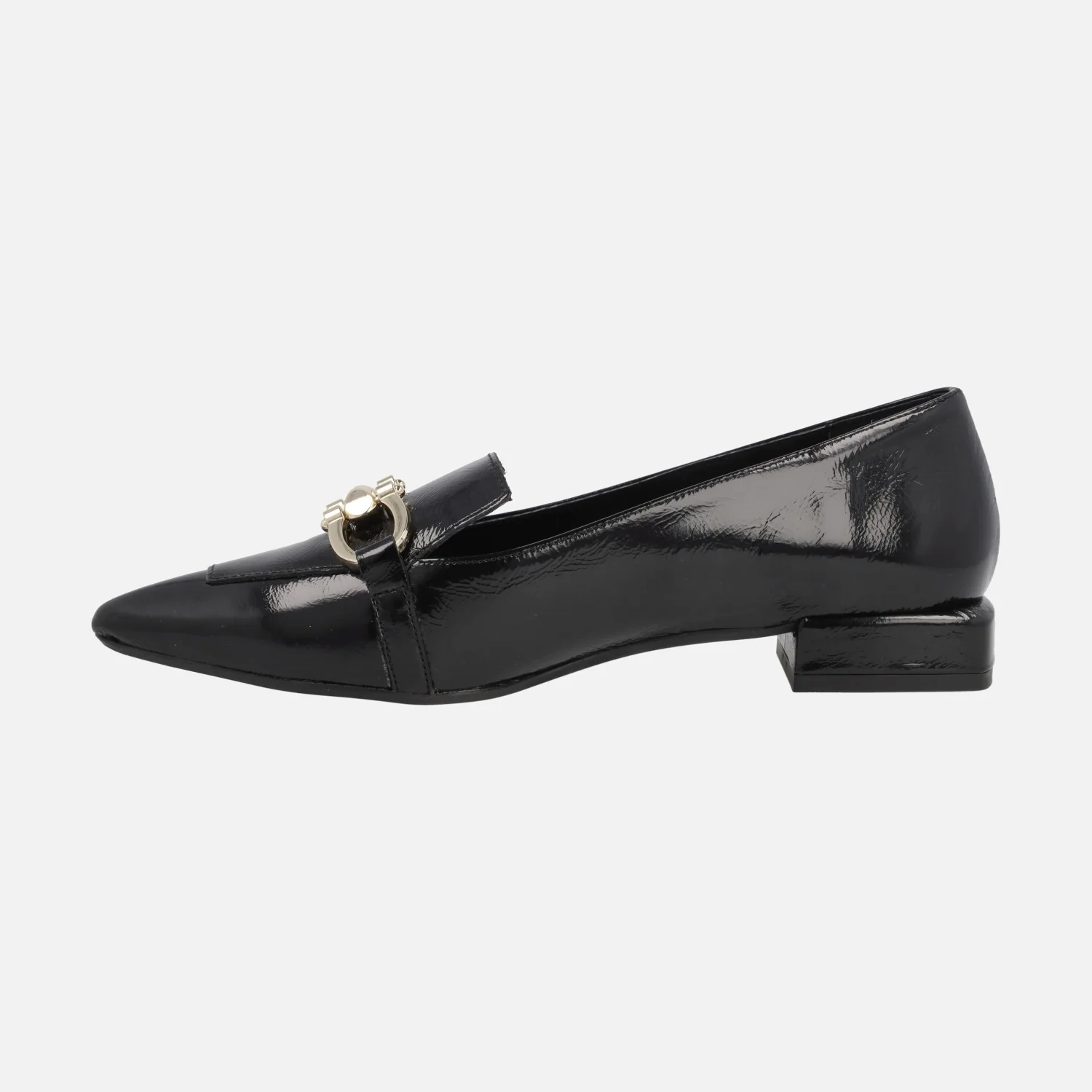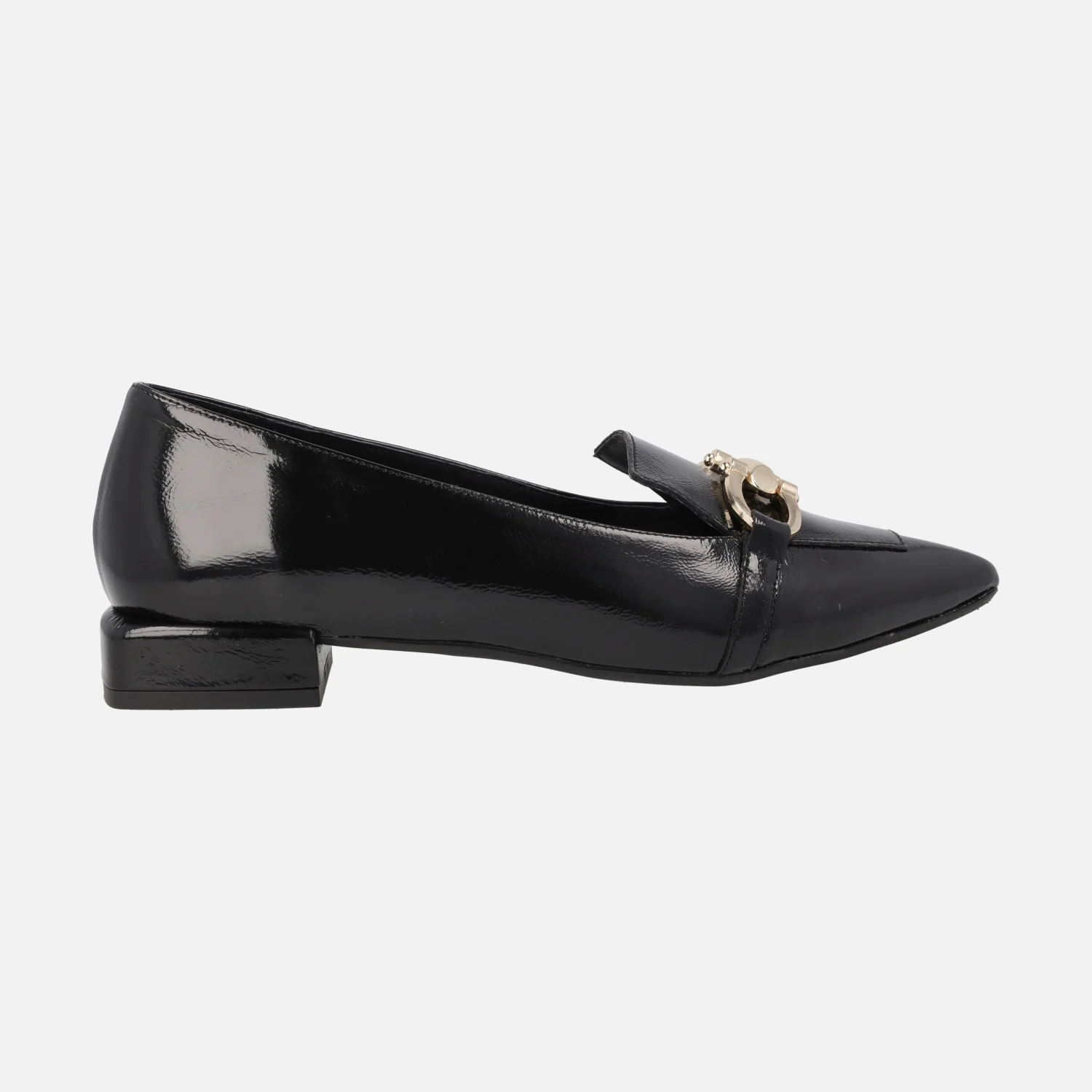 Mocasines para mujer disponibles en Charol Marrón y Negro. Modelo 32691 de Design Frank. Adorno metalico dorado y copete. Forro y plantilla de piel. Tacón forrado en Charol con una altura de 2.5 cms. Made in Spain.