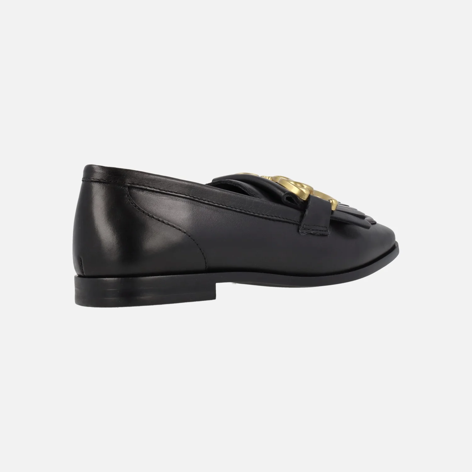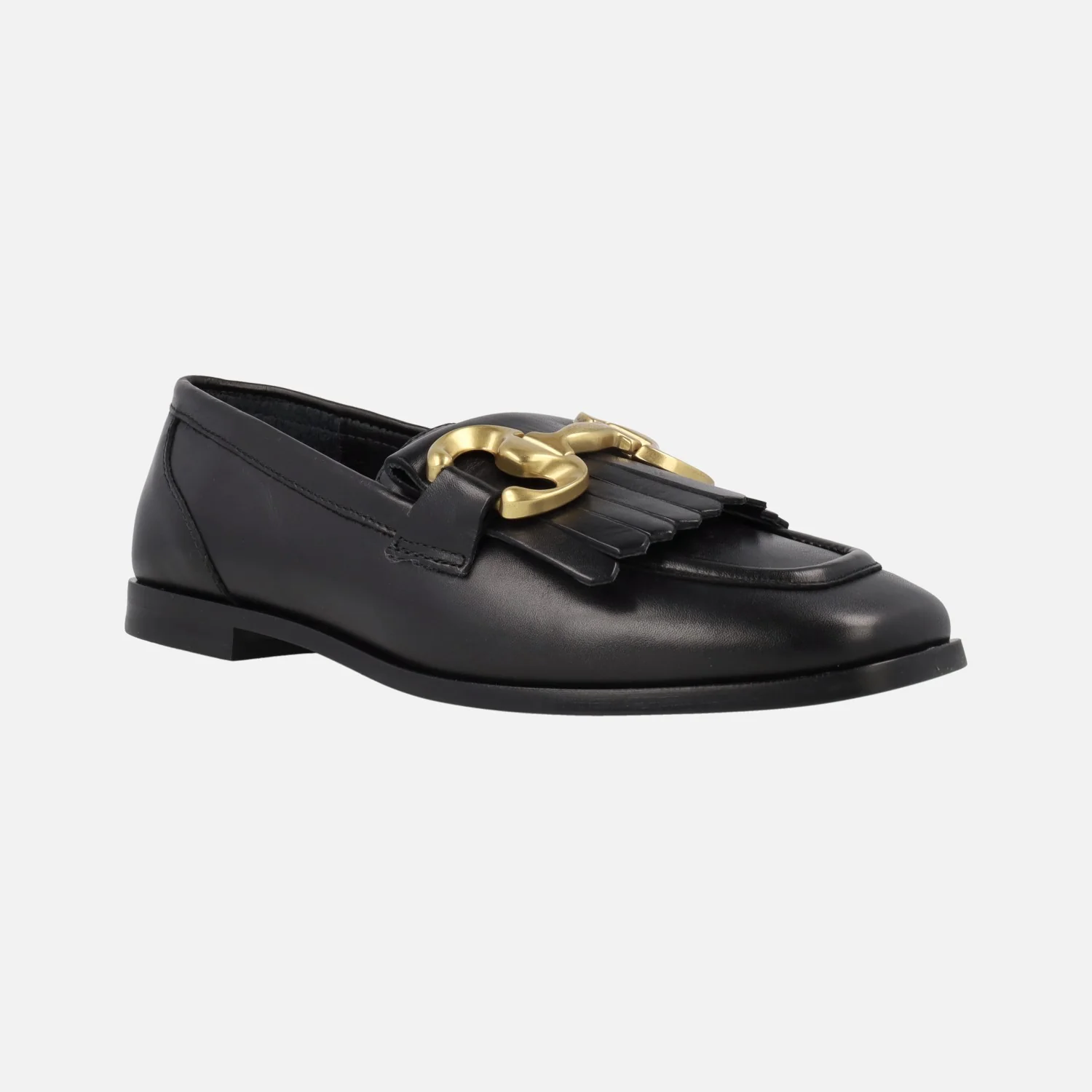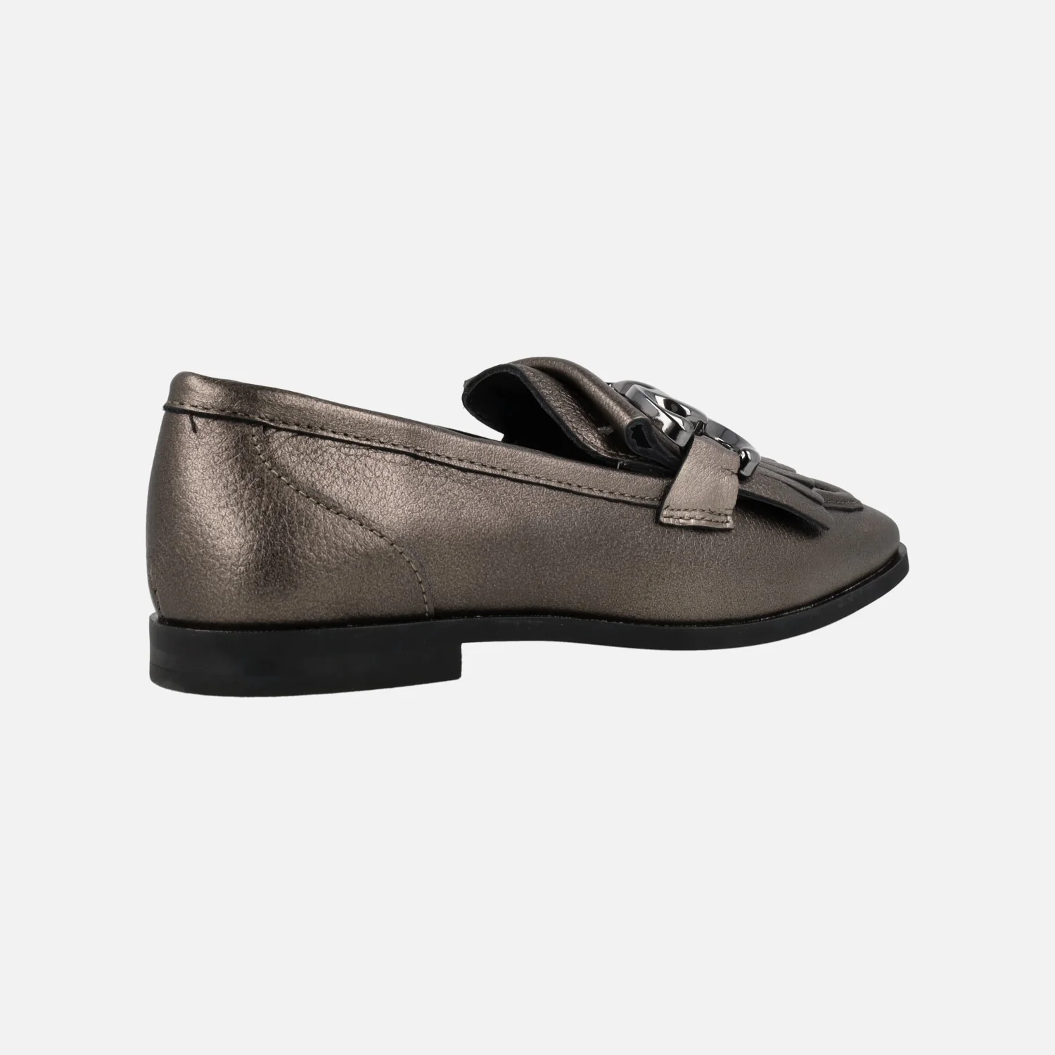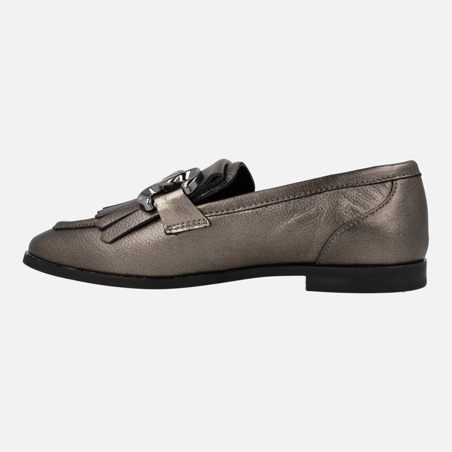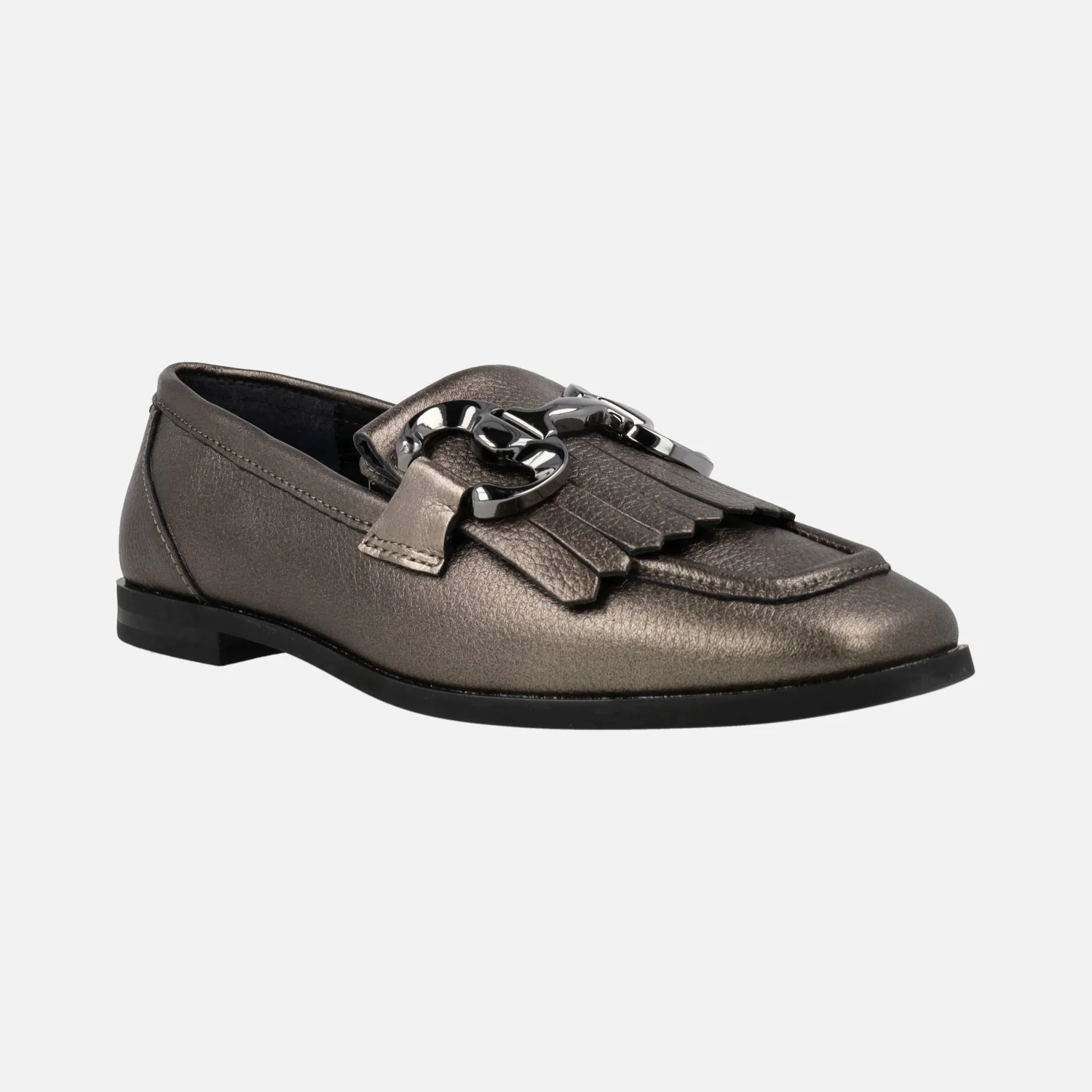 Mocasines Alpe New Roma 2775 en piel lisa negra o metalizada smog (plomo) para mujer. Mocasines elaborados en piel lisa, con copete de flecos y adorno metálico plateado. Interior mixto piel/textil. Piso de goma con 1,5 cms de altura. Made in Spain.
