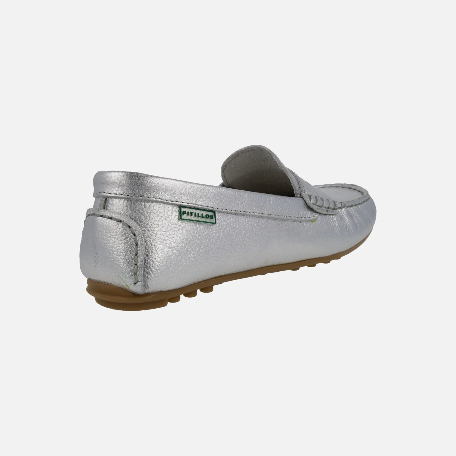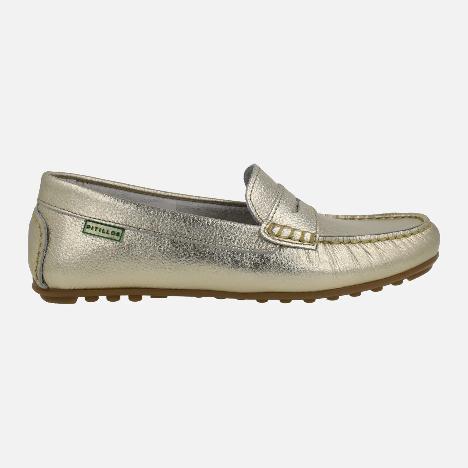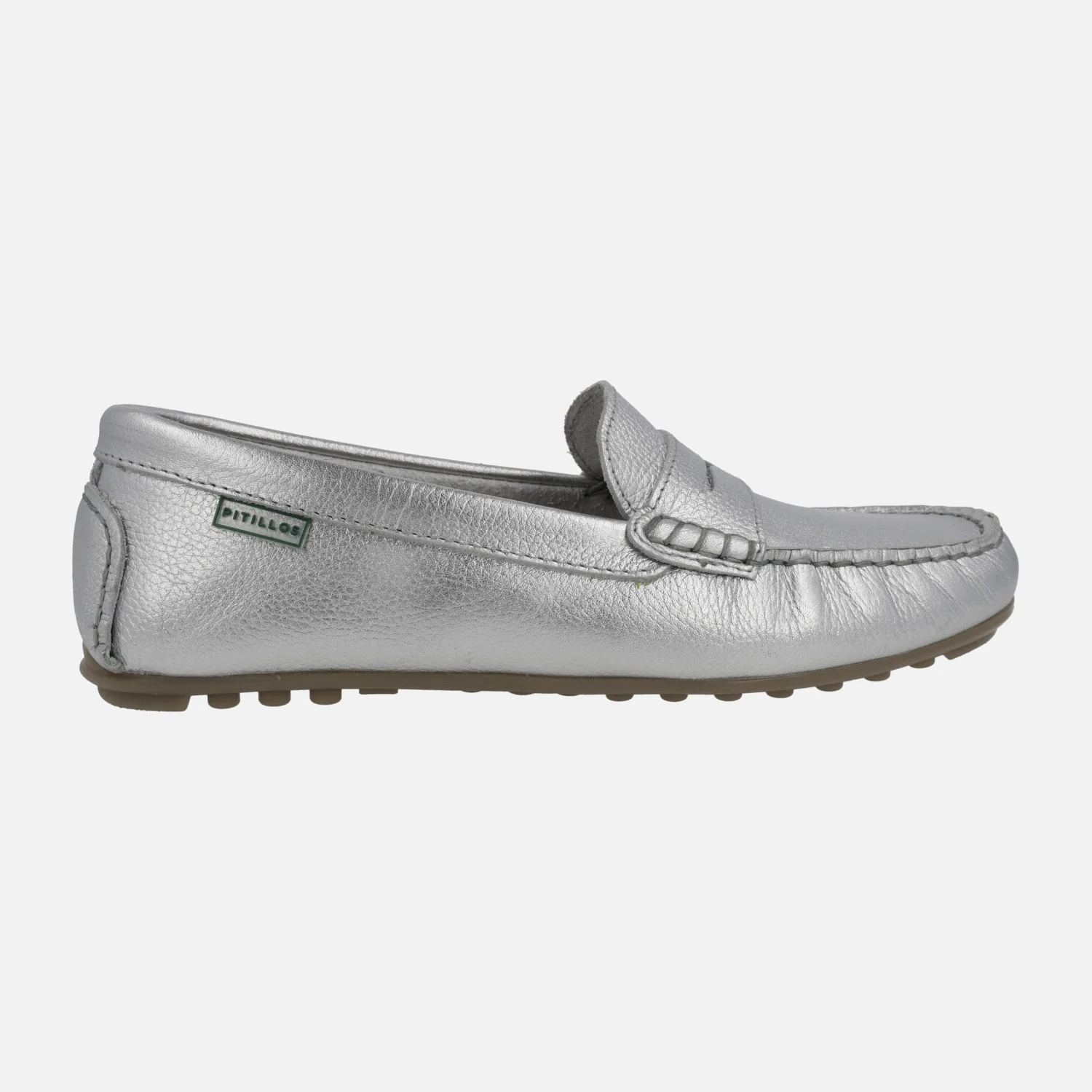 Mocasines para mujer de la línea Silvia Hernandez del grupo Pitillos, modelo 3812, disponible en plata y en oro. Mocasines de piel, con adorno de antifaz y piso plano de goma. Interior y planta de piel. Made in Spain.