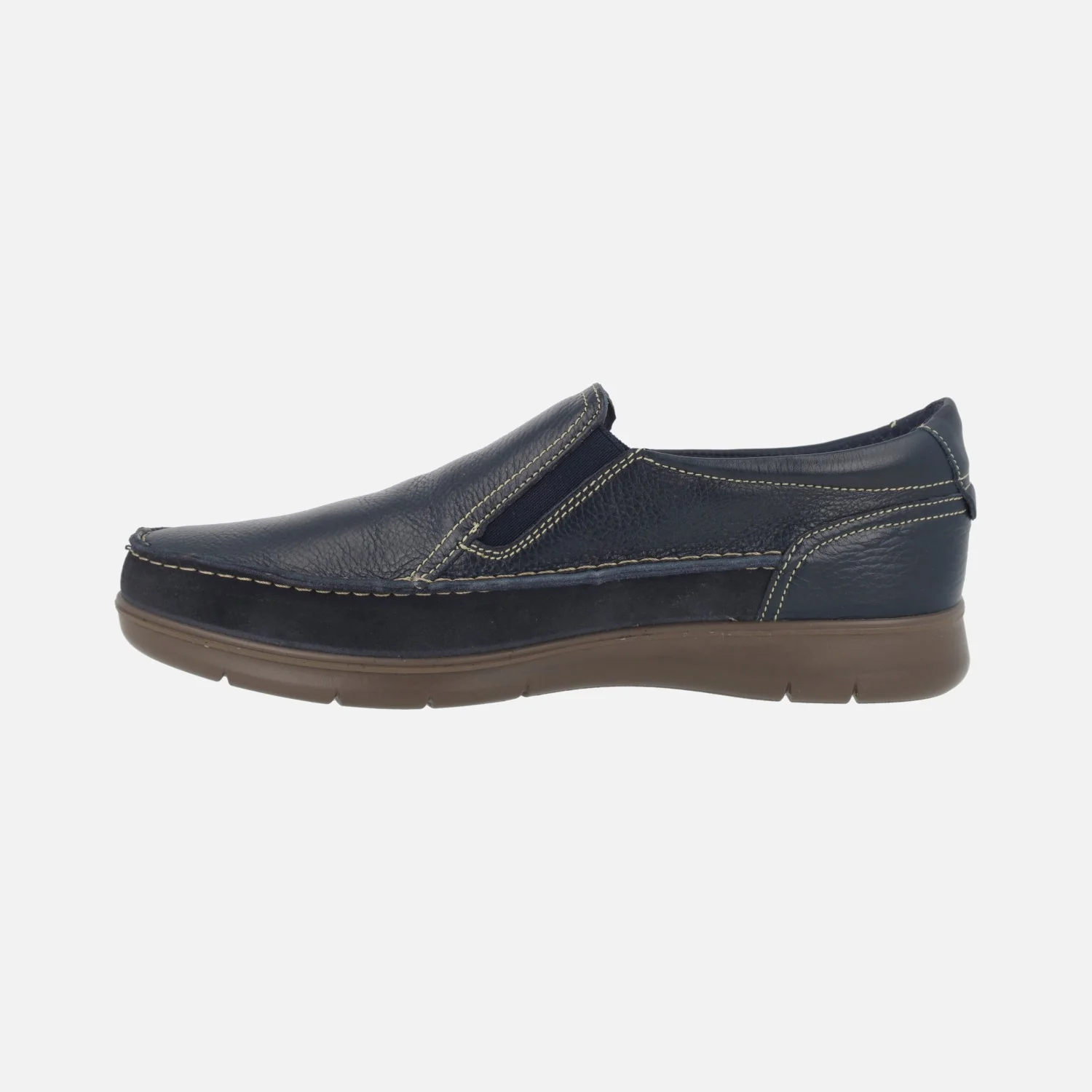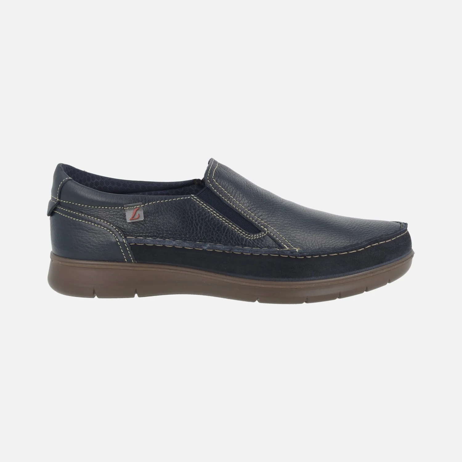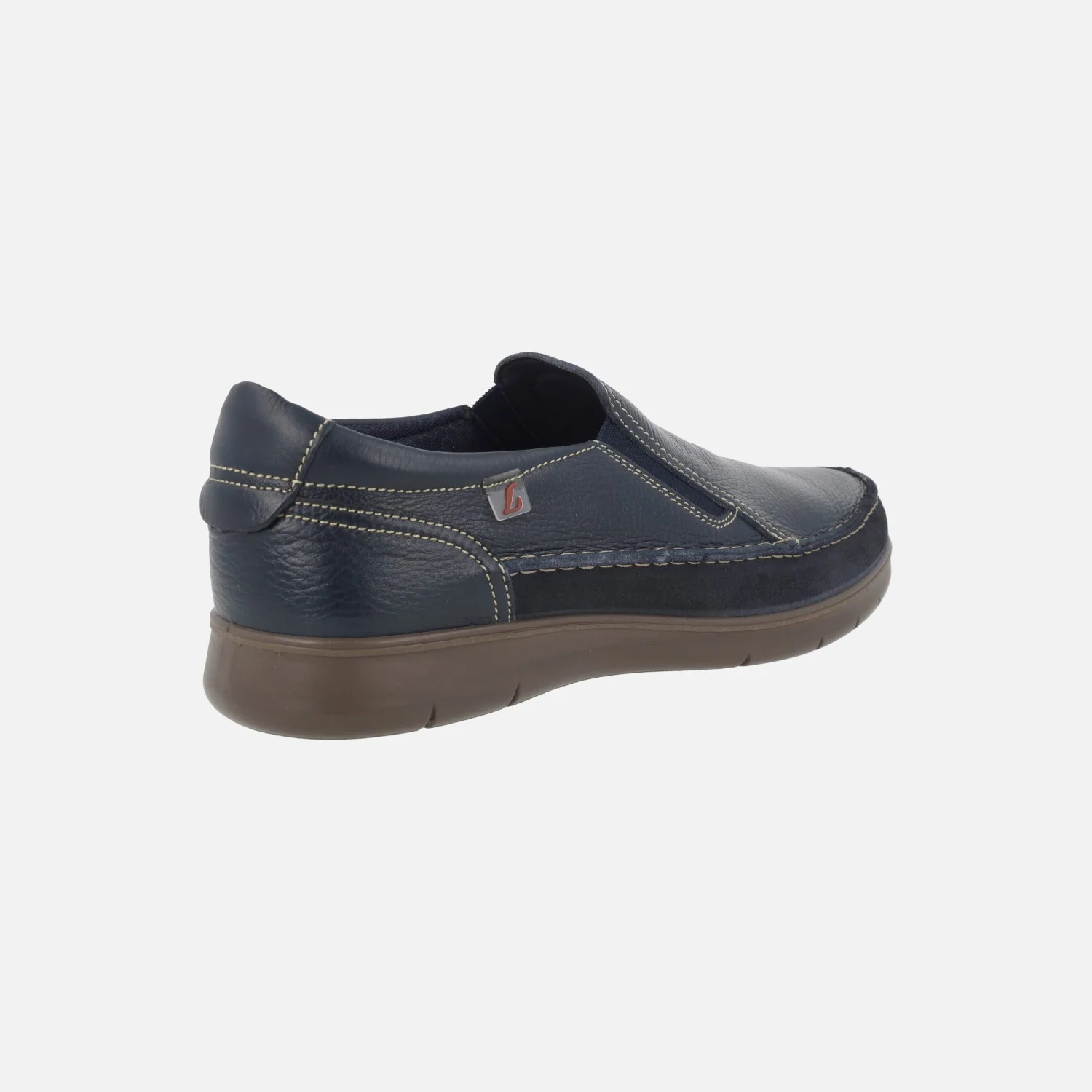 Mocasines confort para hombre de la marca Luisetti modelo 27900NA Piel Napa marino. Mocasines de piel azul marino, con detalles en serraje. Elásticos laterales, para mejor calce y sujeción. Interior textil, con plantillas extraíbles. Piso de goma. Made in Spain.