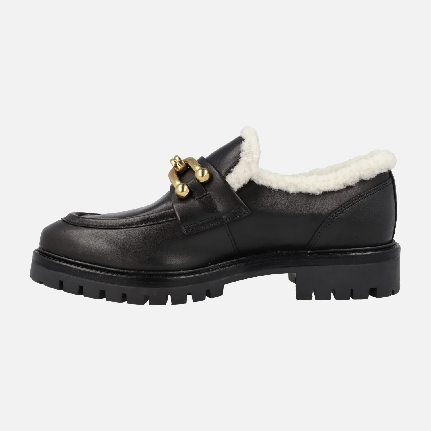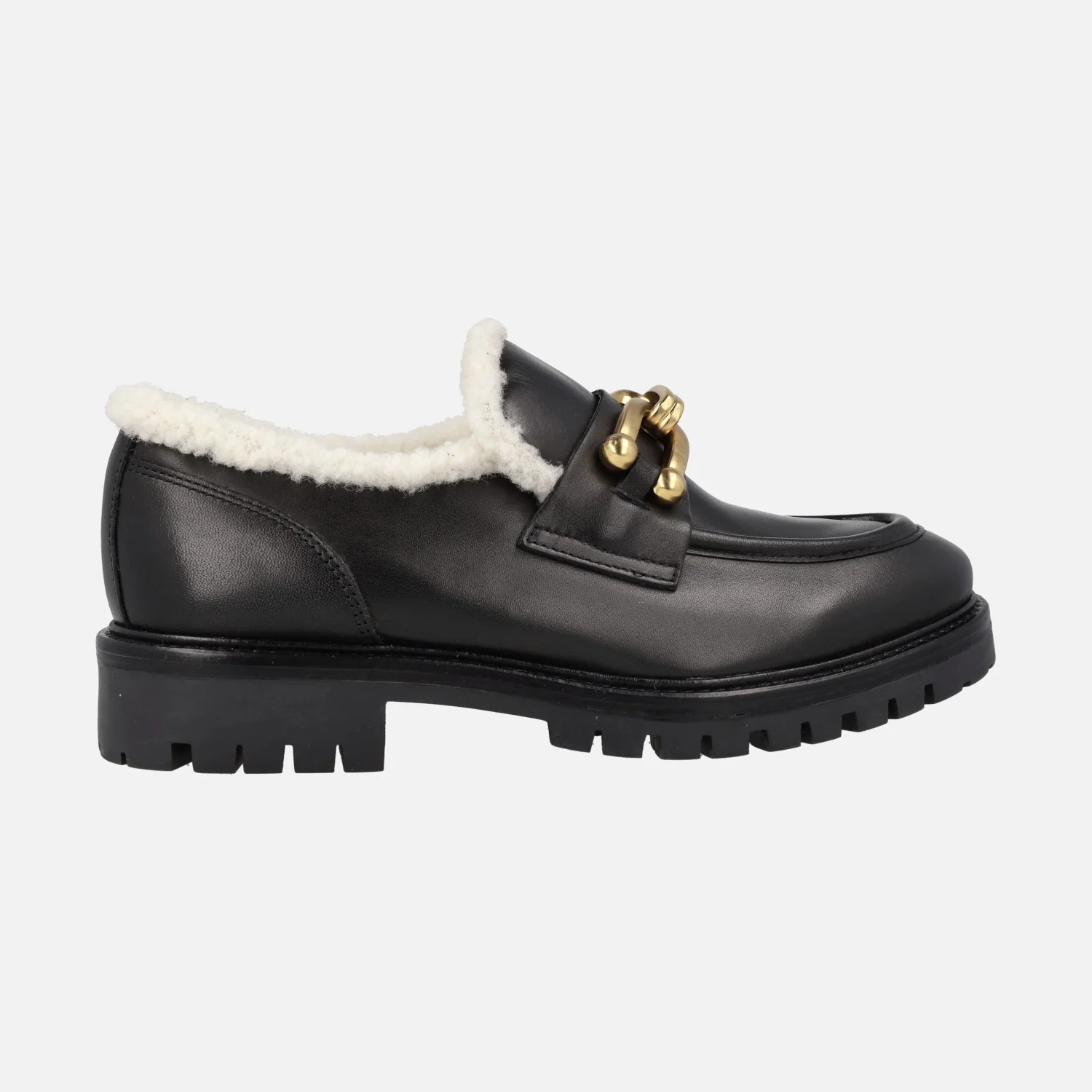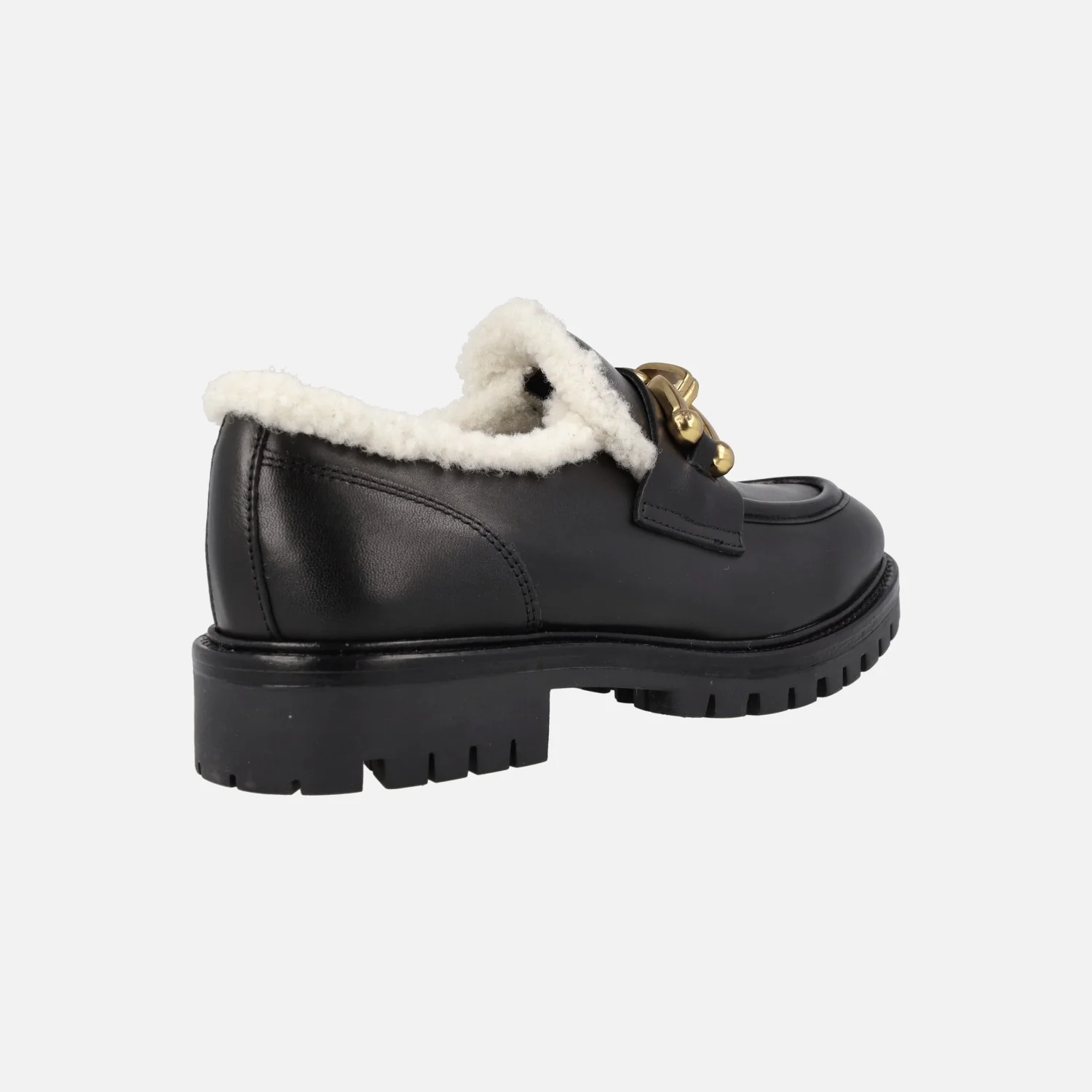 Zapatos mocasines para mujer de la marca Alpe modelo Militare 2695 Becerro Negro. Mocasines elaborados en piel negra, con adorno metálico dorado en la pala y borde ribeteado en borreguillo. Interior mixto de piel (plantillas de piel y la mitad del copete y talón) y borreguillo. Elástico en la parte de debajo del copete para facilitar el calce. Piso de goma de 3,5 cms de altura en la parte trasera y 1,5 cms en la delantera.