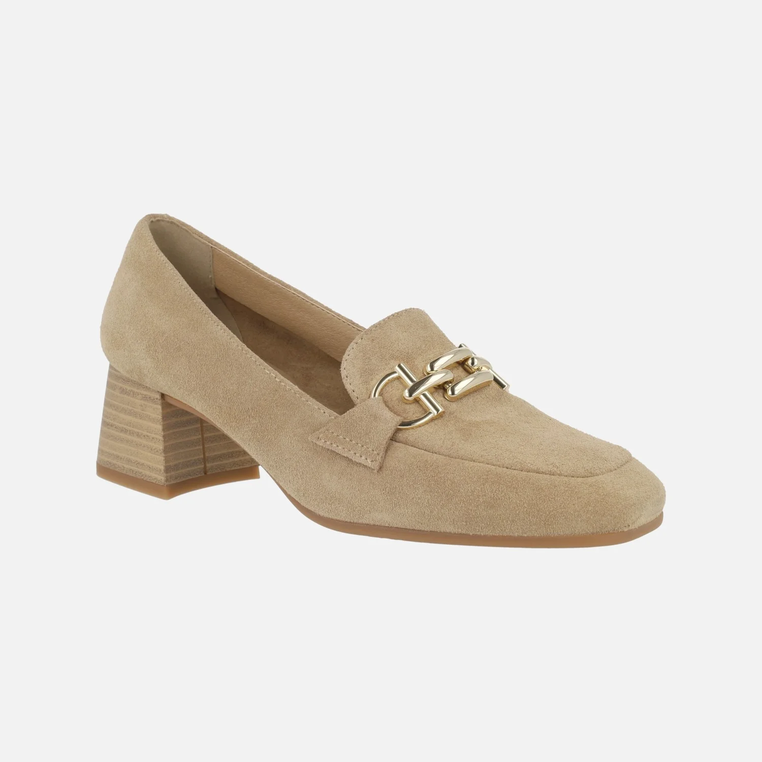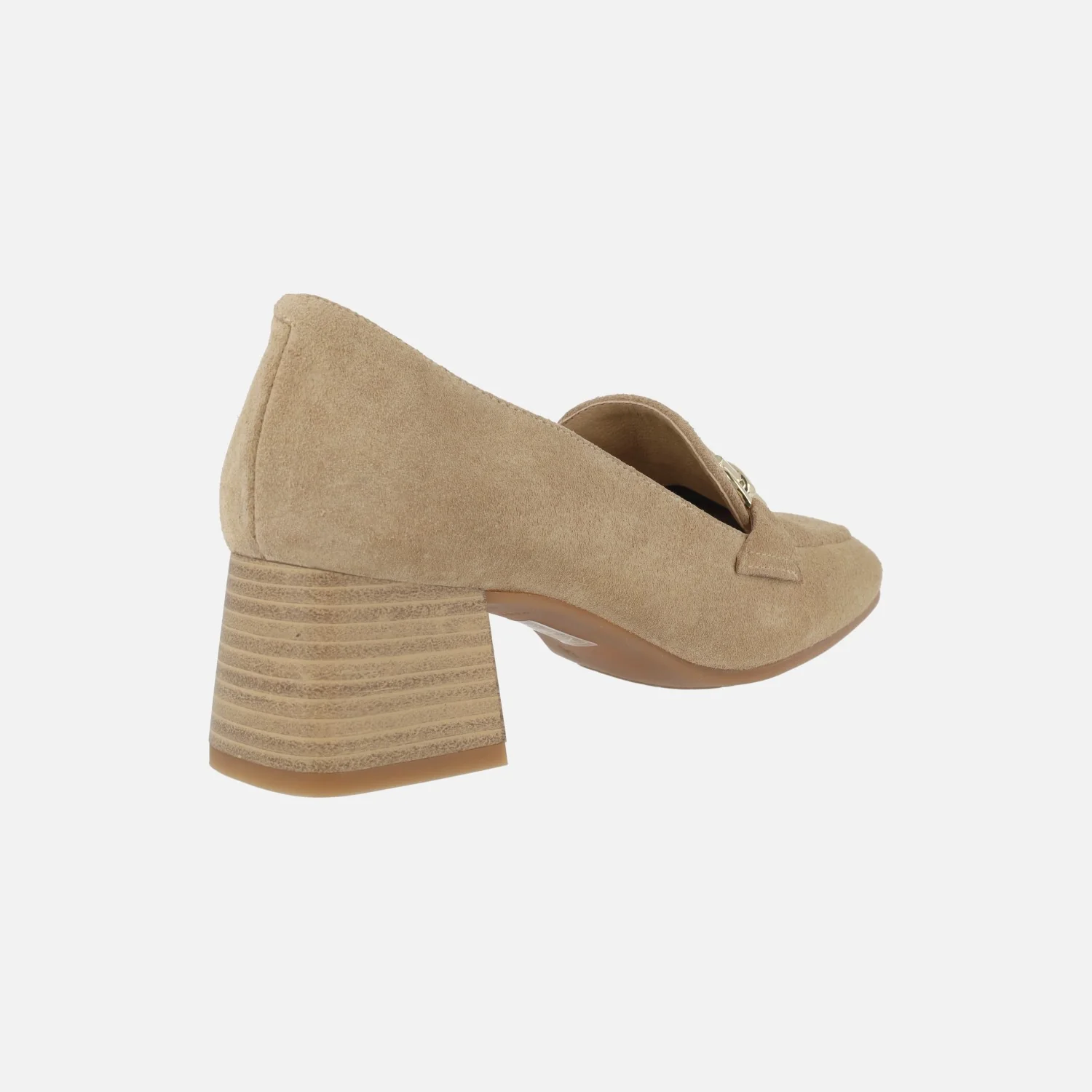 Mocasines de tacón en serraje camel con adorno dorado
