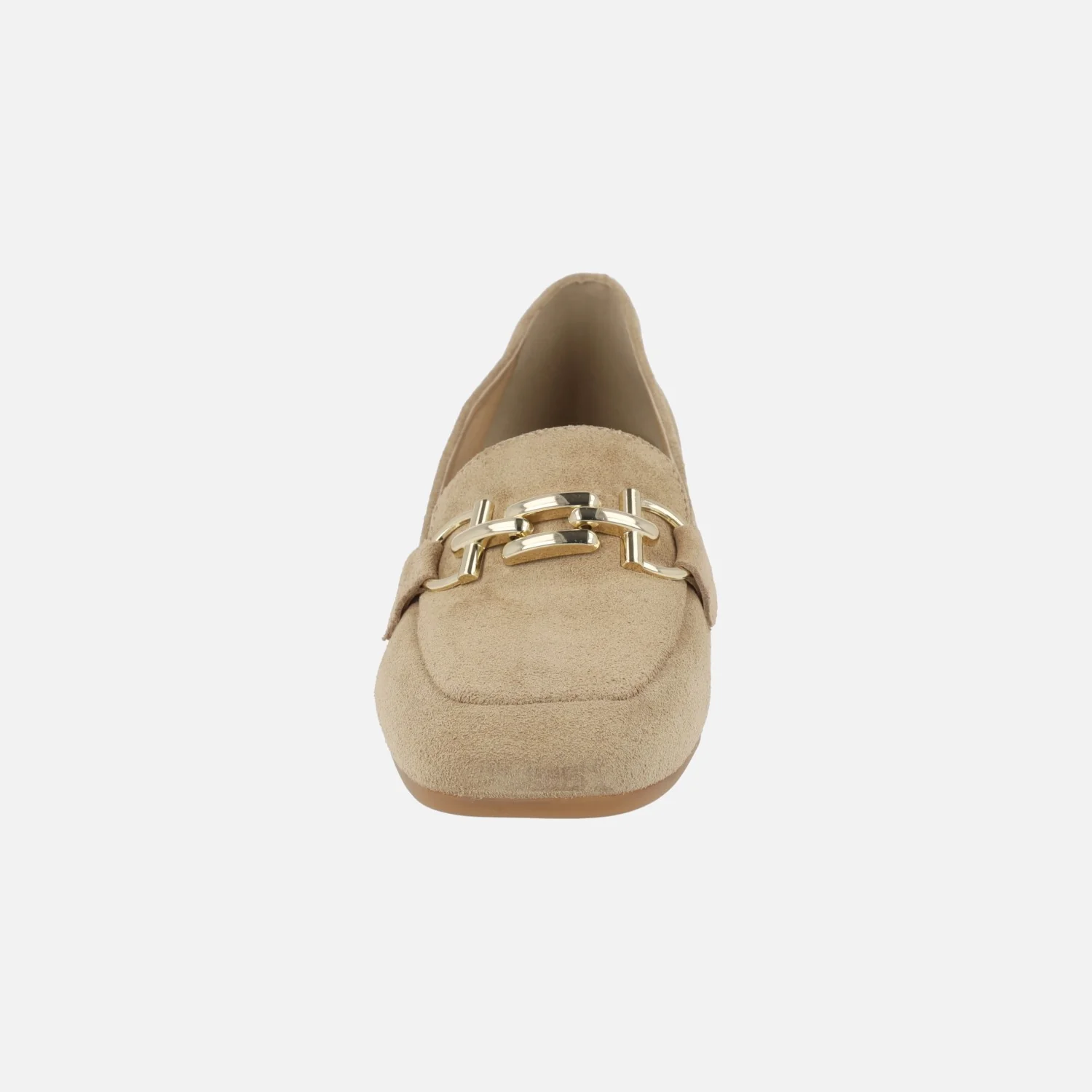 Mocasines para mujer de la marca española Funchal lady, modelo 43006, en ante camel. Zapatos con exterior en piel ante con adorno metálico dorado en la pala. Interior y planta de piel y tejido. Suela sintética. Tacones anchos, de 5 cms de altura. Made in Spain.
