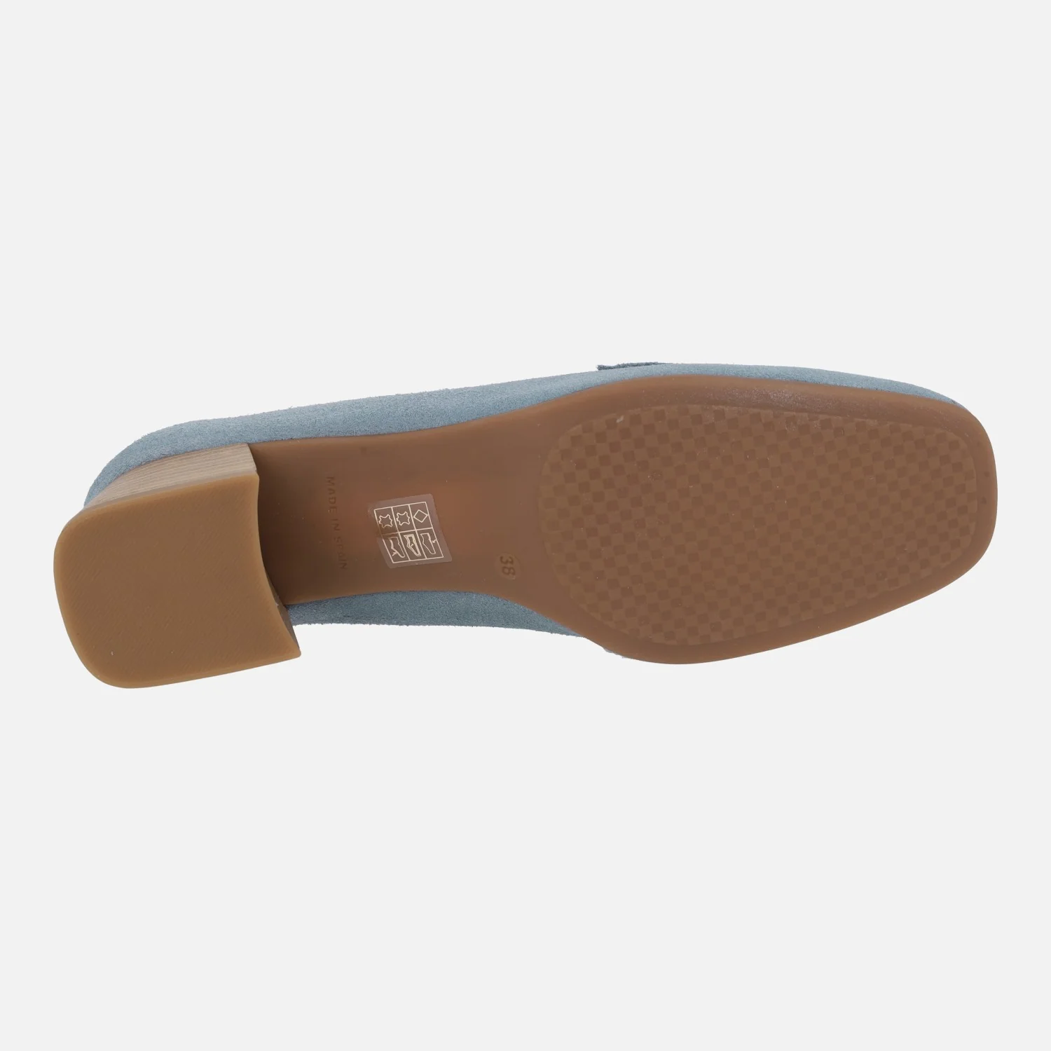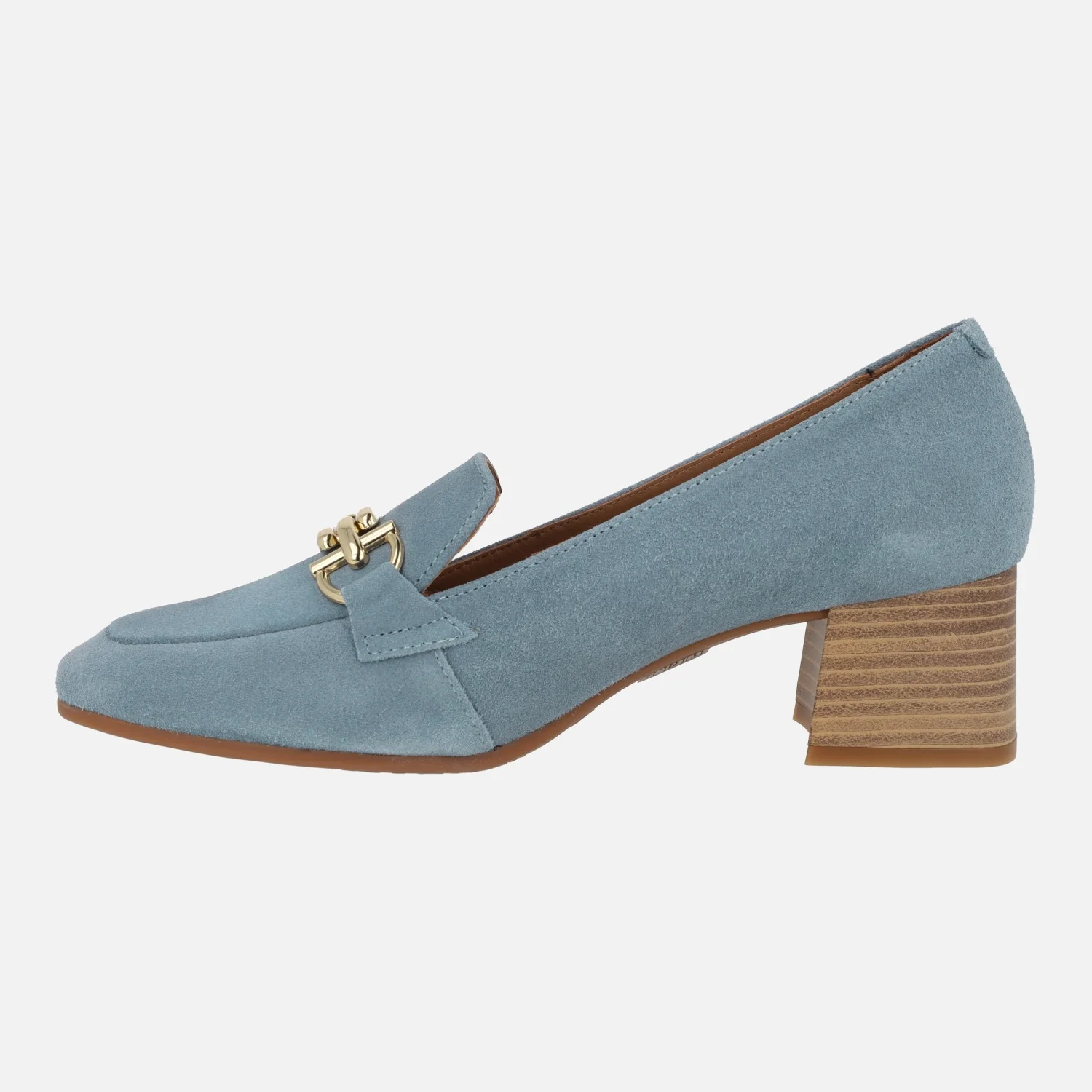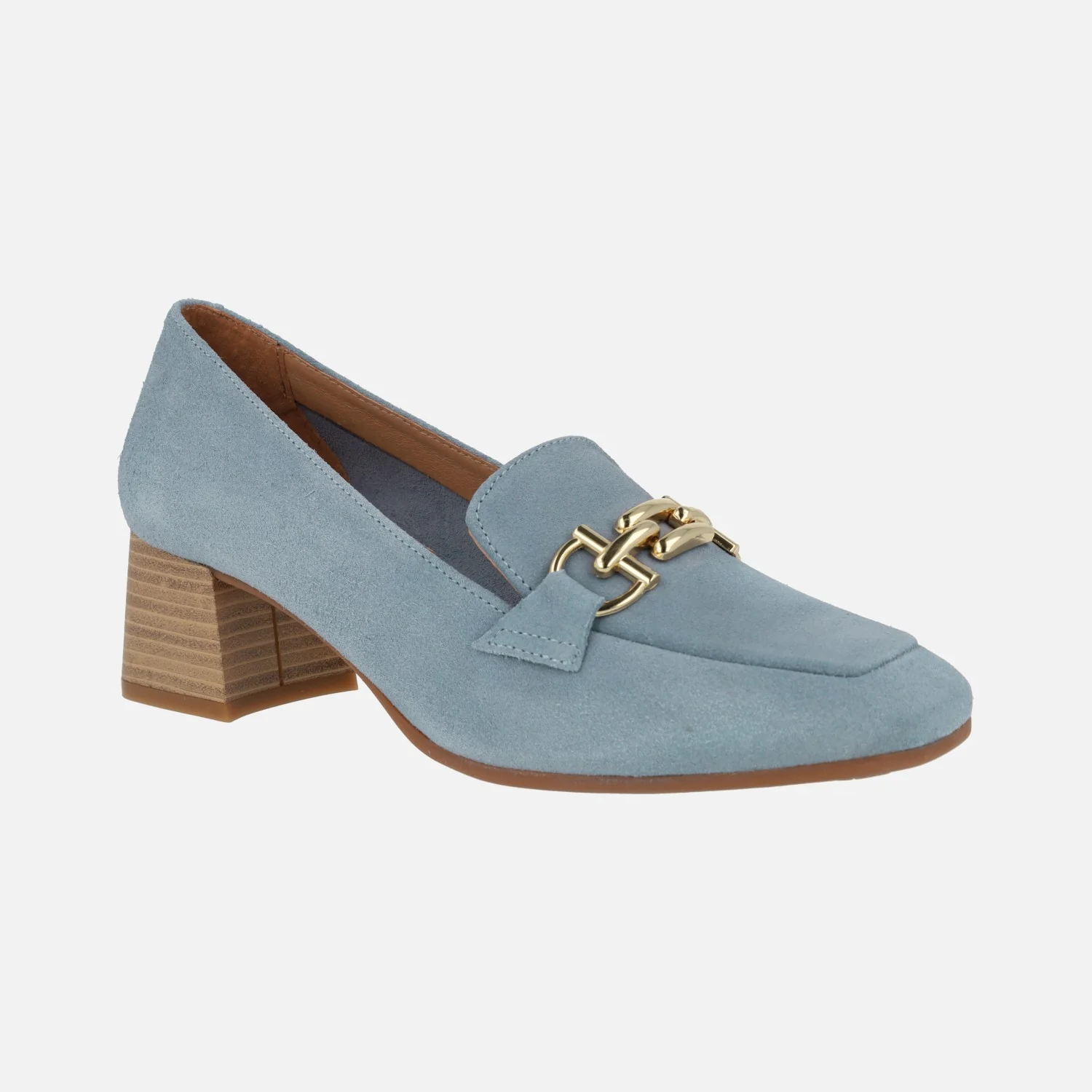 Preciosos mocasines para mujer de la marca española Funchal lady, modelo 43006, disponibles en ante azurro (azul celeste). Zapatos con exterior en piel ante con adorno metálico dorado en la pala. Interior y planta de piel. Suela de goma. Tacones anchos, de 5 cms de altura. Made in Spain.