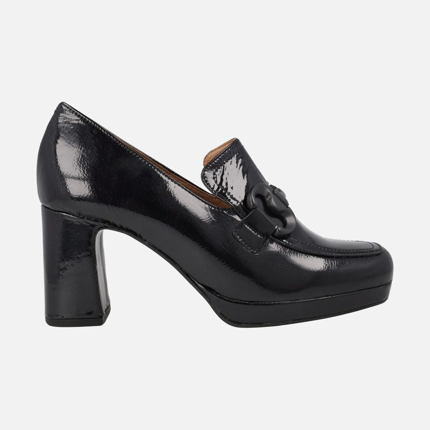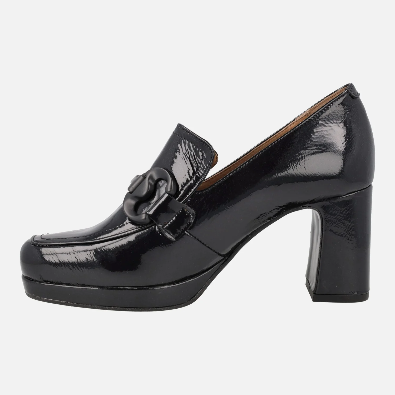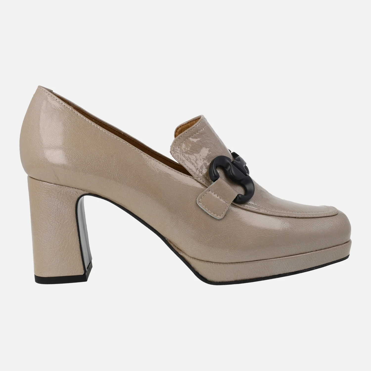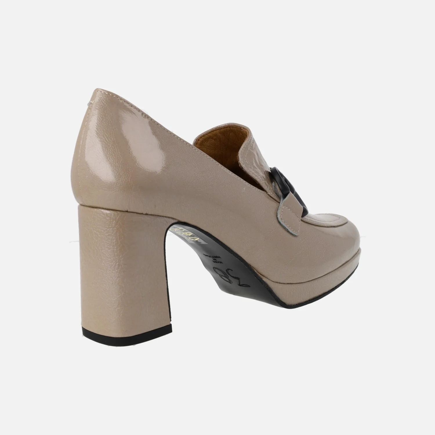 Mocasines de la Marca Portuguesa Virus Moda, modelo 30531, elaborados en Charol y disponibles en color negro y en Taupe (Almodine). Zapatos para mujer con tacón y plataforma forrados. La altura del tacón es de 7 cms., con una plataforma de 1cm. Adorno negro en el copete. Interior y plantilla de piel.