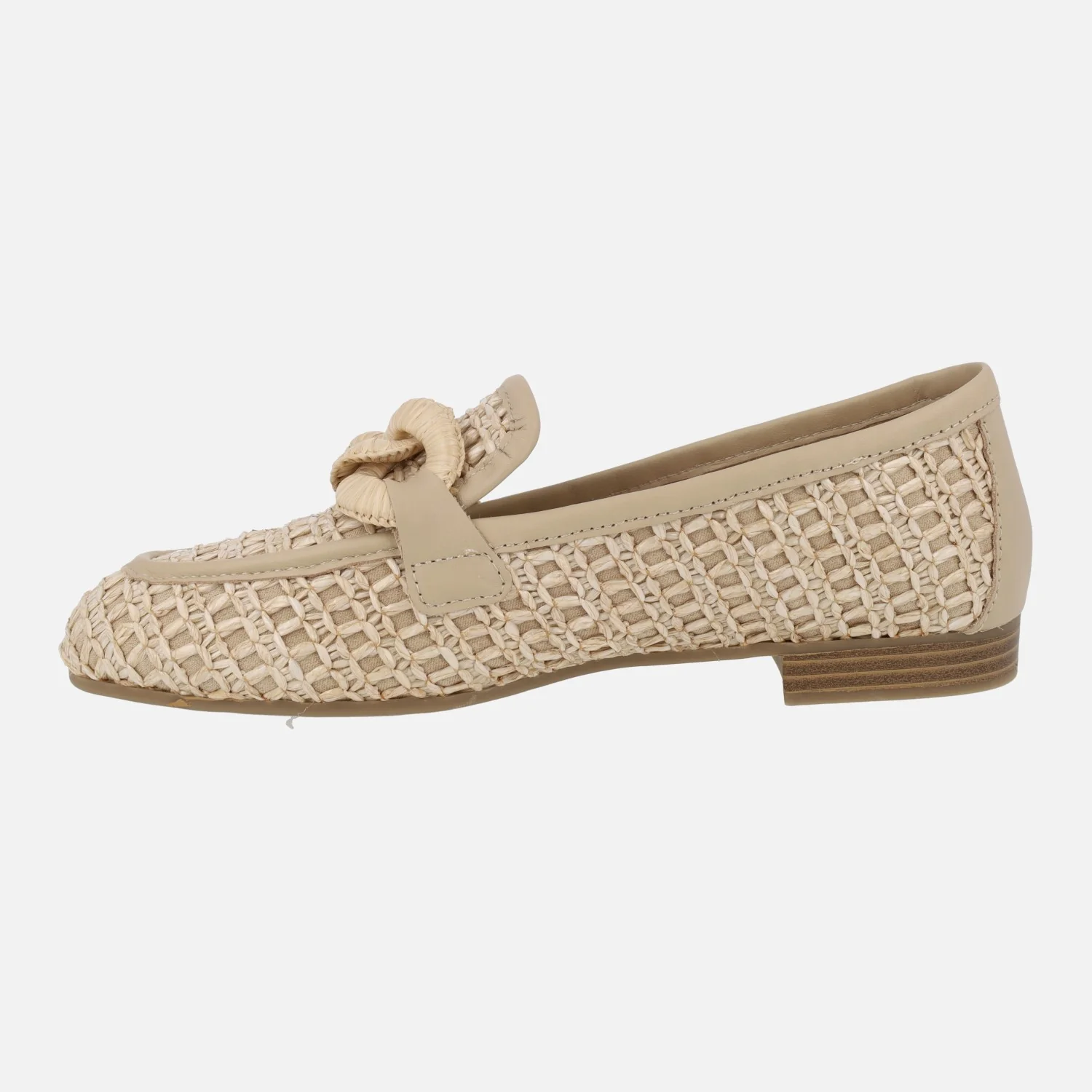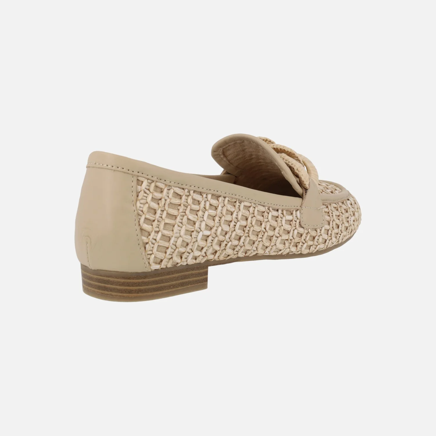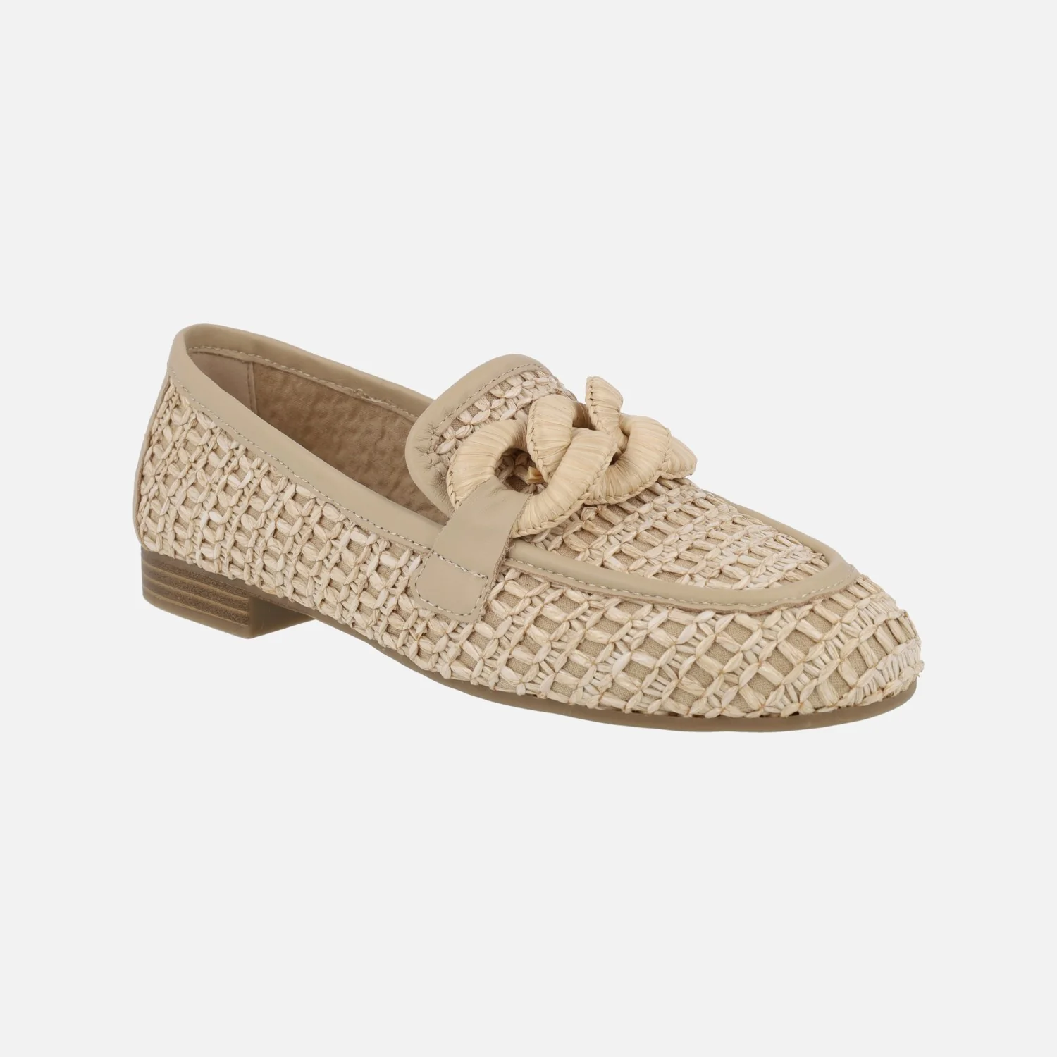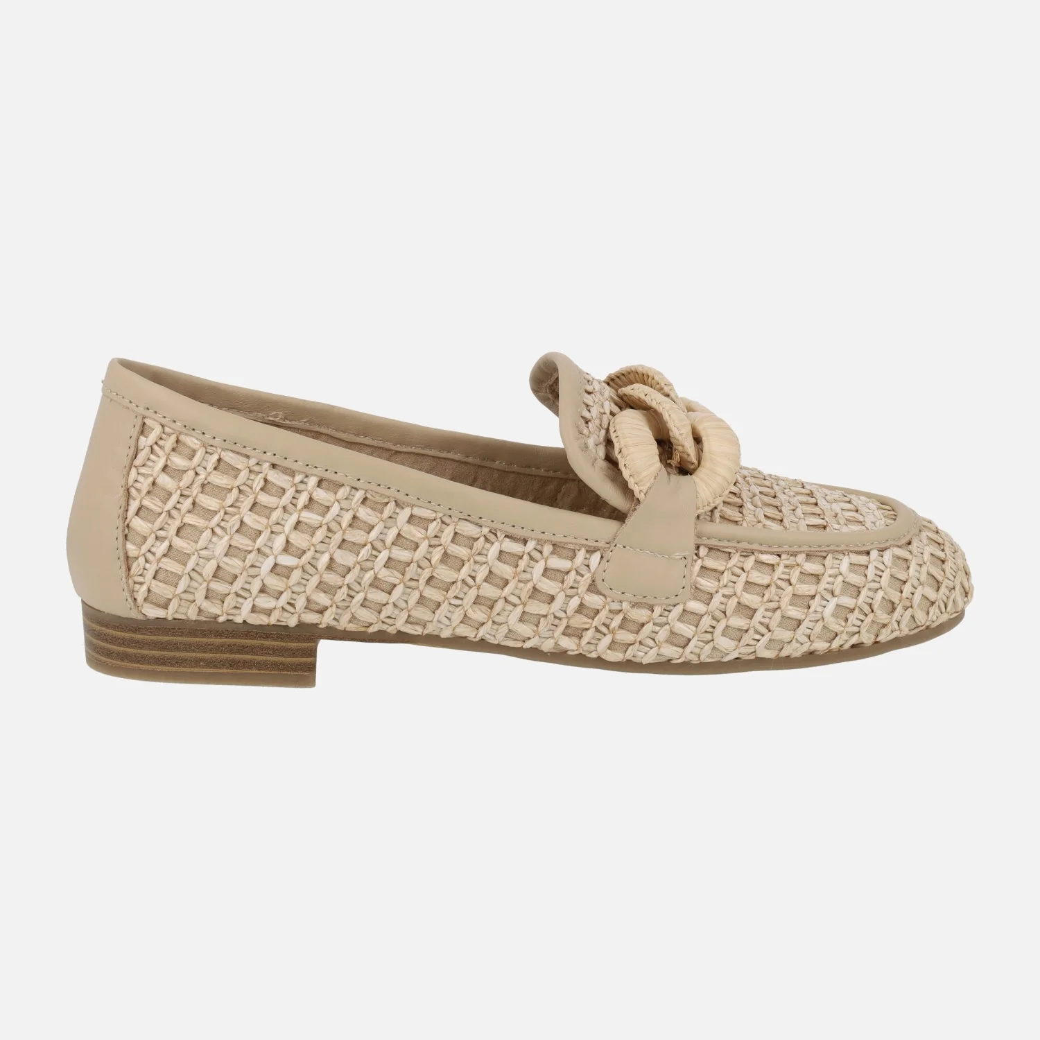 Mocasines para mujer de la marca Carmela shoes, modelo 162316, disponibles en beige, camel y negro. Mocasines elaborados en tejido efecto rafia, con detalles en piel. Adorno de eslabones forrados en la pala. Interiores en combinado de piel y tejido. Piso plano, sintético, de 2 cms de altura.