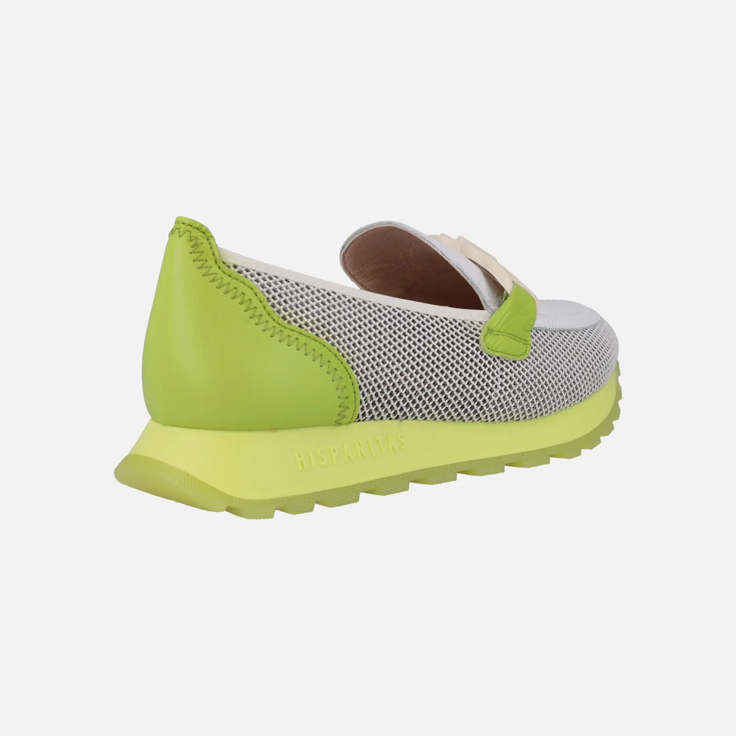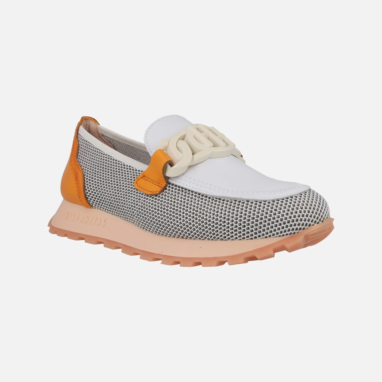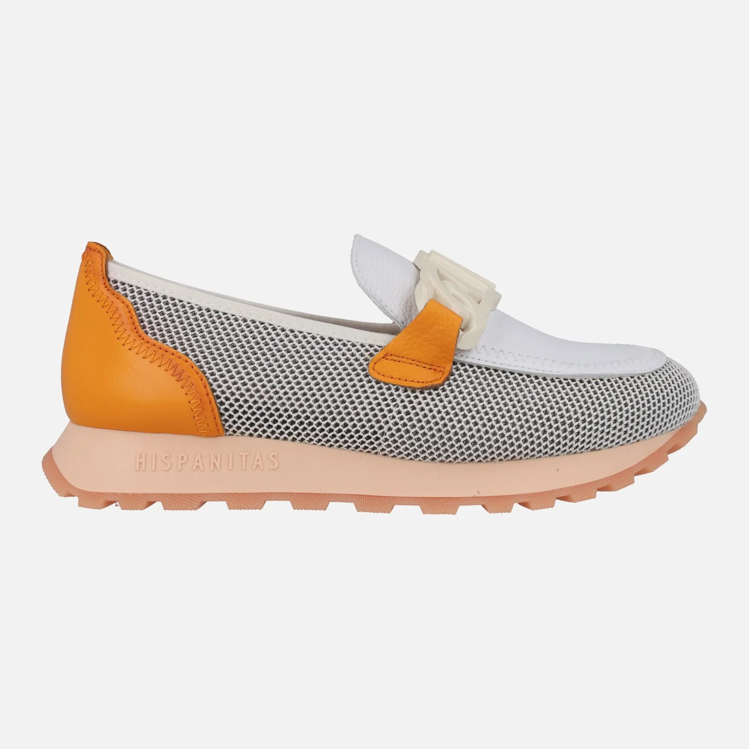 Mocasines Hispanitas modelo HV243461 WHITE/MANDARIN O WHITE/KIWI. Mocasines multimaterial, elaborados en combinado de piel y tejido rejilla (poliéster reciclado), en tonos blanco con naranja o blanco con verde lima. Forro microfibra. Adorno de pasta en el empeine. Tecnología TRIFLOW de triple almohadillado, para un mayor confort al caminar. Plantillas extraíbles. Piso de goma de aproximadamente 2,5 cms de altura trasera.