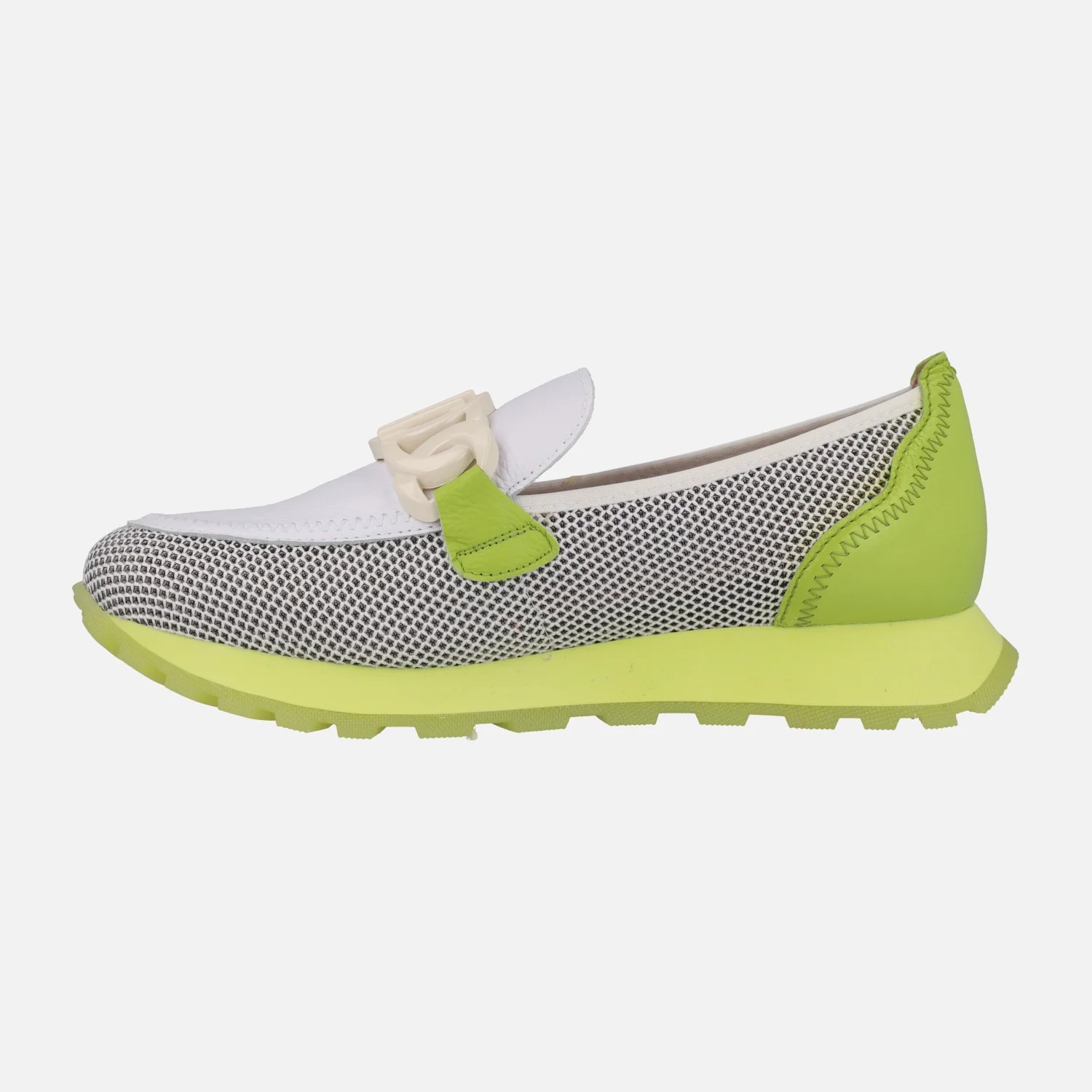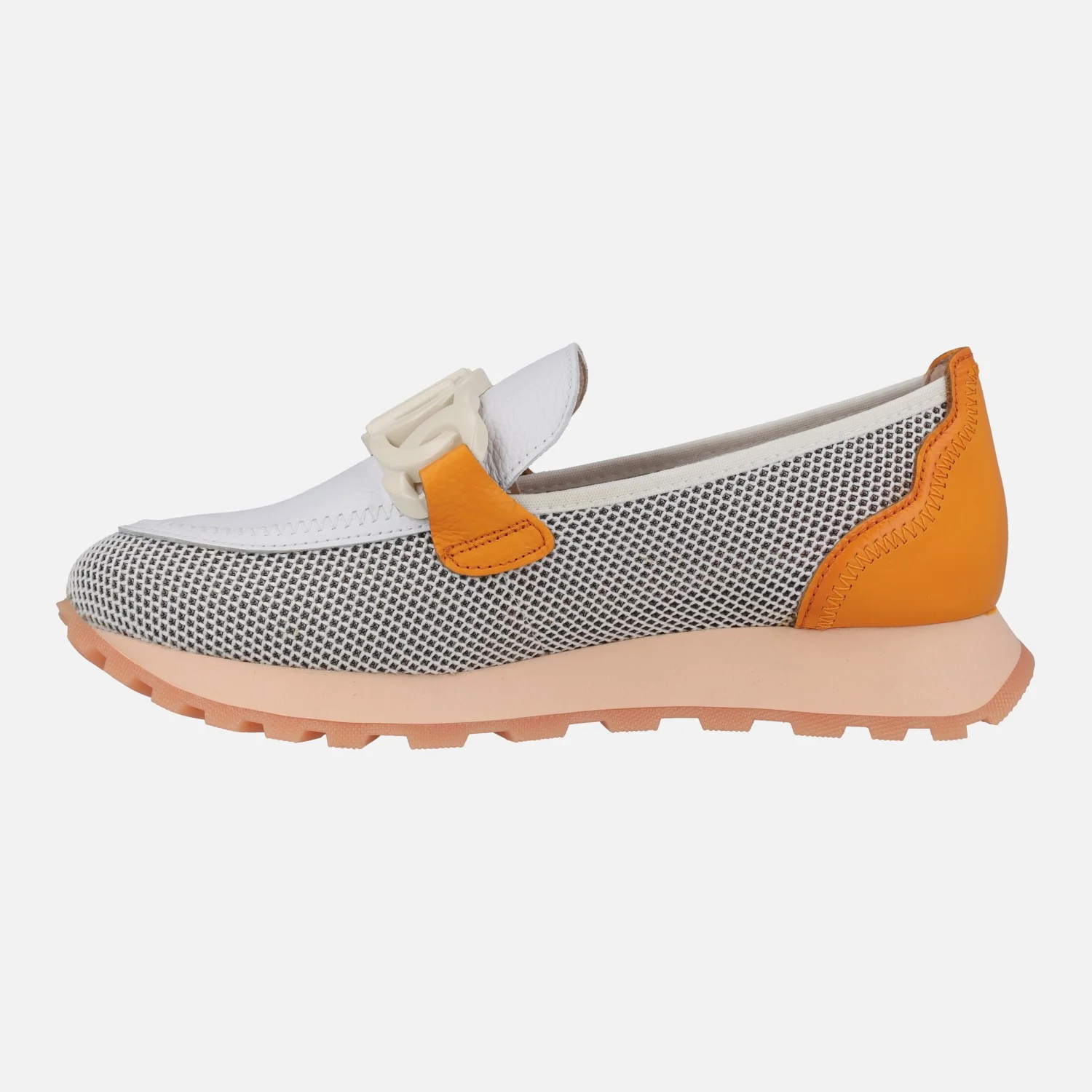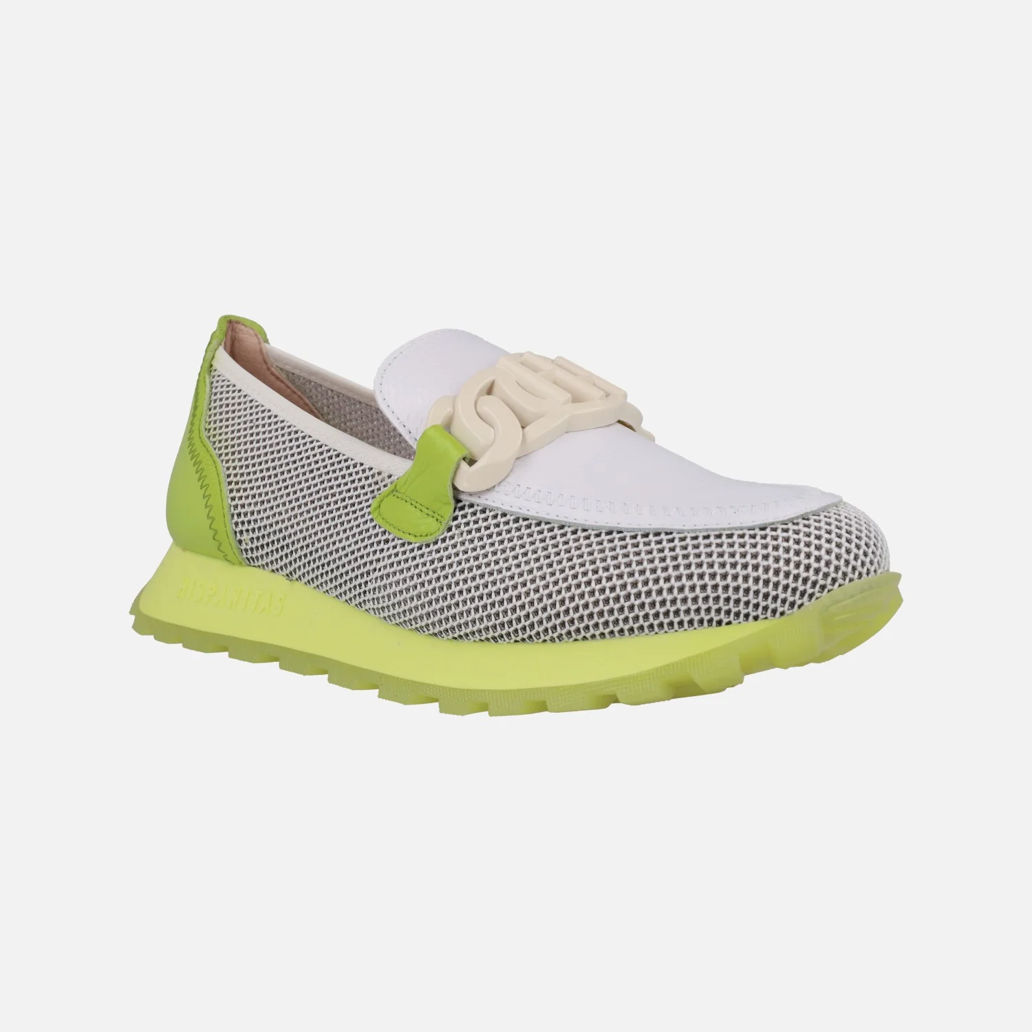 Mocasines Hispanitas modelo HV243461 WHITE/MANDARIN O WHITE/KIWI. Mocasines multimaterial, elaborados en combinado de piel y tejido rejilla (poliéster reciclado), en tonos blanco con naranja o blanco con verde lima. Forro microfibra. Adorno de pasta en el empeine. Tecnología TRIFLOW de triple almohadillado, para un mayor confort al caminar. Plantillas extraíbles. Piso de goma de aproximadamente 2,5 cms de altura trasera.