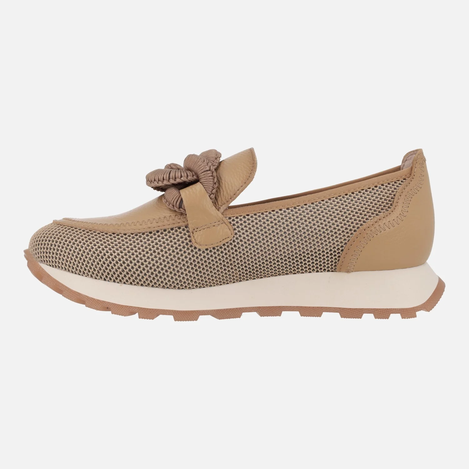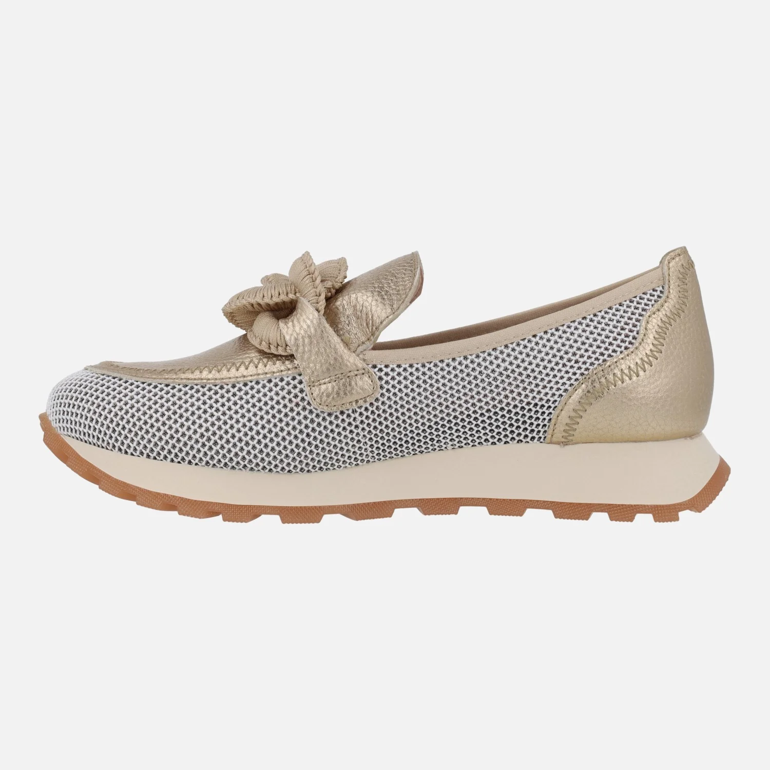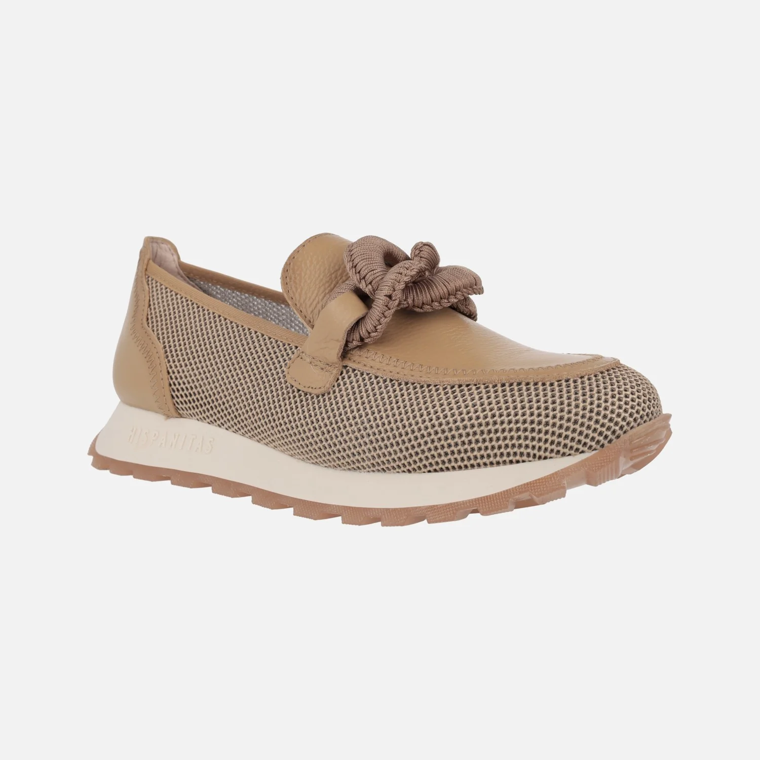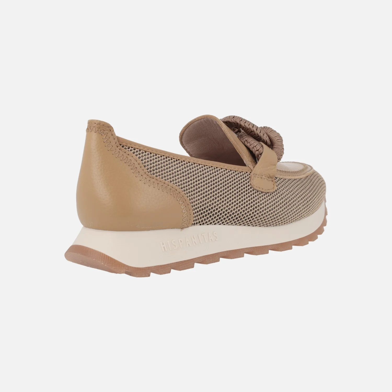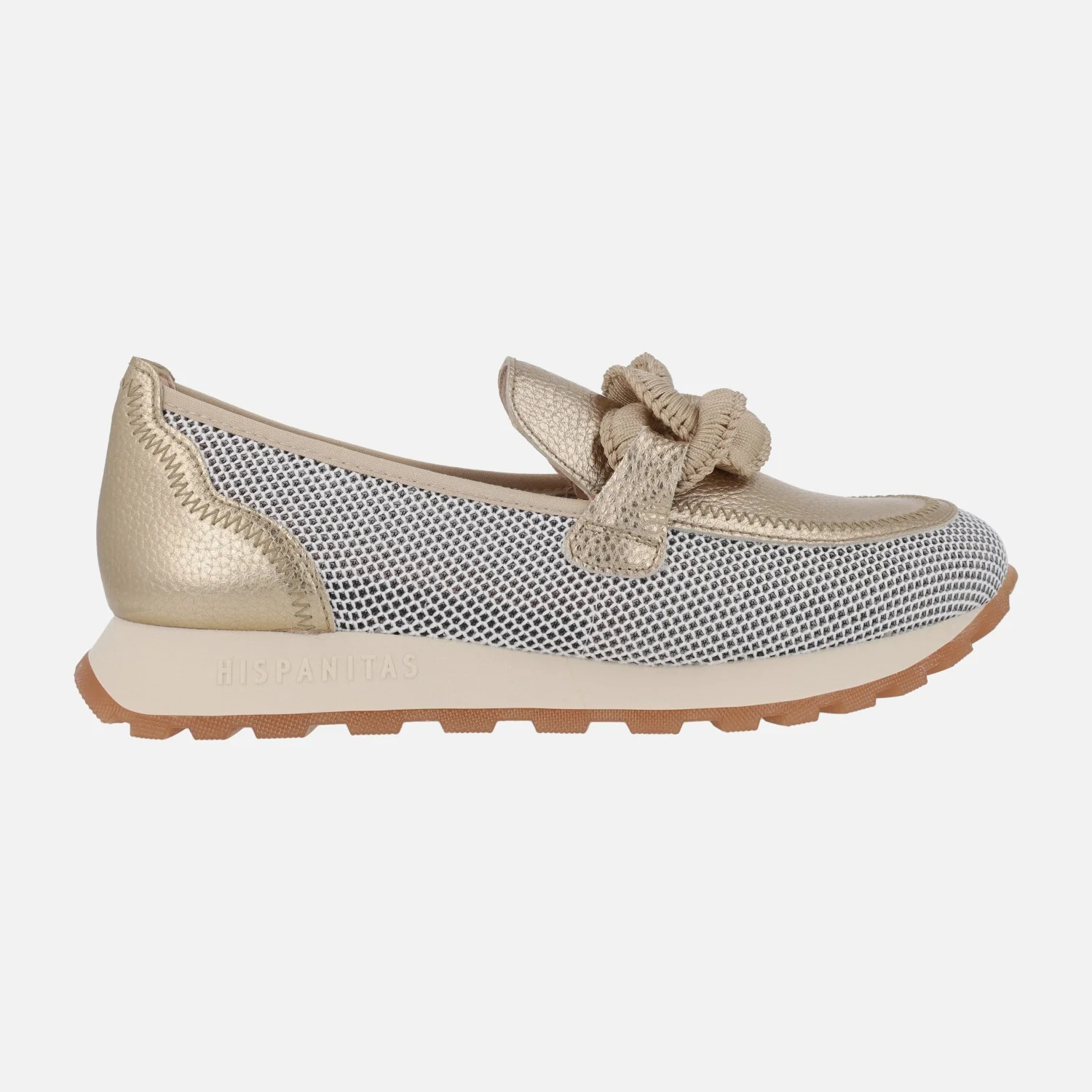 Nuevos mocasines Hispanitas modelo Sport Loira HV243270 . Mocasines multimaterial, elaborados en combinado de piel y tejido rejilla (poliéster reciclado), en tonos camel o en metalizado dorado. Forro microfibra. Adorno de eslabones en el empeine. Tecnología TRIFLOW de triple almohadillado, para un mayor confort al caminar. Plantillas extraíbles. Piso de goma de aproximadamente 2,5 cms de altura trasera