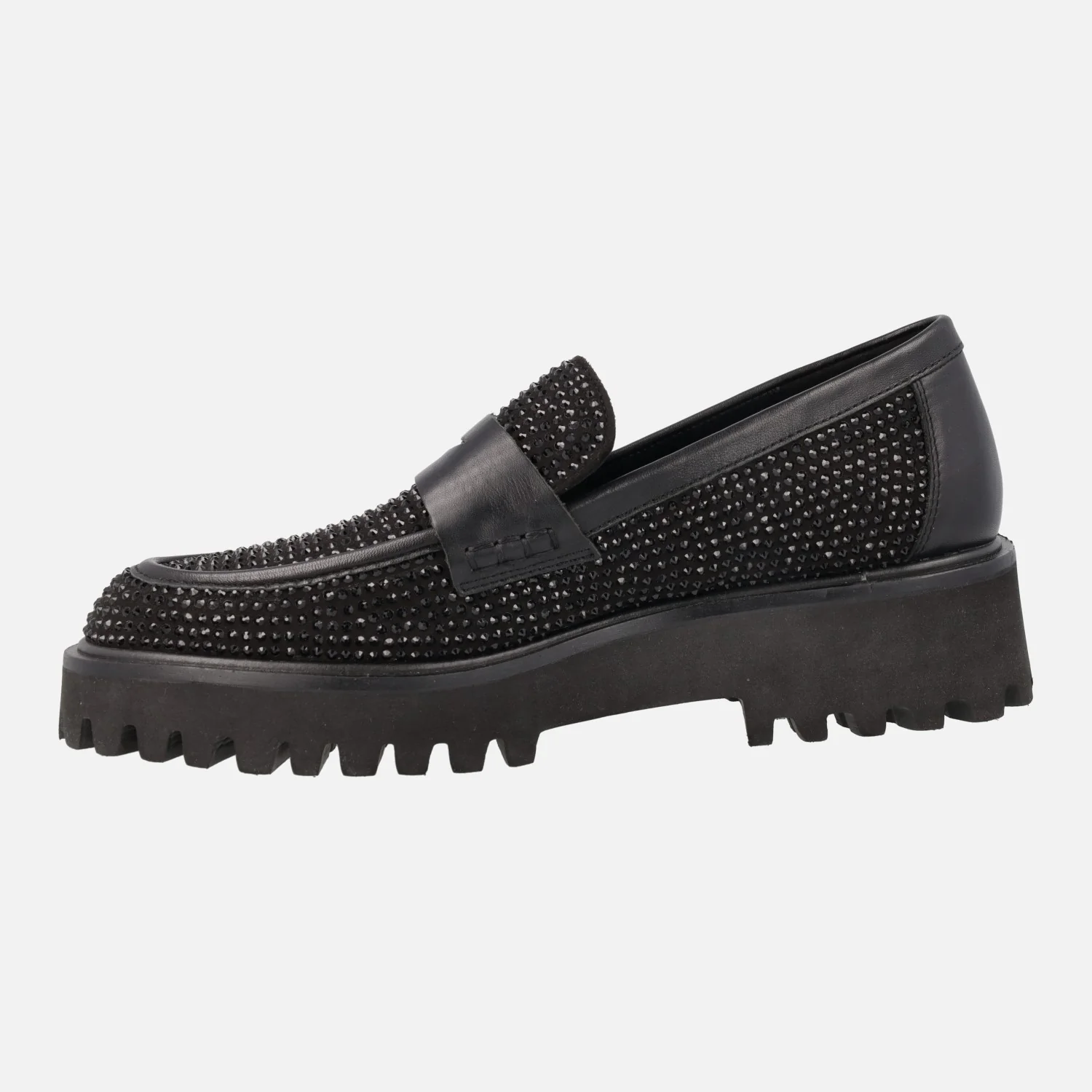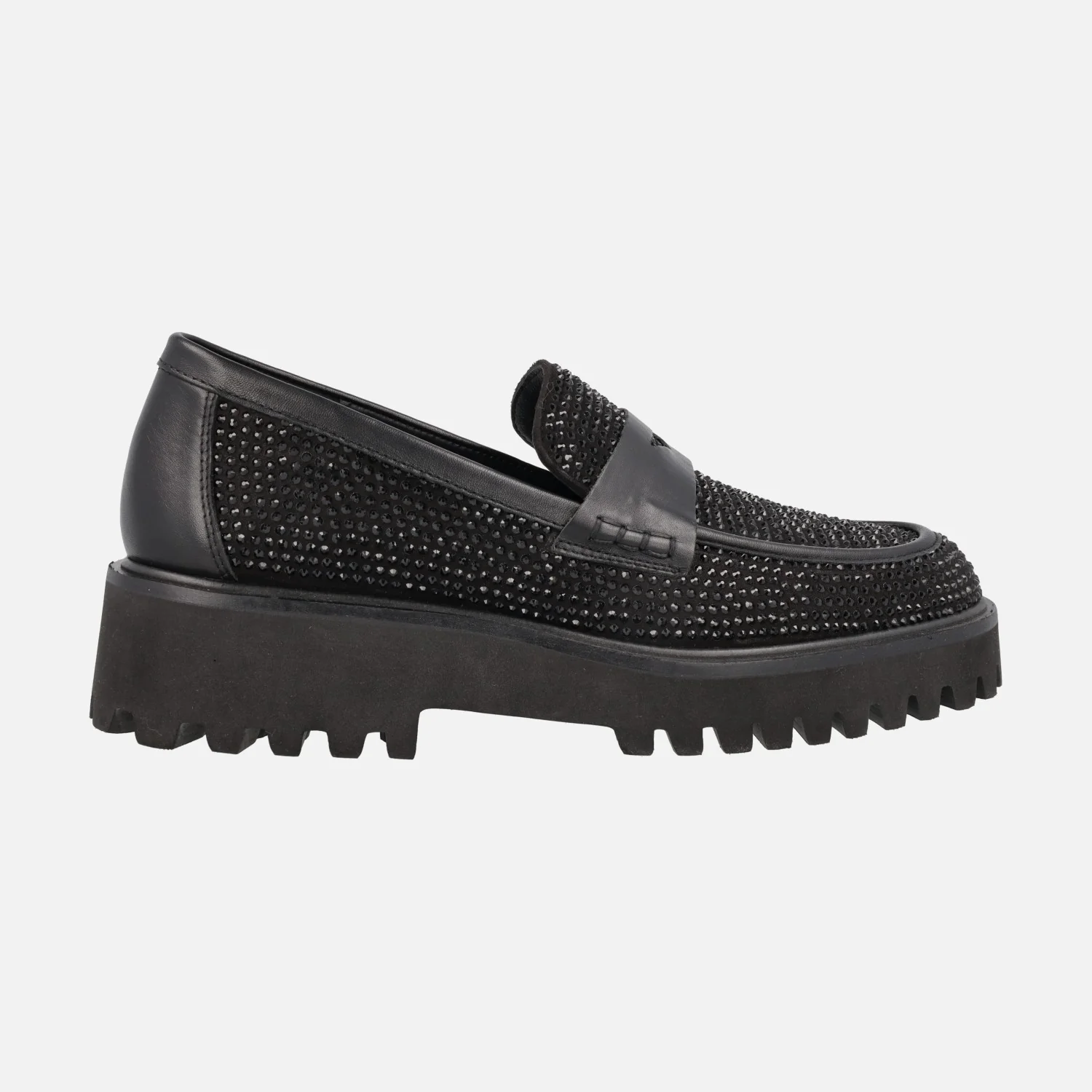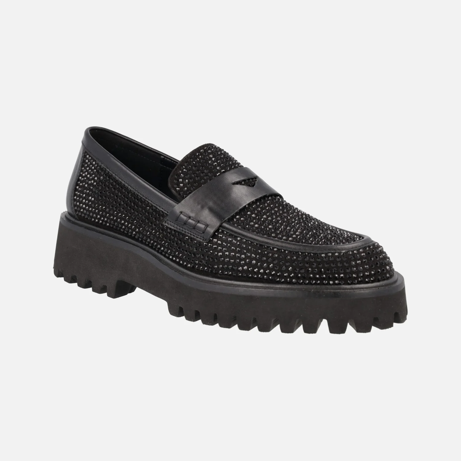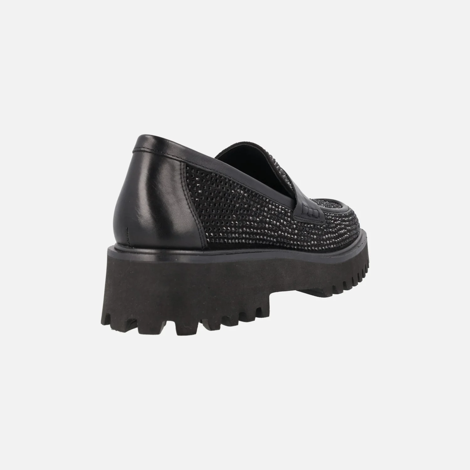 Enamoradas de los nuevos mocasines Pedro Miralles 25125 Negro. Mocasines con adorno de antifaz, elaborados en un combinado de piel negra con strass, que convierte a estos mocasines en una auténtica joya. Piso de goma track, muy ligero y de 5 cms de altura en la parte trasera (sólo 3 cms en la delantera). Interiores forrados de piel. Muy cómodos y confortables, a la vez que darán un toque de clase a todos tus outfits. Made in Spain.