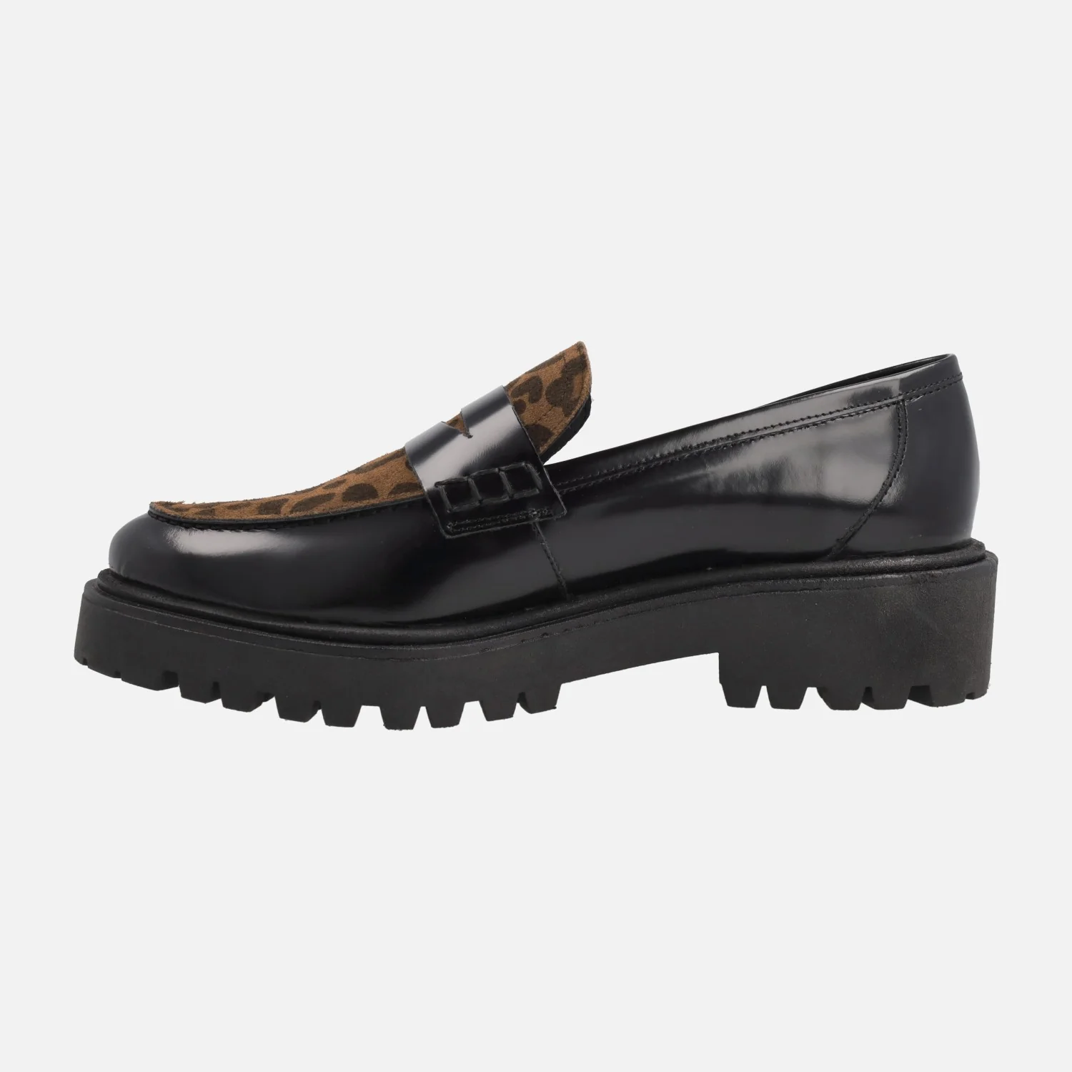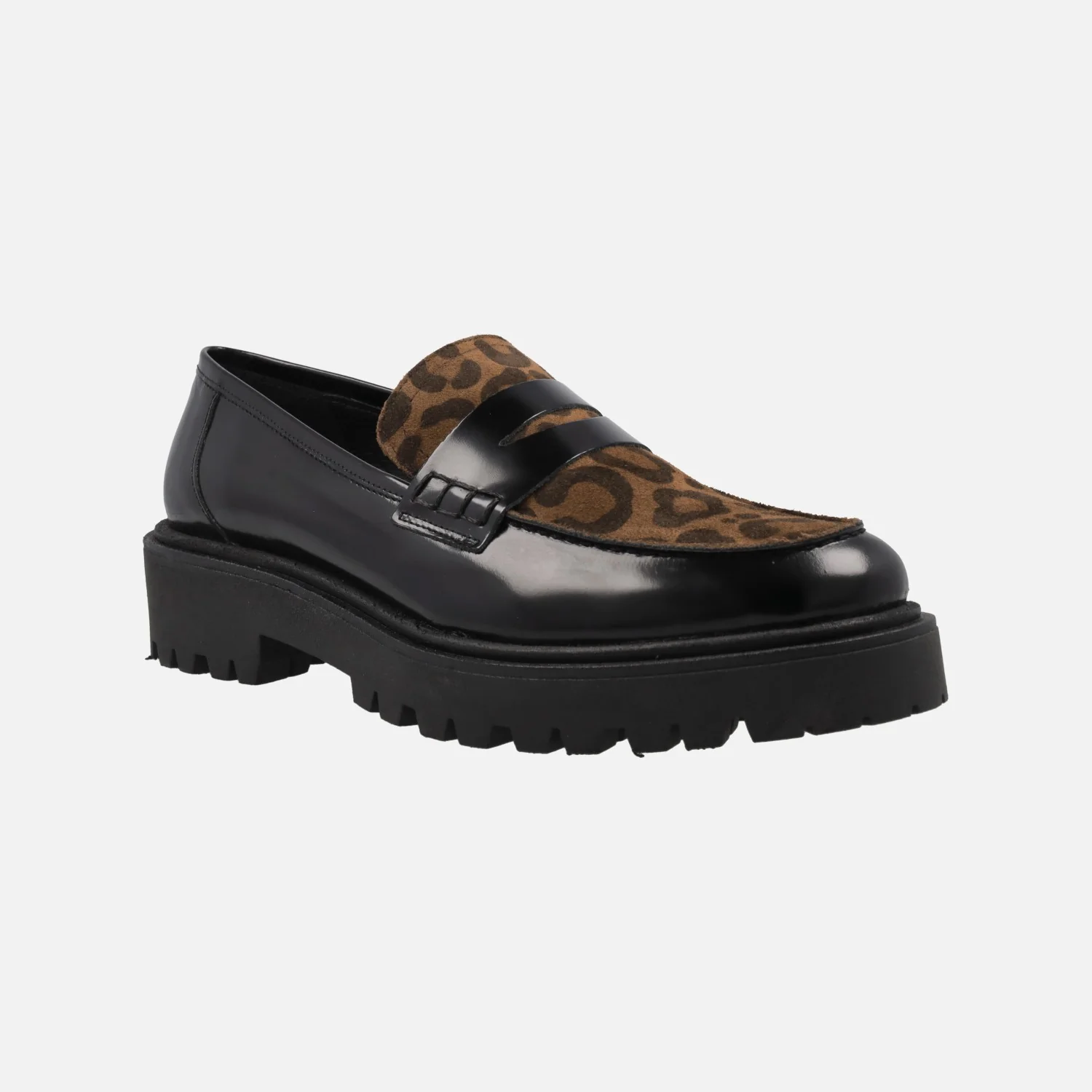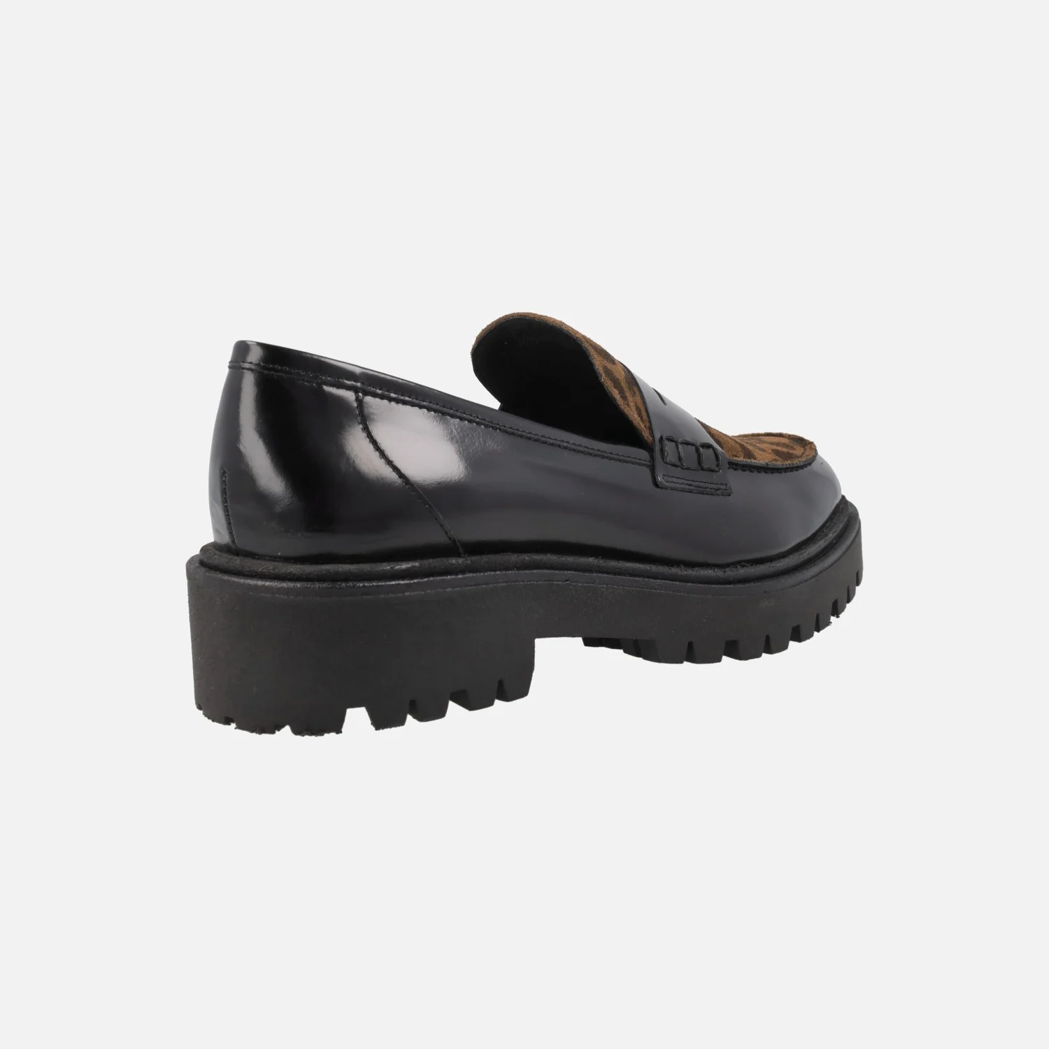 Mocasines negros con piso track y pala en leopardo