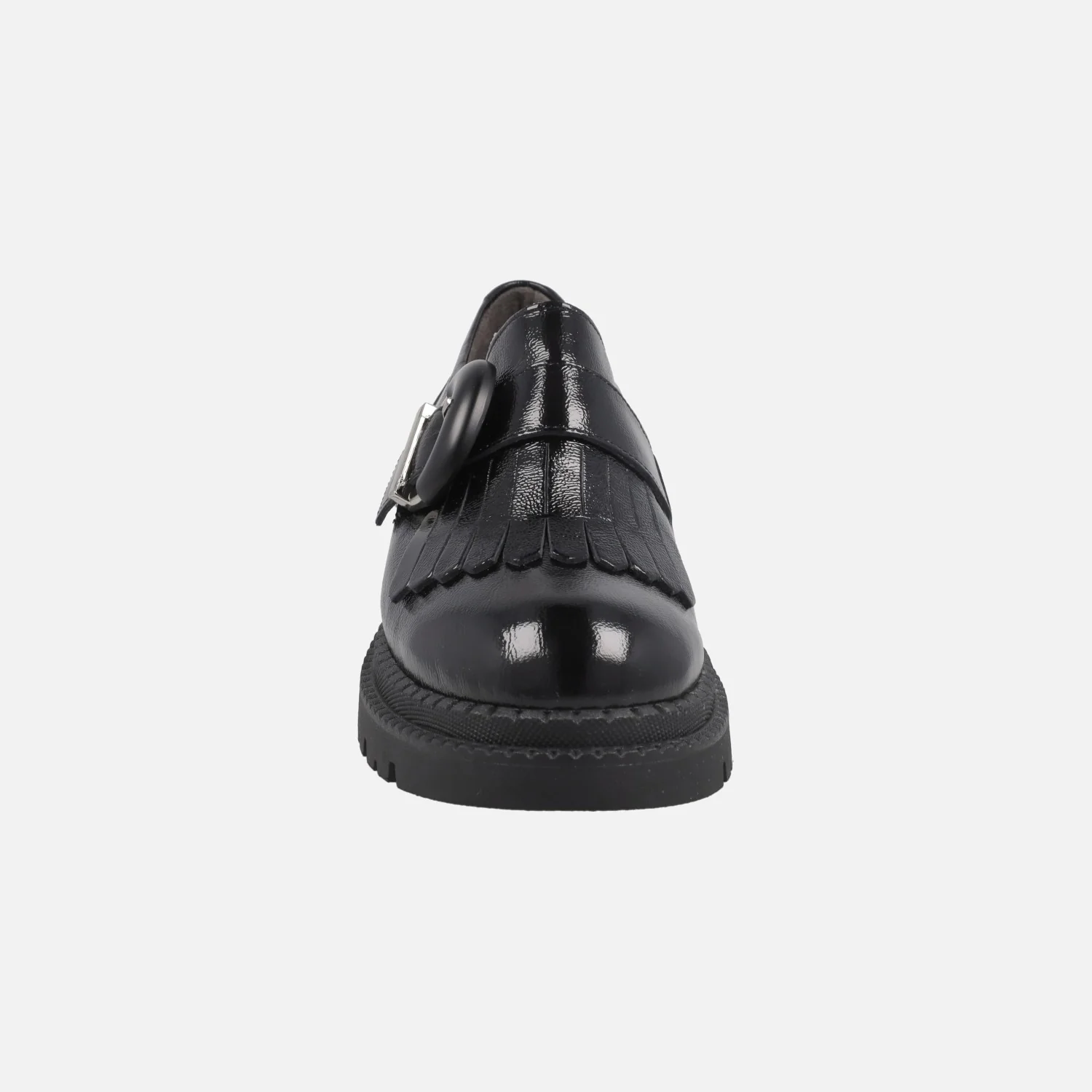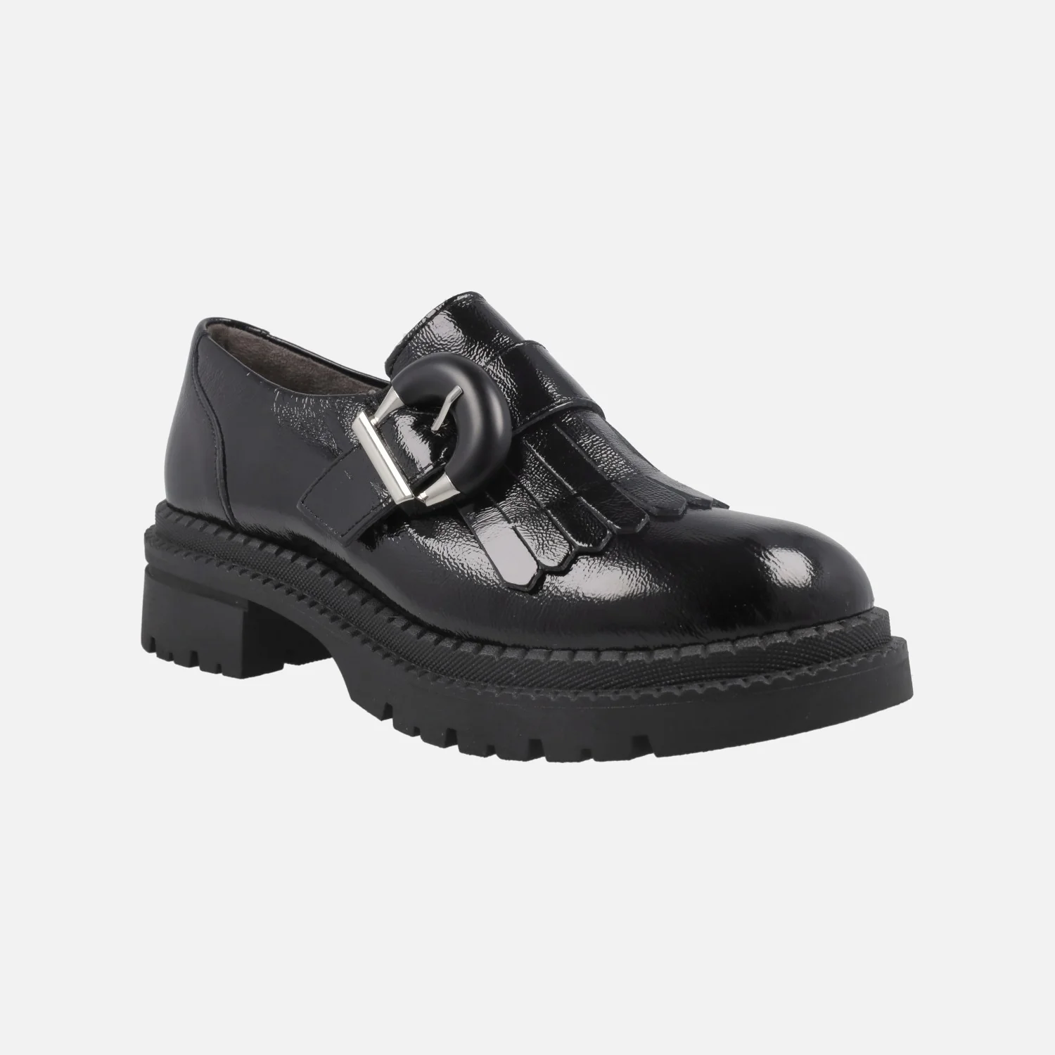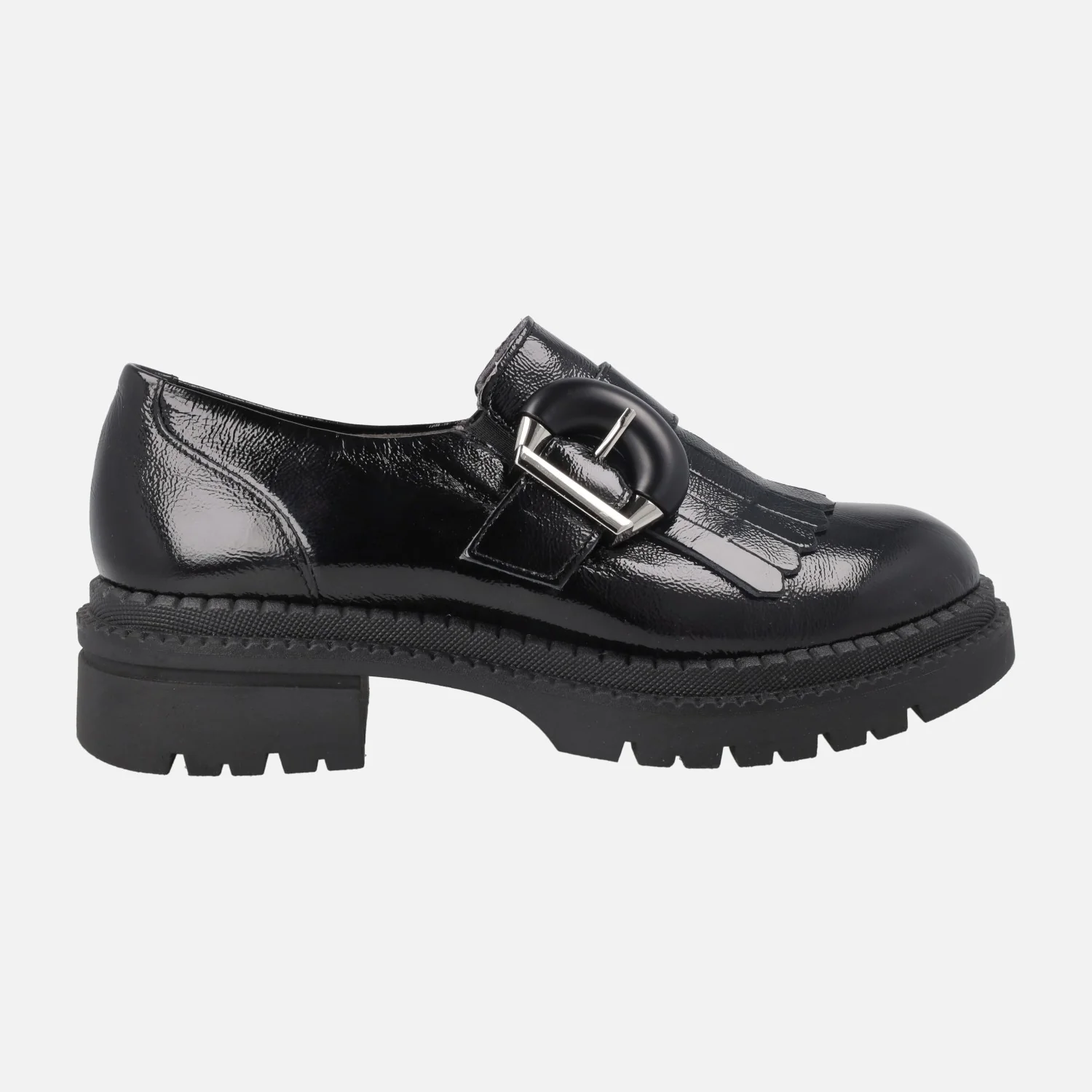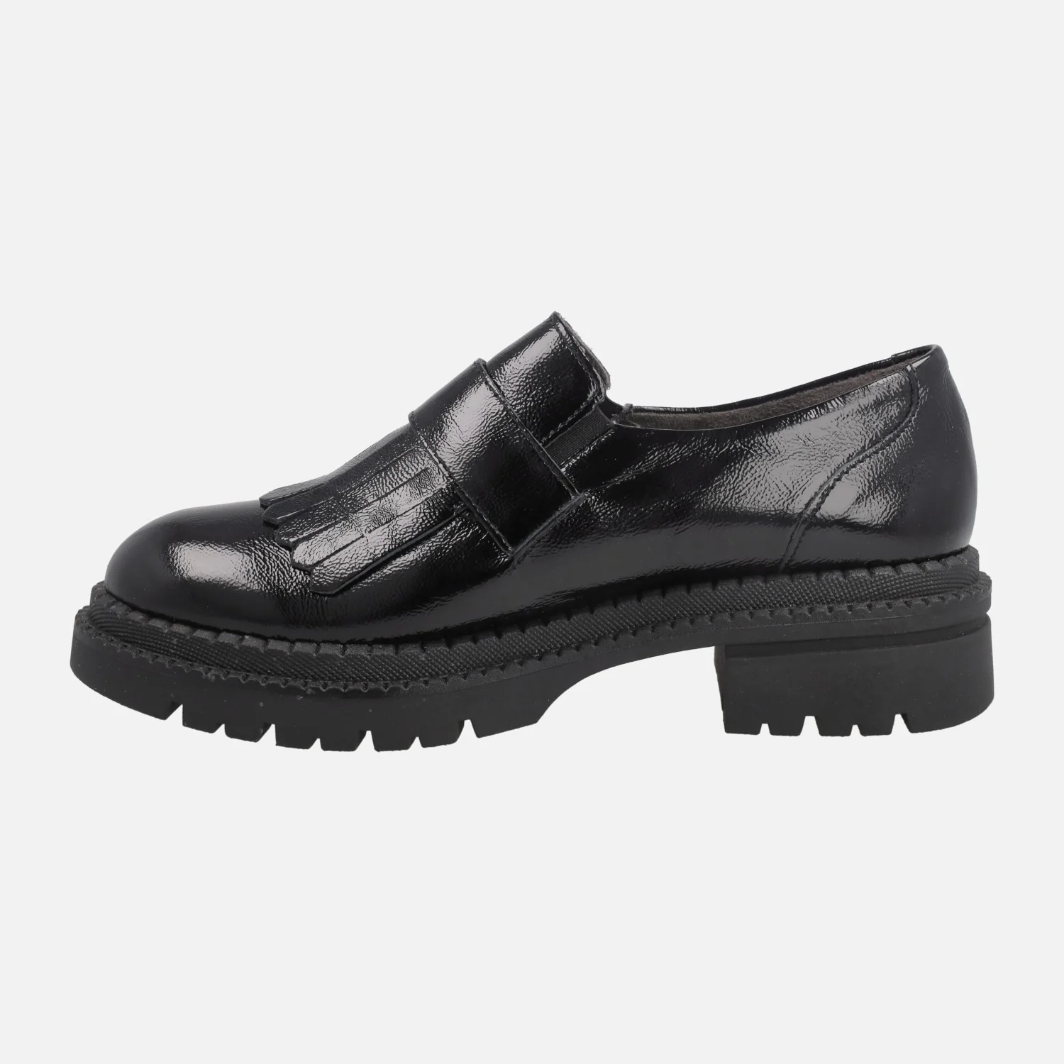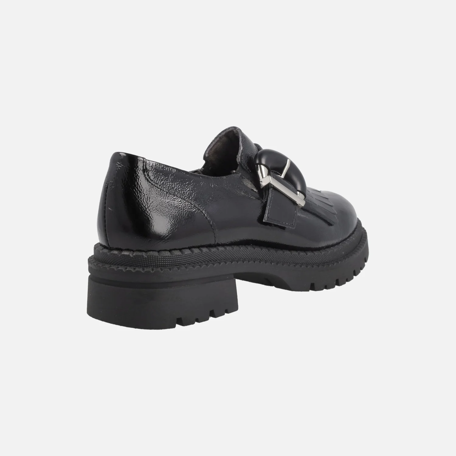 Mocasines negros de charol de la marca Pitillos modelo 10791 negro. Mocasines elaborados en piel charol, con adorno de flecos y hebilla. Elásticos a ambos lados para mayor calce y sujeción. Interior textil con plantillas extraíbles. Piso de goma, con 4,5 cm de tacón (2,5 cm plataforma delantera). Made in SPain.