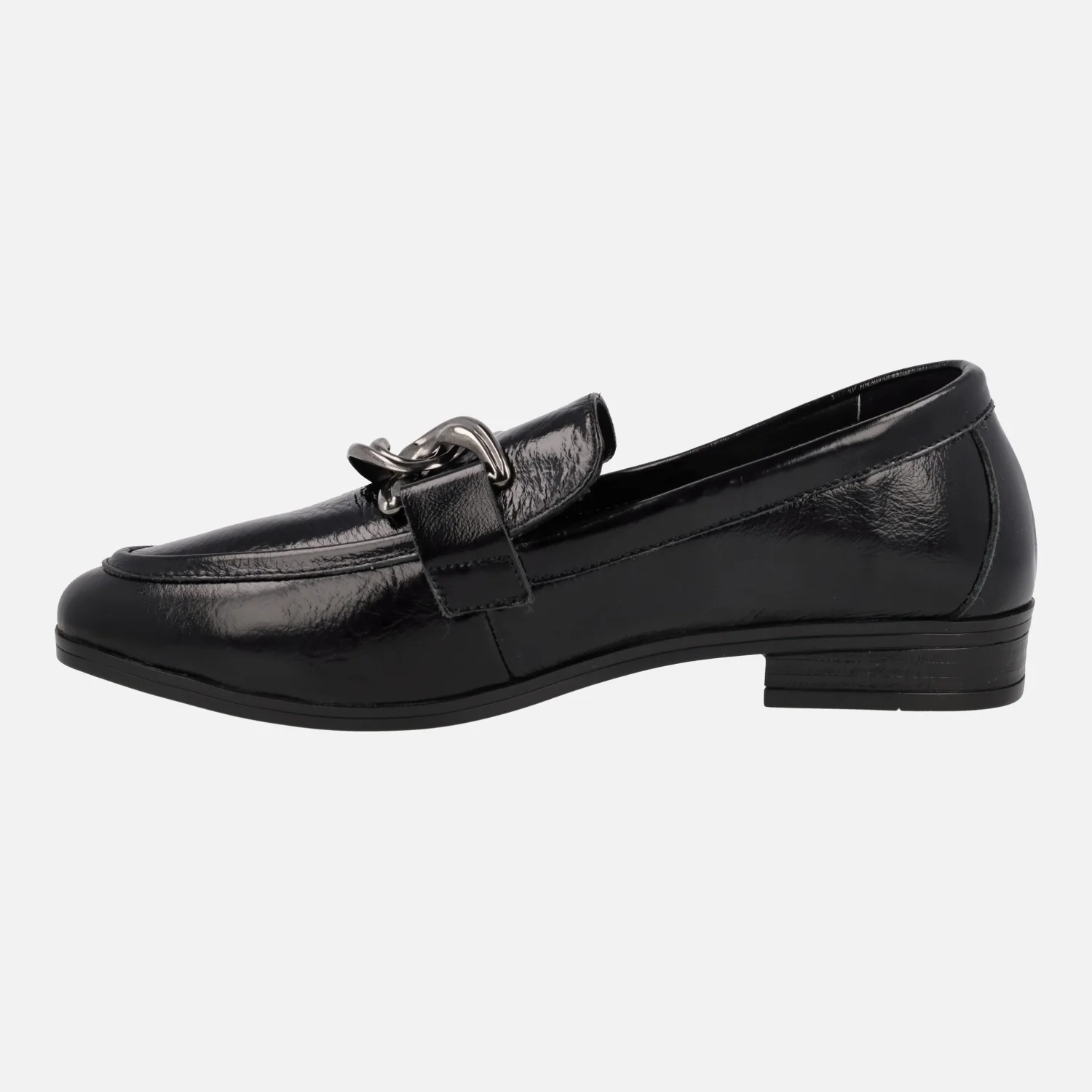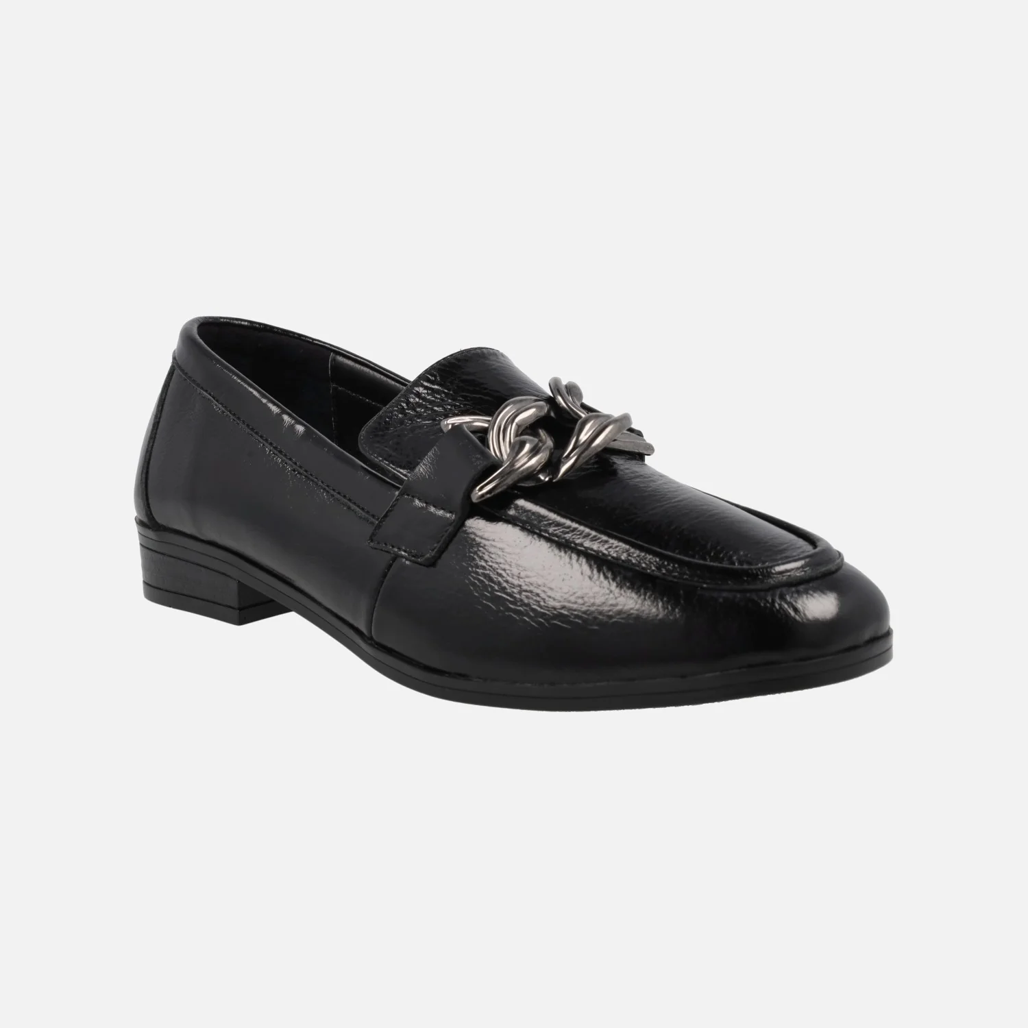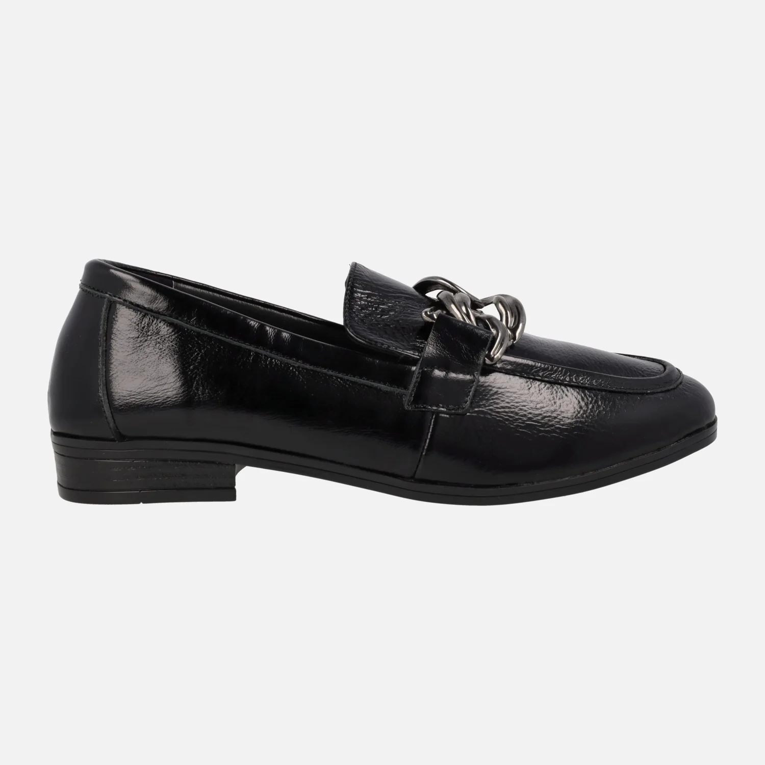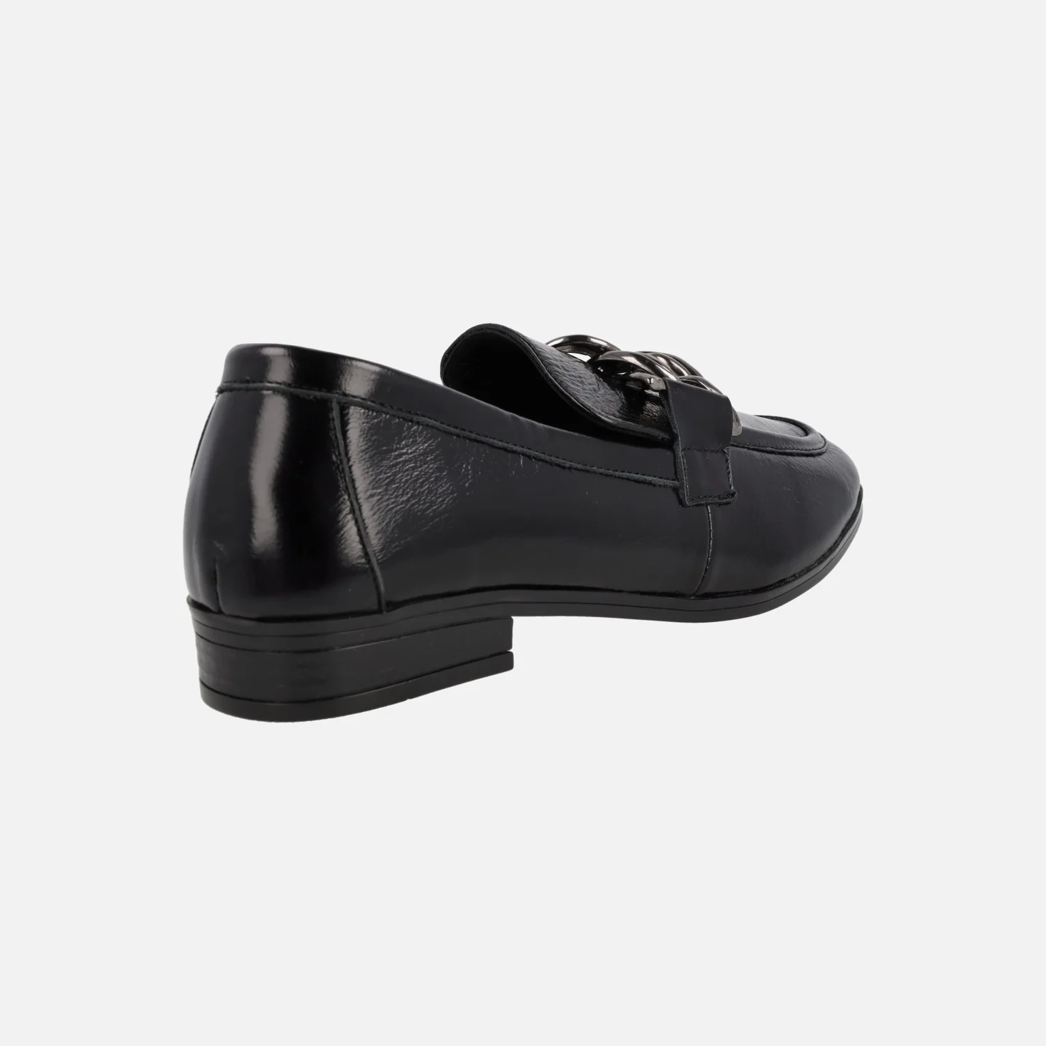 MOCASINES NEGROS DE CHAROL PARA MUJER DE LA MARCA TOP3 MODELO 23824. MOCASINES ELABORADOS EN PIEL CHAROL, CON ADORNO METÁLICO PLATEADO DE CADENA EN EL COPETE. FORRO Y PLANTA DE PIEL. PISO DE GOMA CON TACÓN DE 2,5 CMS DE ALTURA.