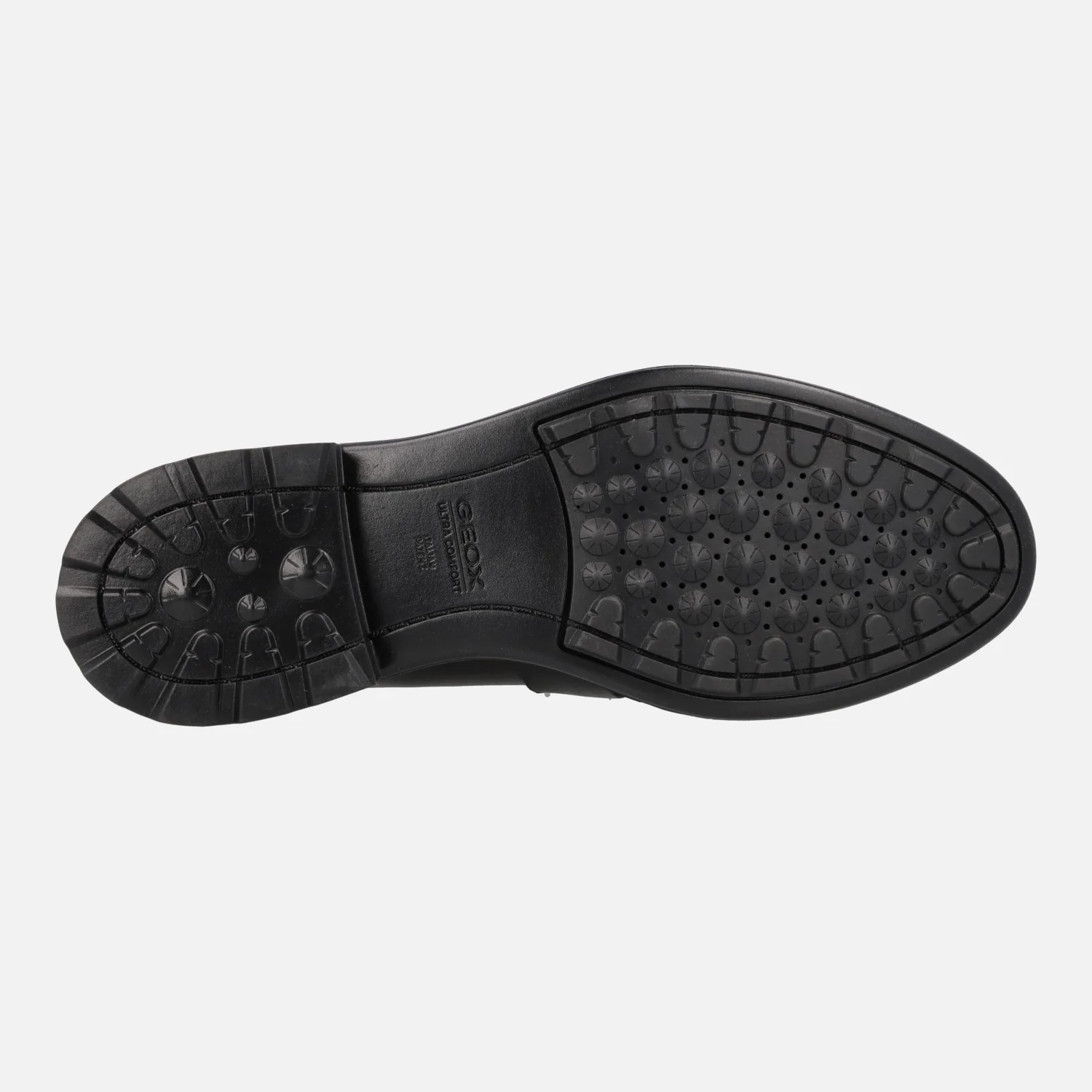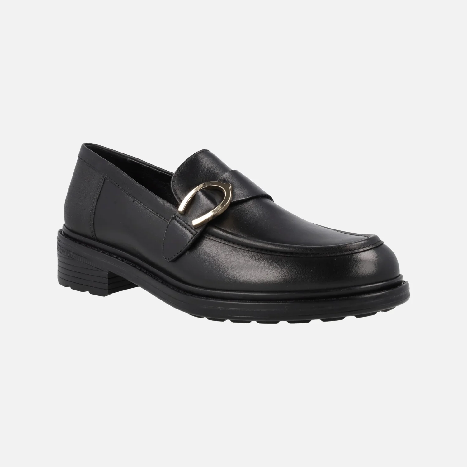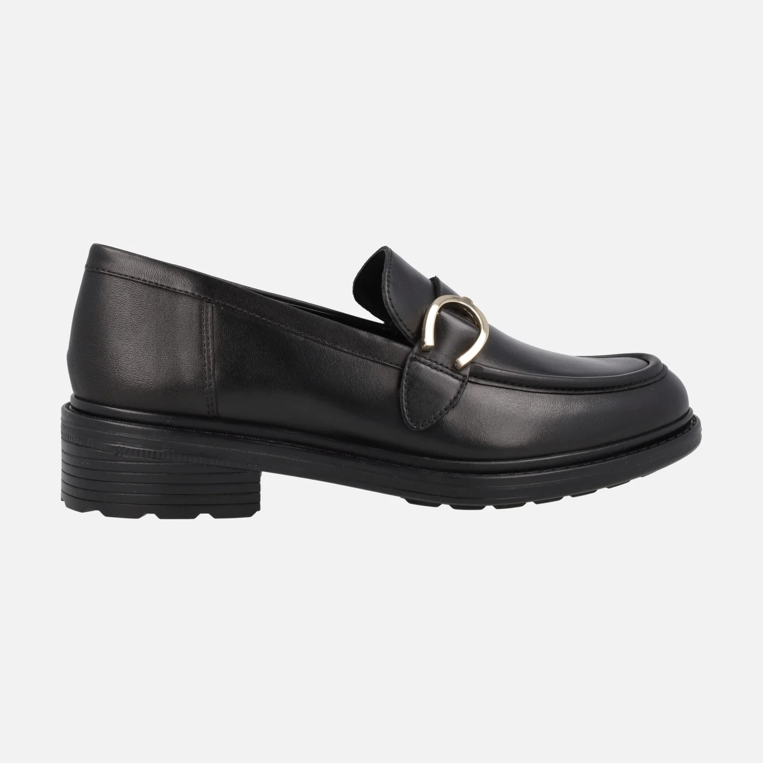 Mocasines para mujer de la marca Geox modelo D46TGC Walk Pleasure. Mocasines elaborados en piel negra con adorno metálico dorado en la pala. Interior mixto de piel y sintéticos, plantillas de piel. Piso de goma con 4 cms de altura trasera (1 cms de piso en la parte delantera). Cómodos y transpirables.