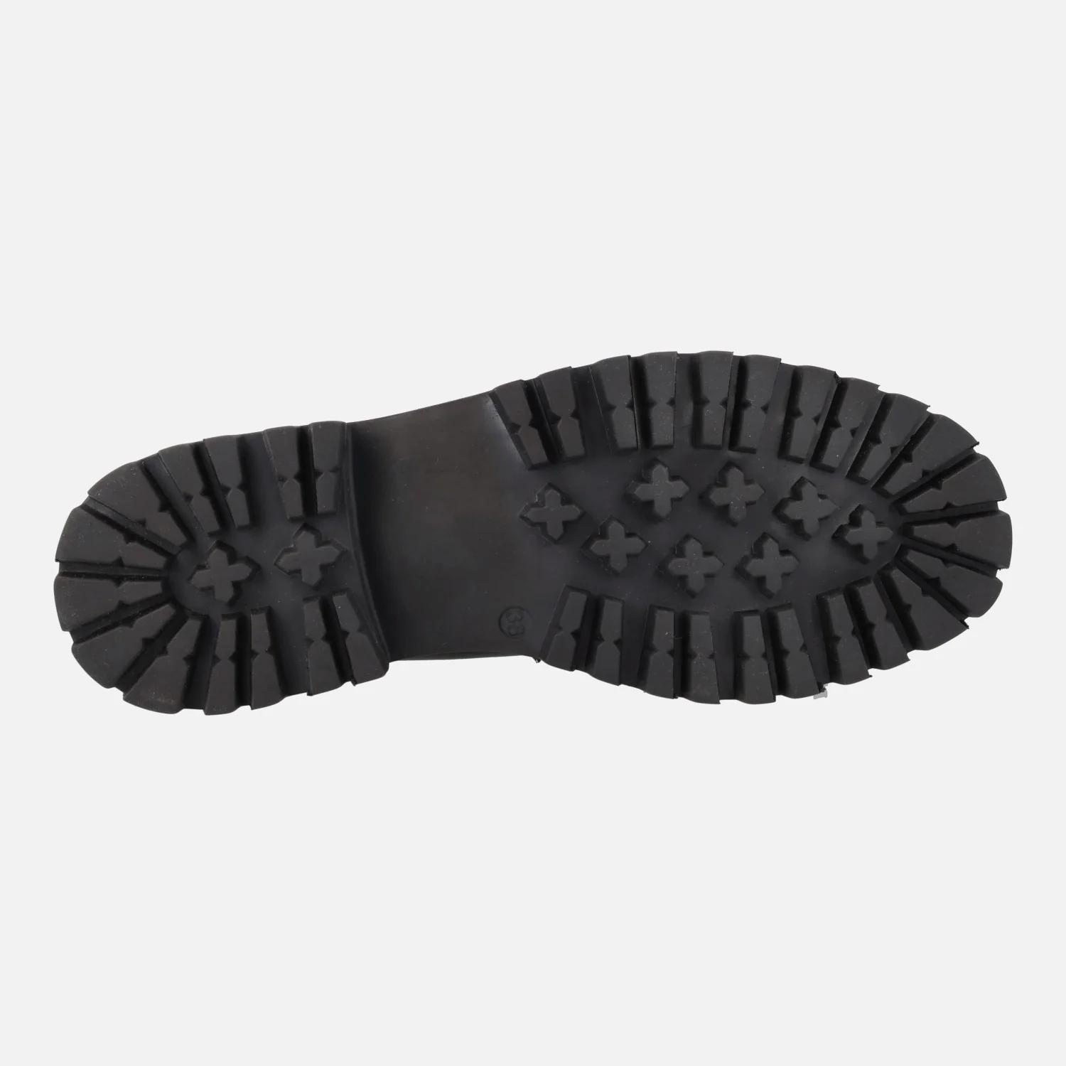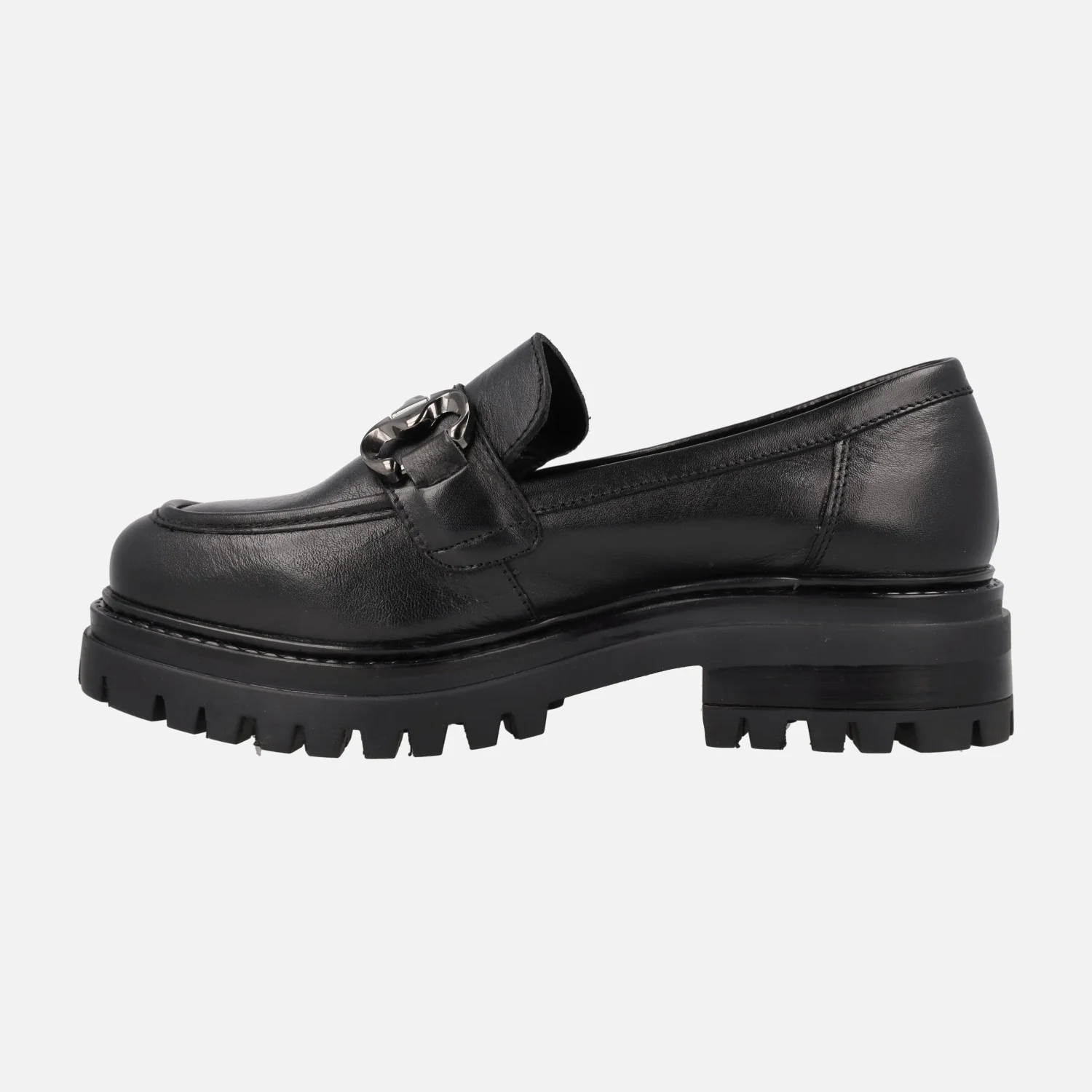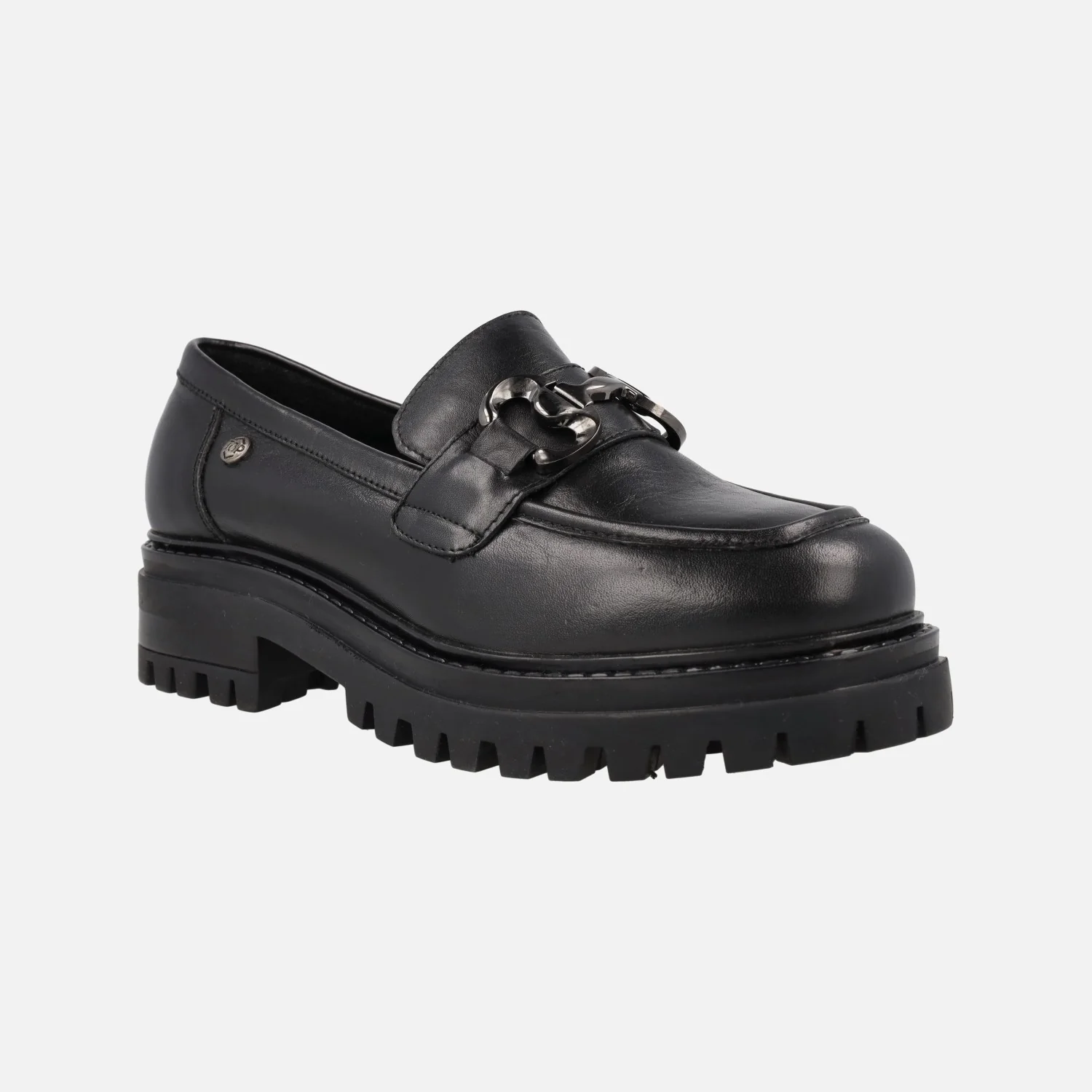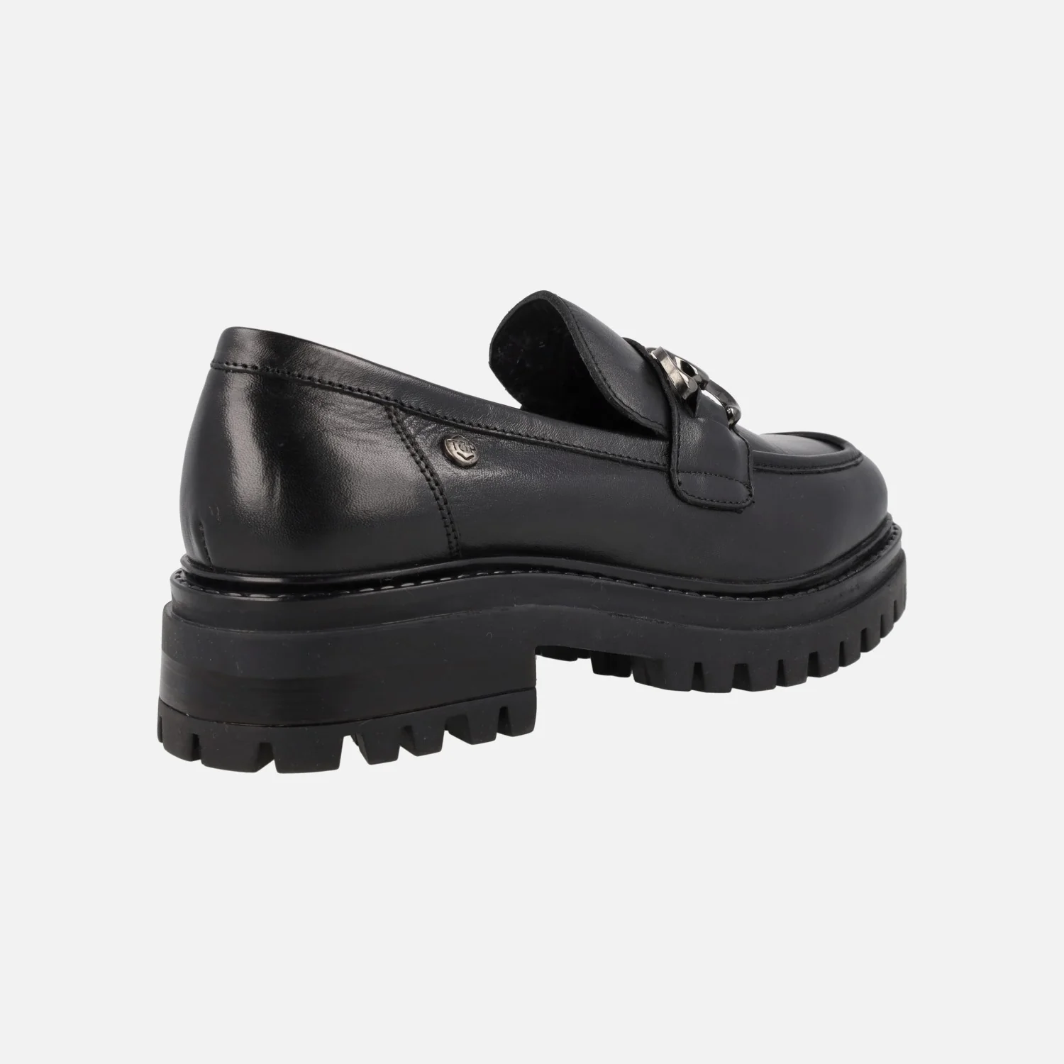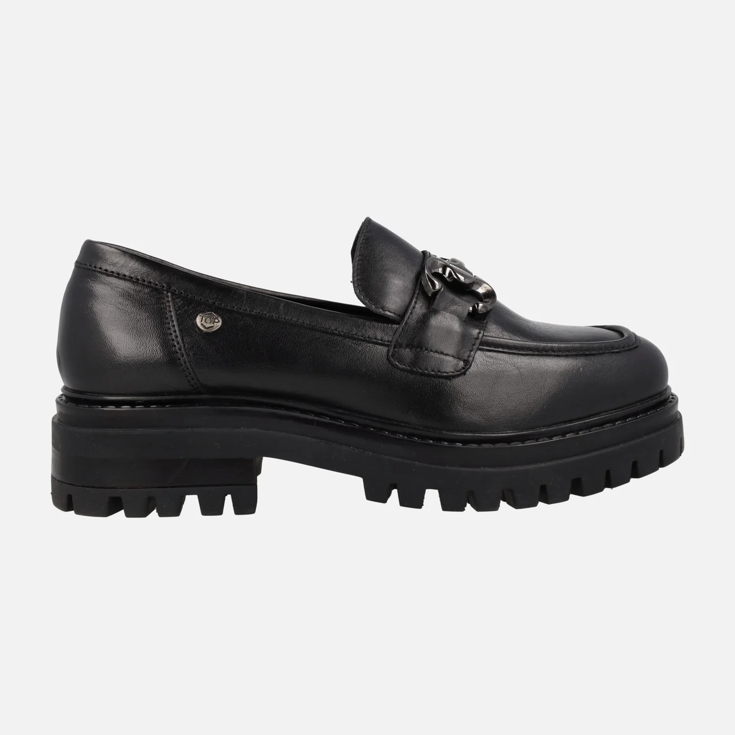Mocasines negros de piel para mujer de la marca TOP3 modelo SS24810 Negro. Mocasines de piel color negra, con adorno metálico plateado en la pala. Forro y planta de piel. Piso de goma, estilo track, de 4,5 cms de altura trasera (2,5 cms parte delantera).
