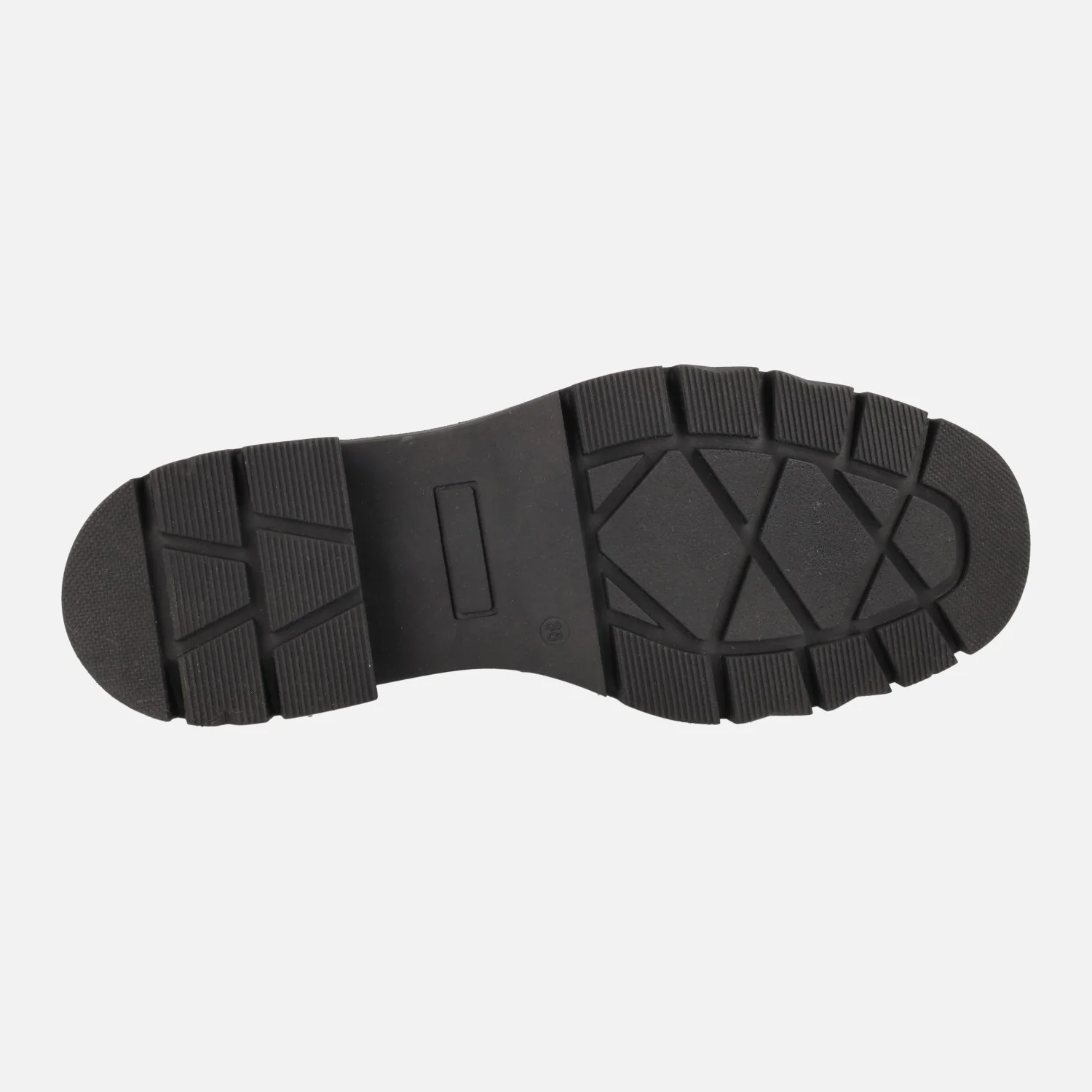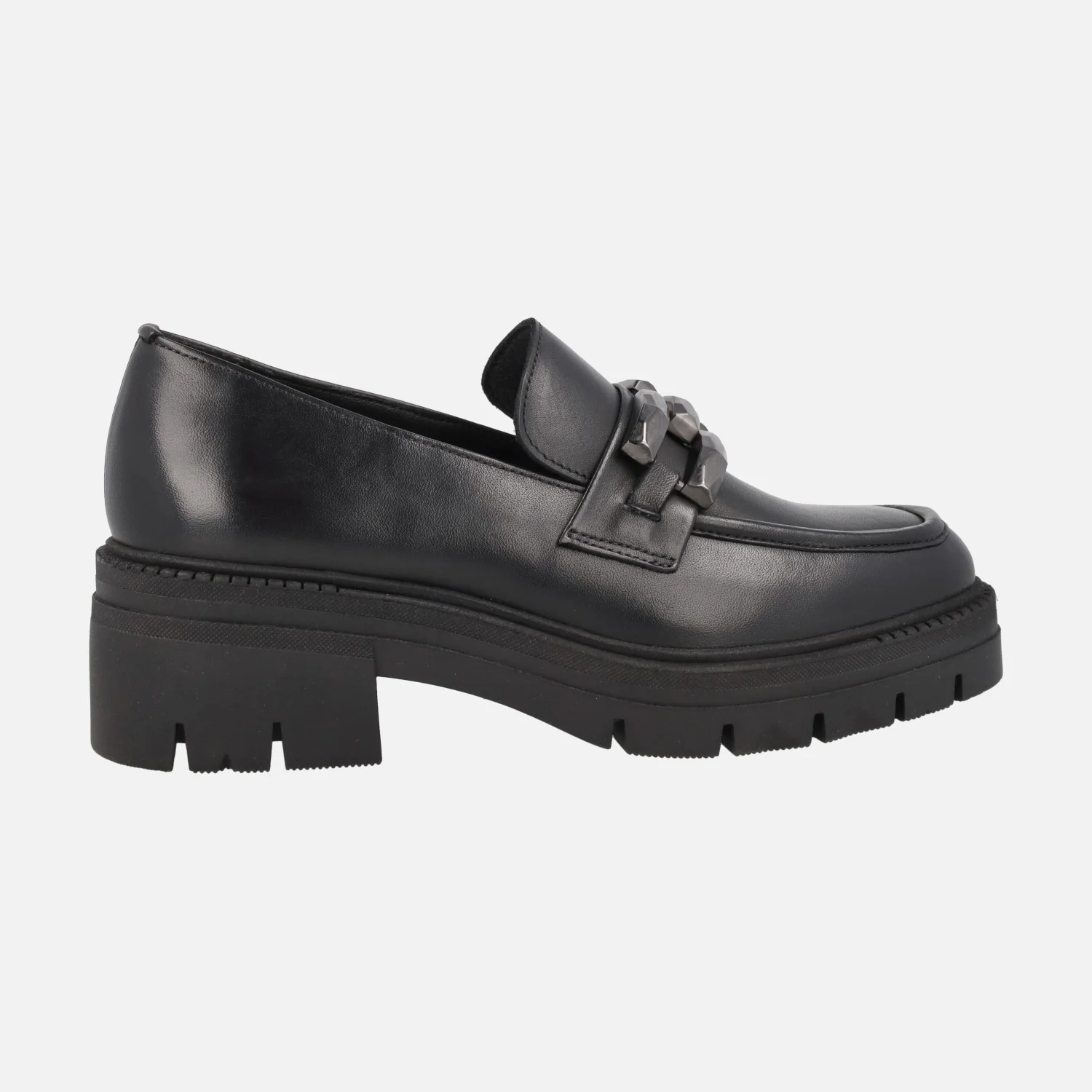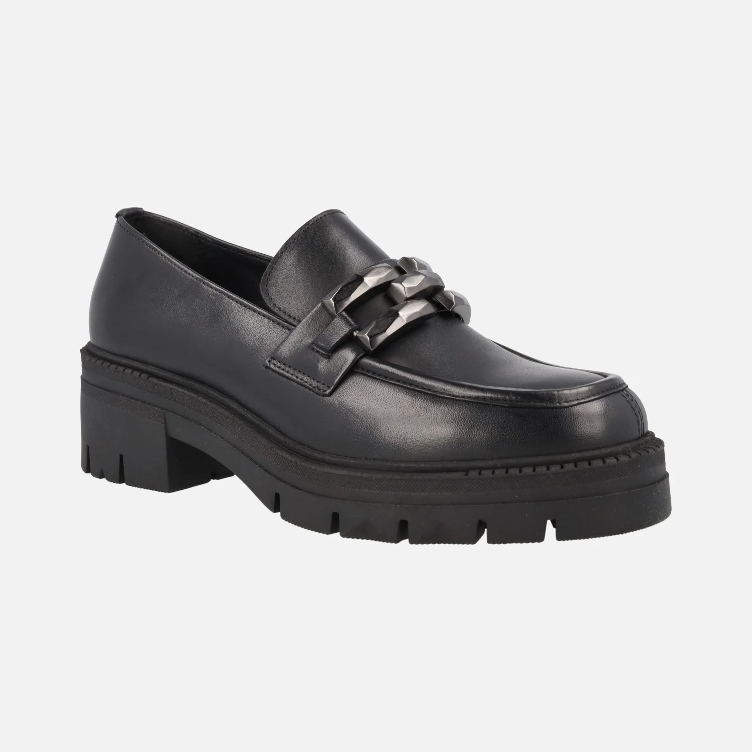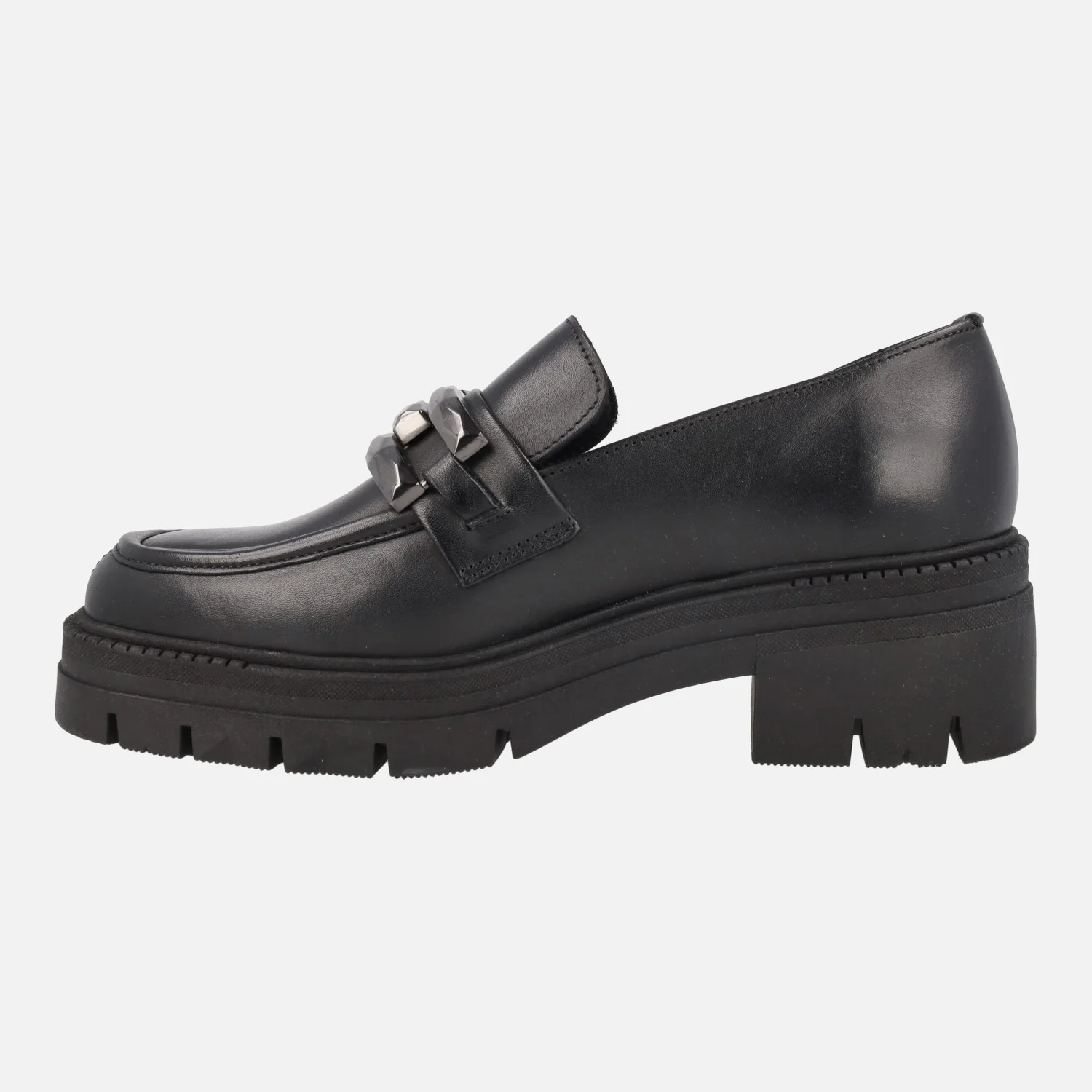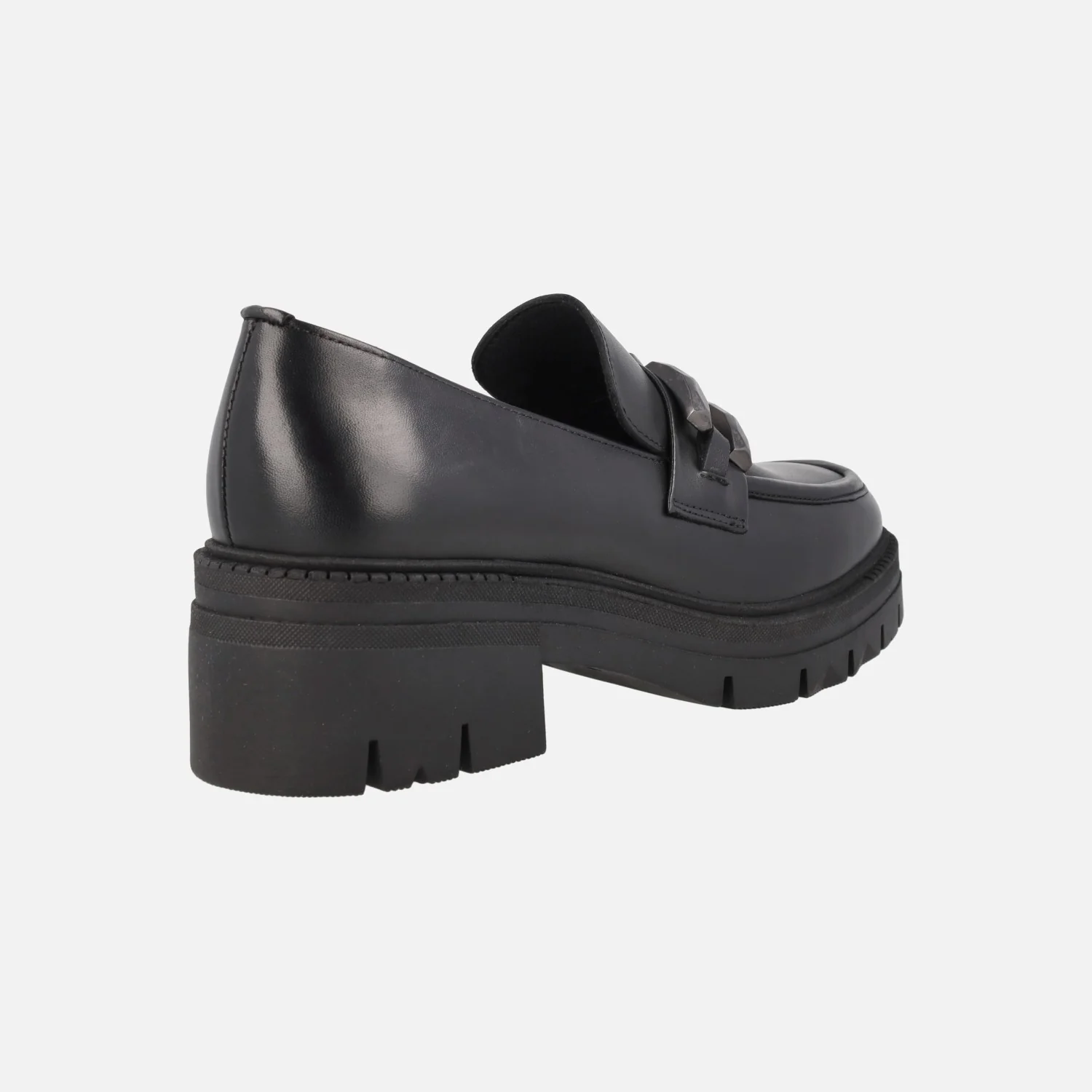 Mocasines para mujer con piso track, modelo Umbra negro de la marca Lol shoes. Mocasines negros de piel, con adorno metálico plateado en la pala. Interior mixto en piel y sintéticos. Piso de goma con tacones de 5,5 cms (2,5 cms plataforma delantera).