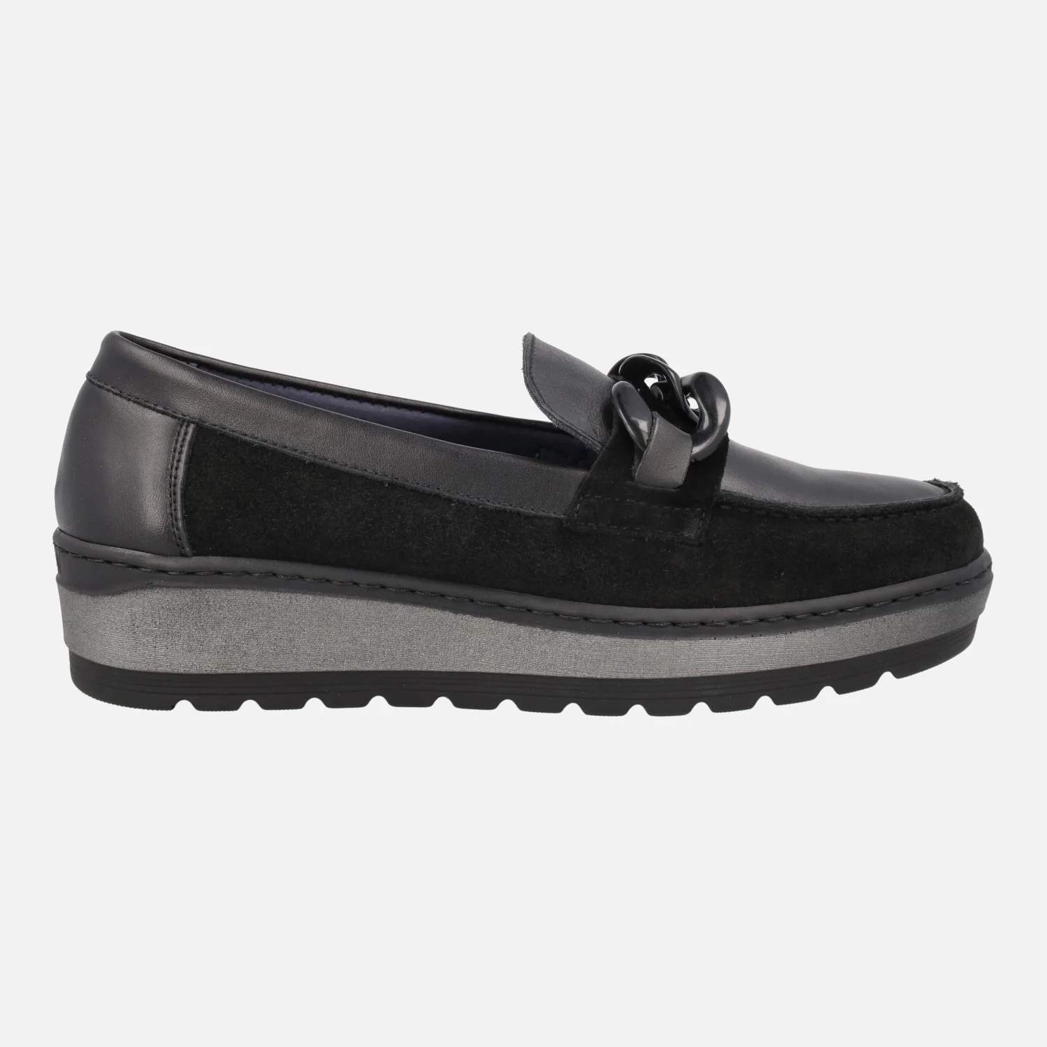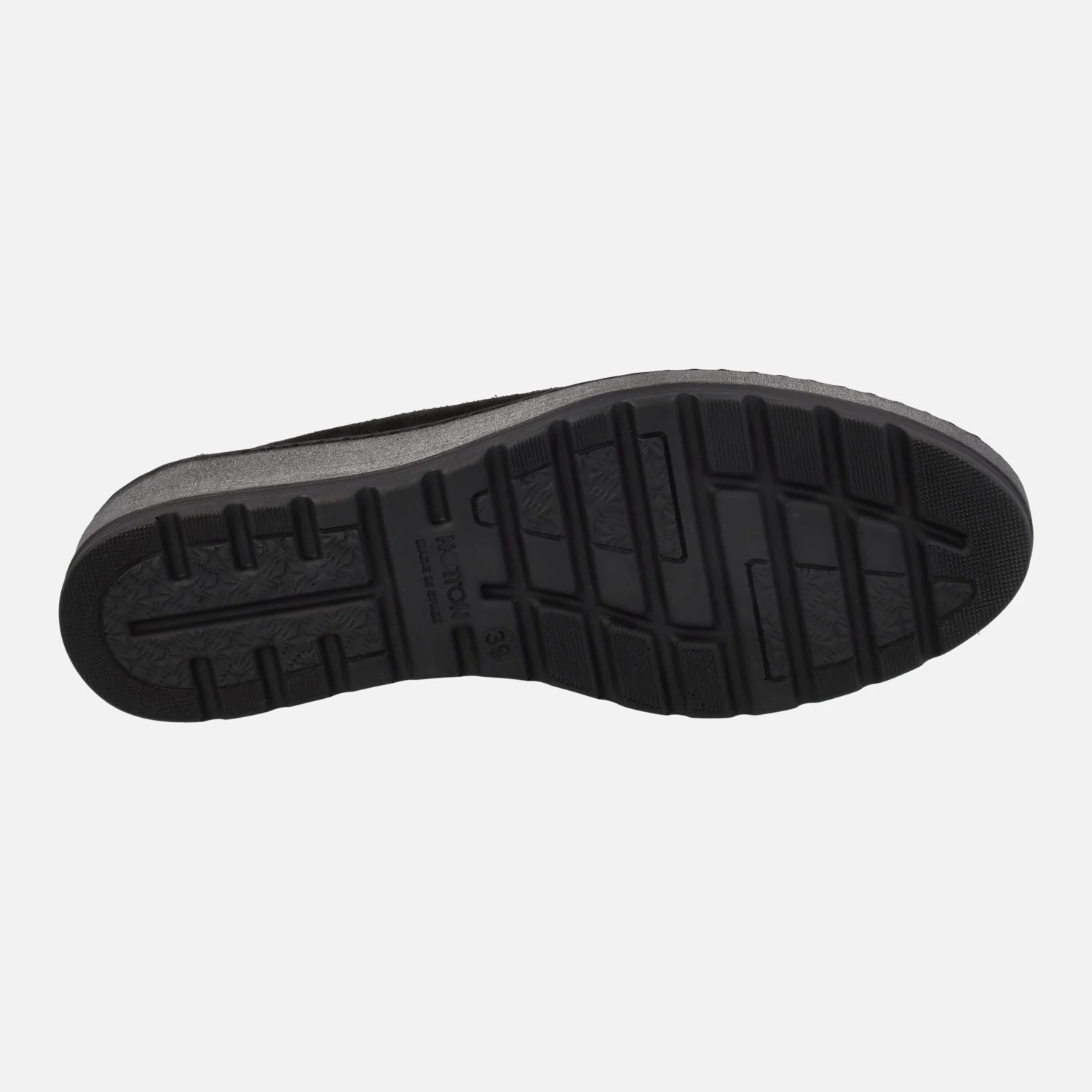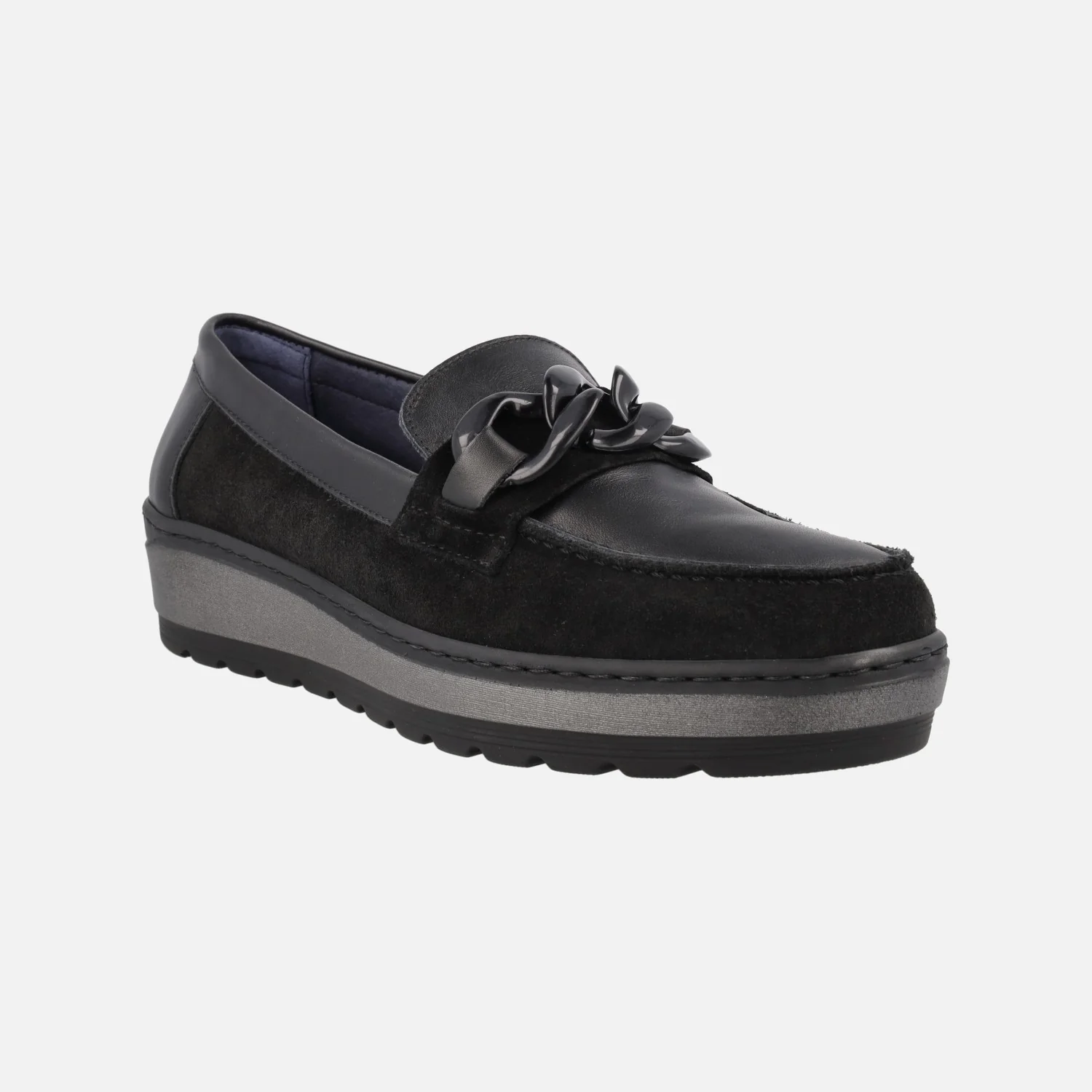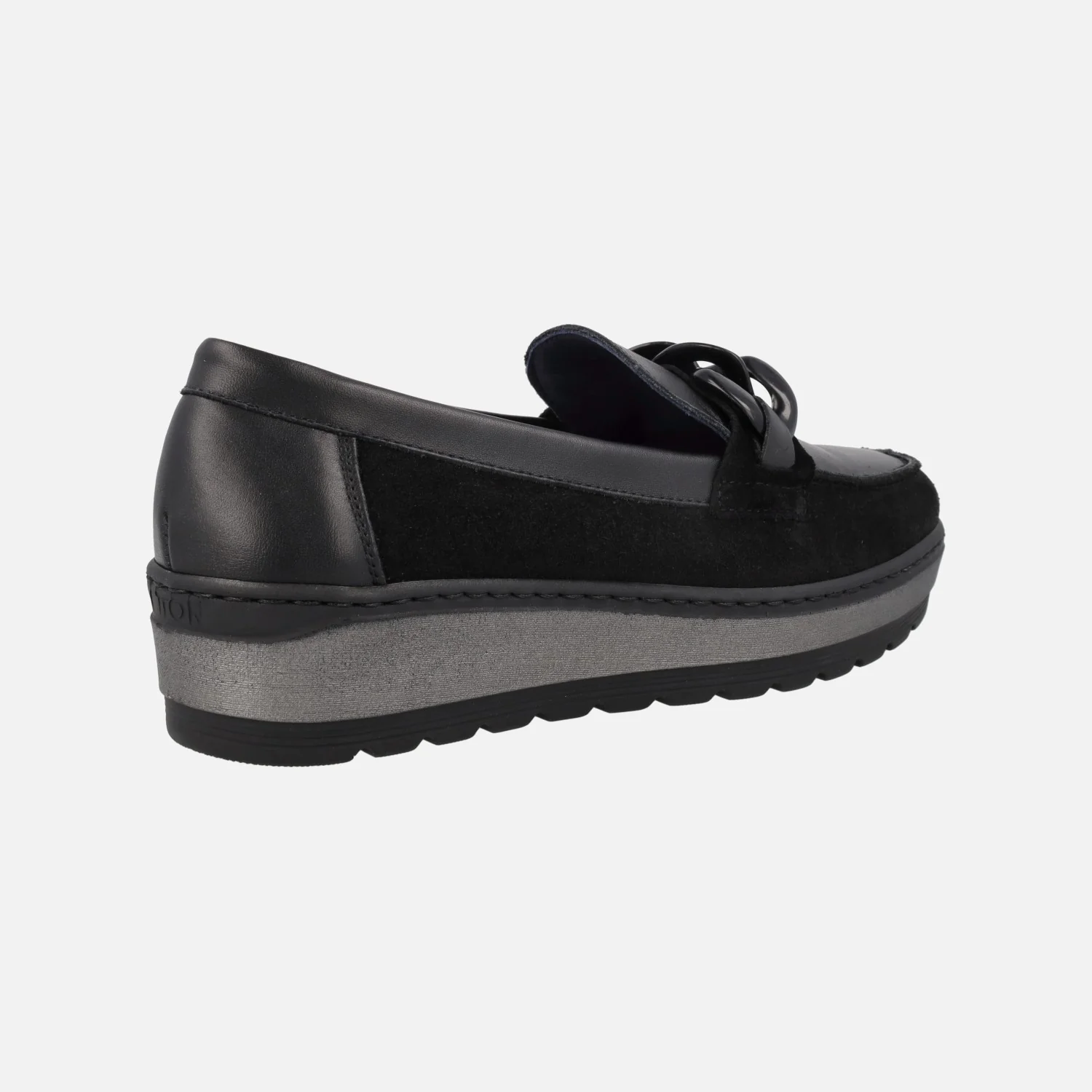 Mocasines confort para mujer de la marca española Notton, modelo 1551 Negro. Mocasines multimaterial, elaborados en combinado de piel y serraje, en color negro. Adorno de cadena de pasta en la parte superior. Interior textil, con plantillas extraíbles. Piso de goma, de 4,5 cms de altura trasera (3 cms en la parte delantera). Made in SPain.