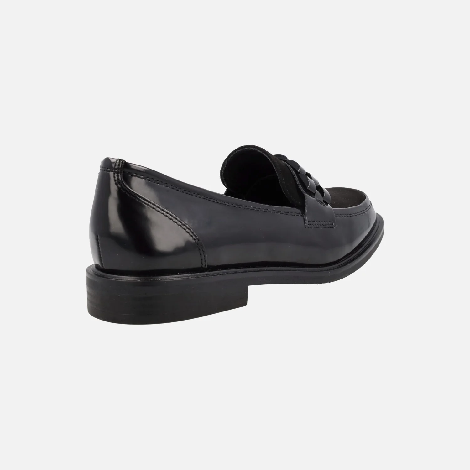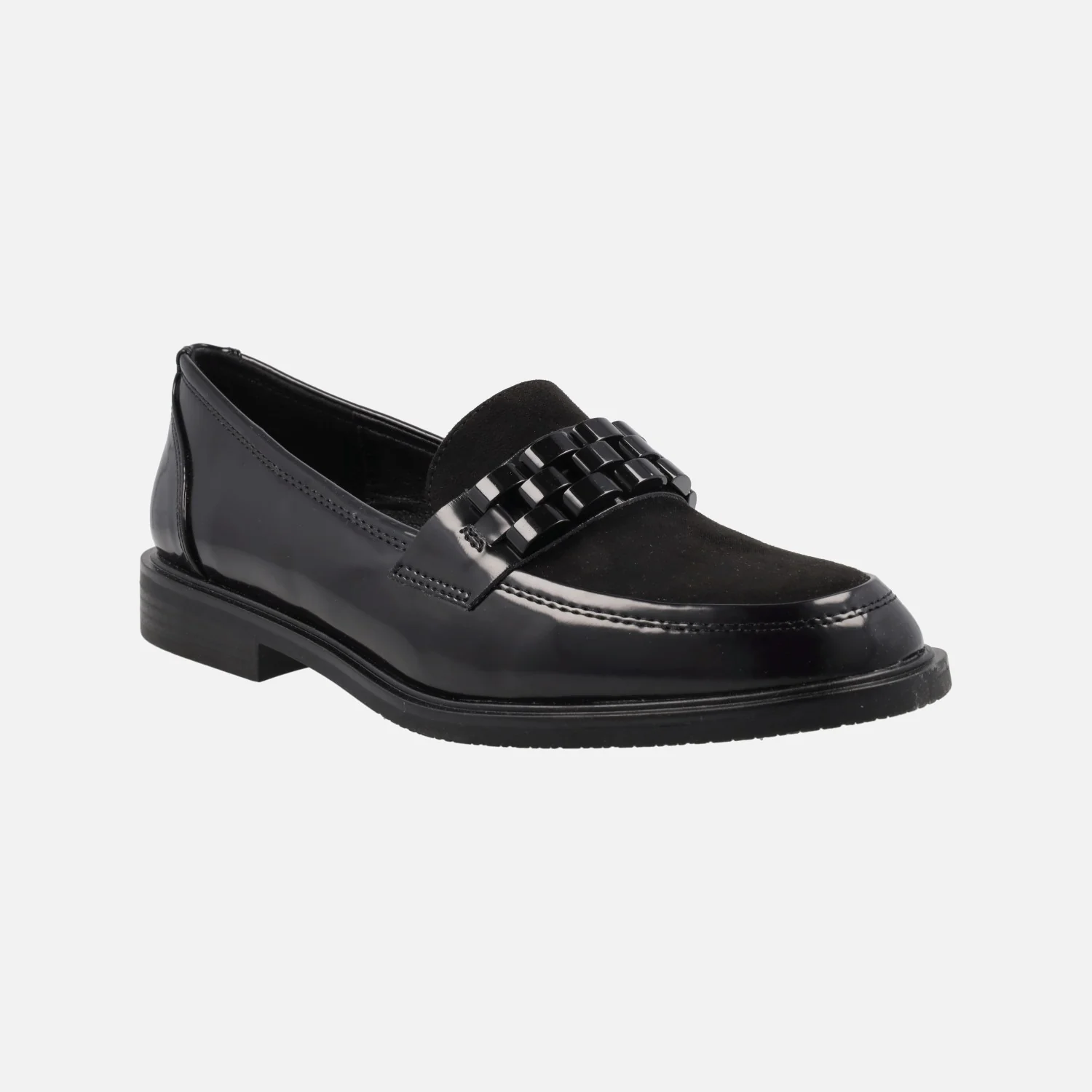 Mocasines planos para mujer de la marca Exé, modelo Violet Black. Mocasines multimaterial, elaborados en materiales sintéticos, con pala imitando ante y lo demás en antik brillo. Adorno en la pala. Interior mixto de piel y sintéticos. Piso de goma, de aproximadamente 2,5 cms de tacón.