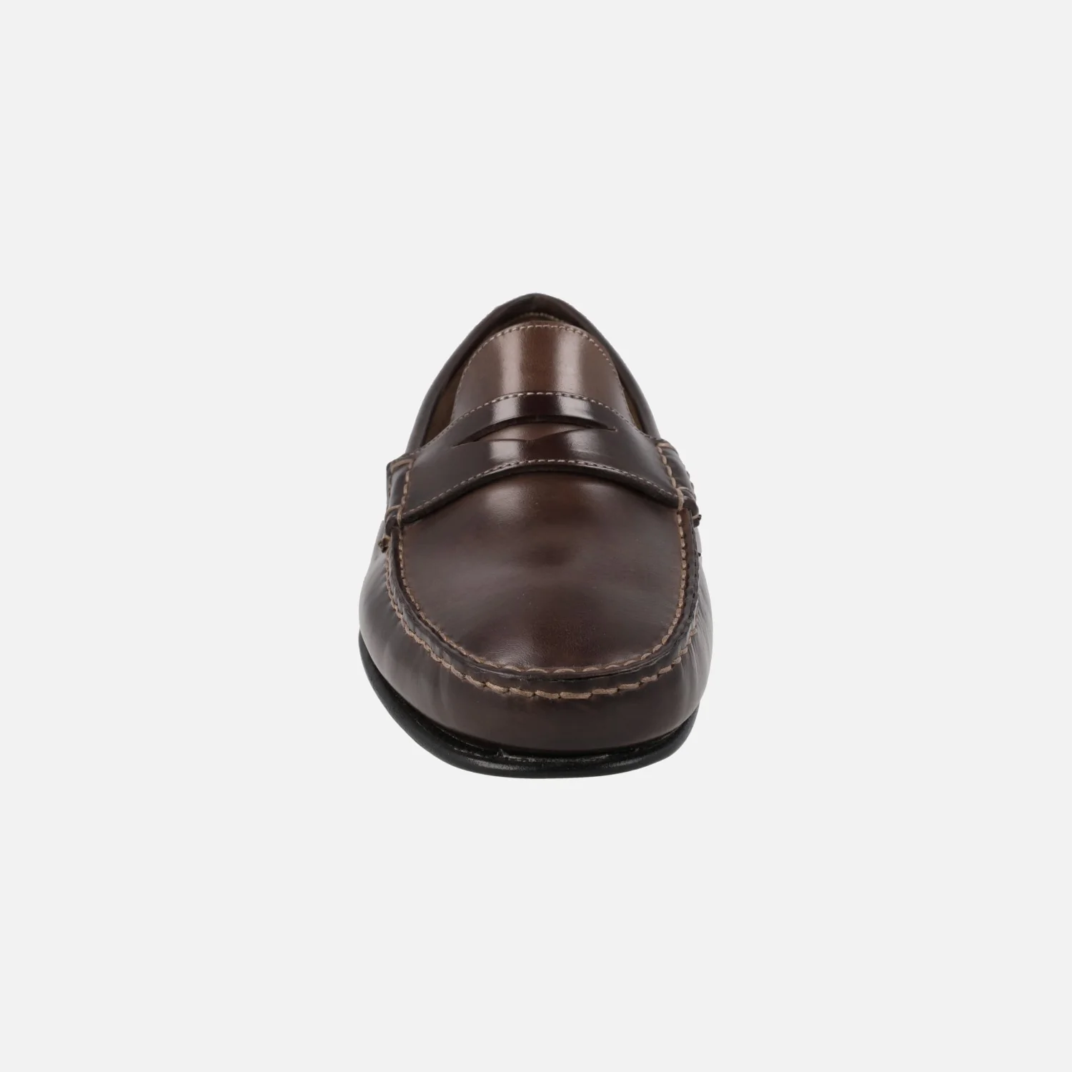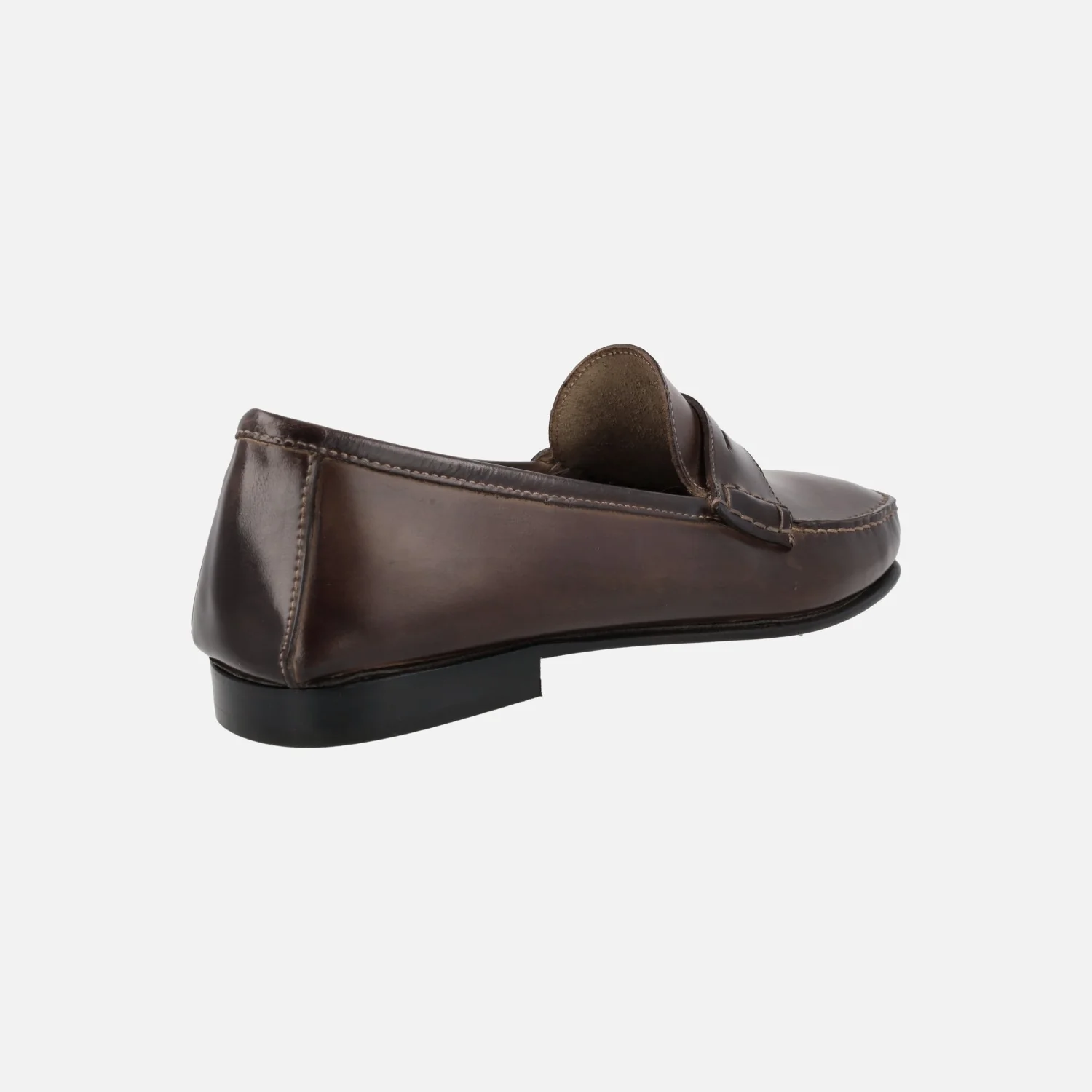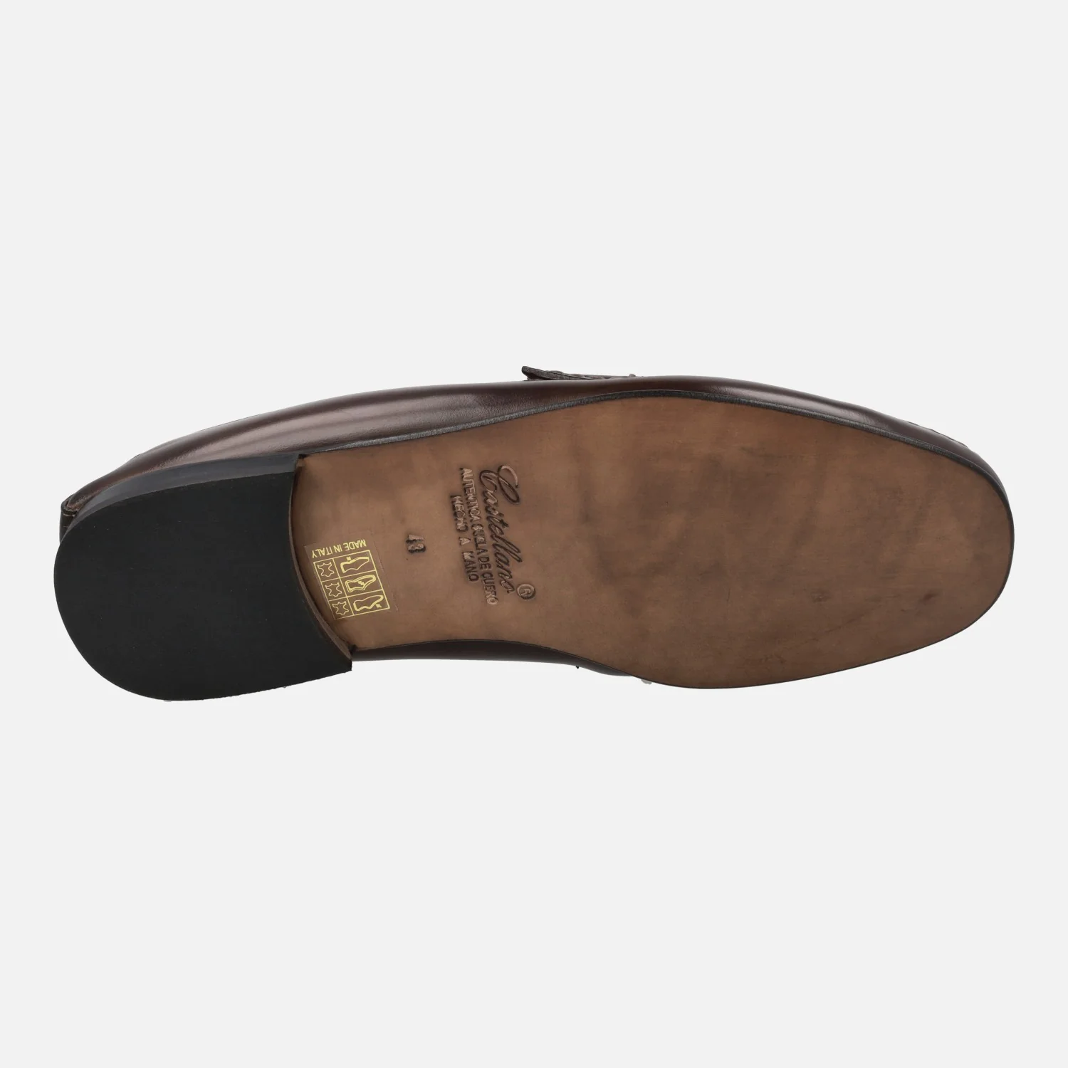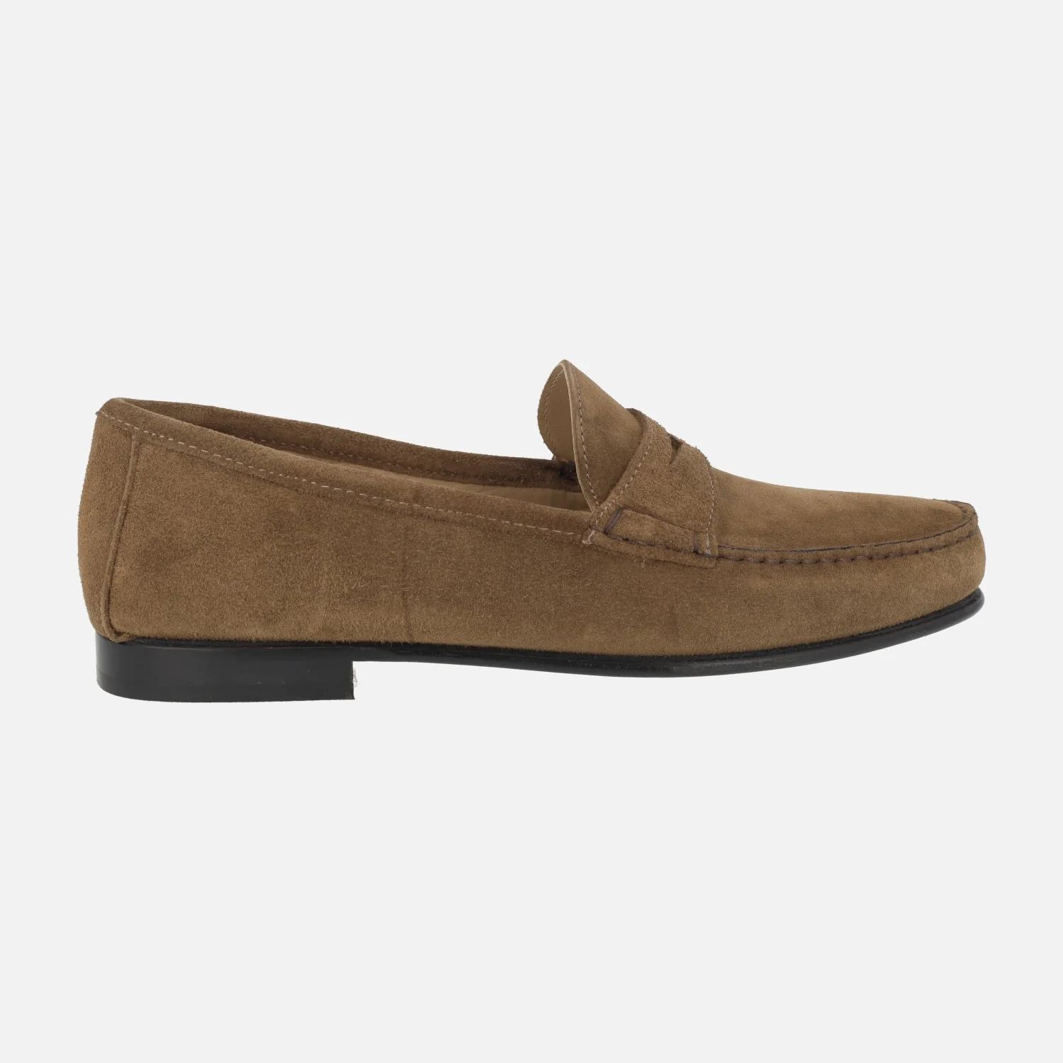 Mocasines para hombre con adorno de antifaz de la marca Castellanos de Madrid, modelo Paolo. Zapatos mocasines elaborados en piel marrón o en serraje snuff (ante marrón). Interiores en piel. Suela de cuero. Made in Spain