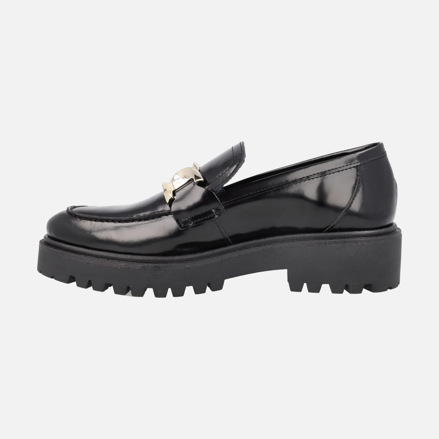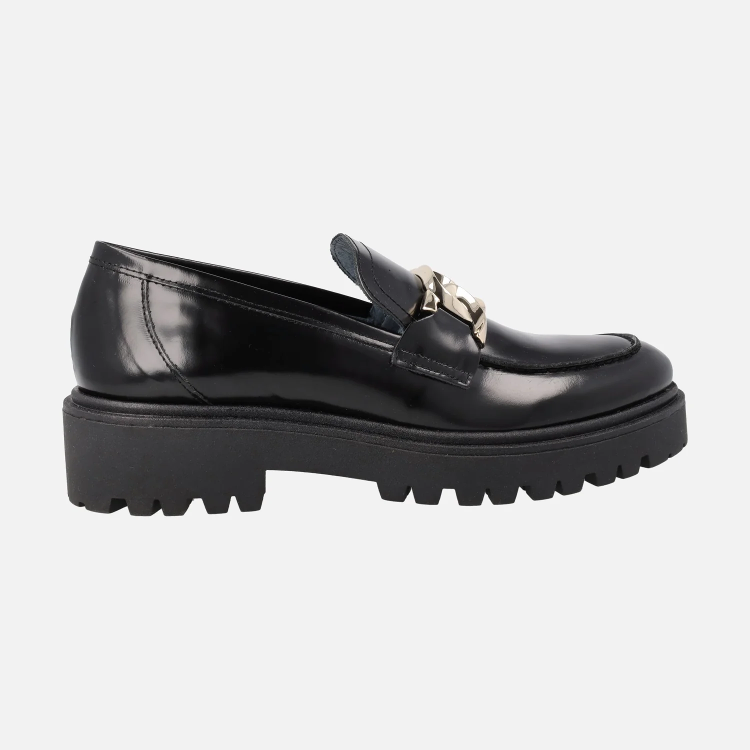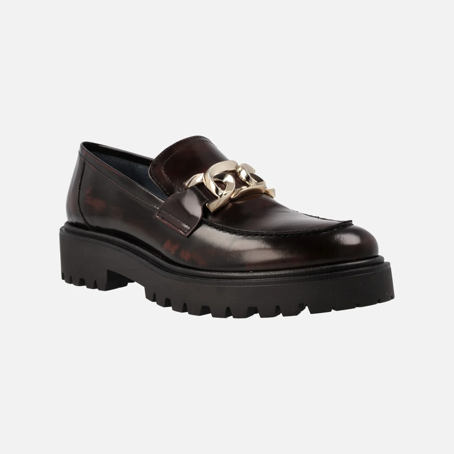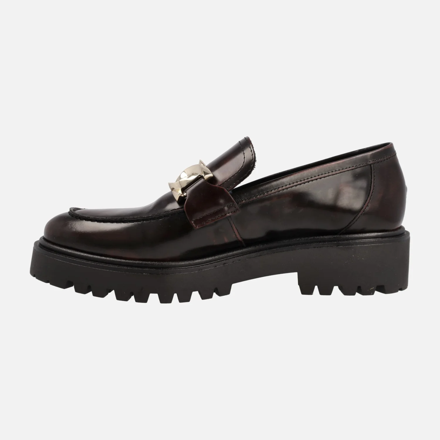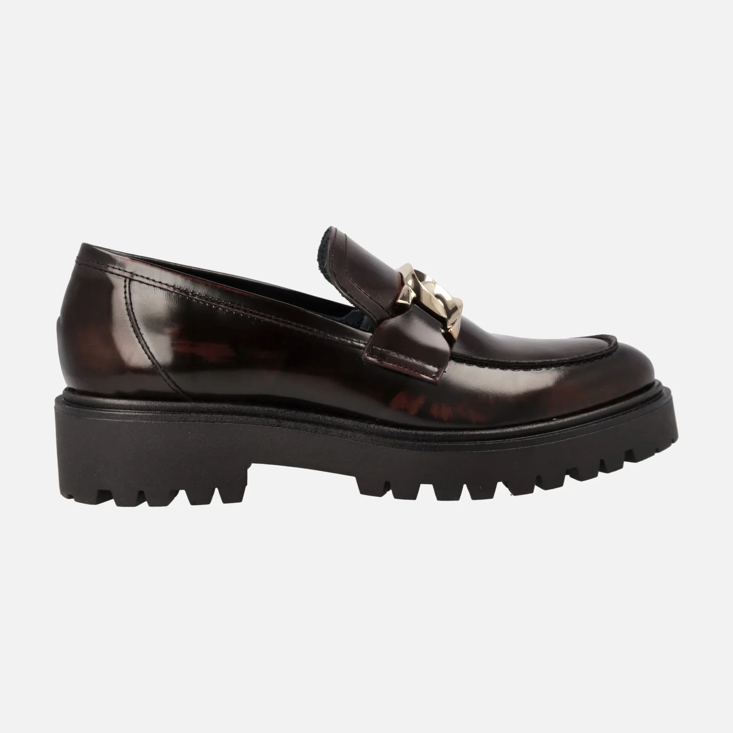 Zapatos mocasines para mujer de la marca Bryan Stepwise, modelo 4322, disponibles en florentik negro o burdeos. Mocasines con piso volúmen, elaborados en piel florentik (brillo) con adorno de cadena metálica en la pala. Forro mixto de piel y tejido, plantillas de piel. Piso track de goma, con 4 cms de altura trasera y 2,5 cms en la parte delantera. Made in Spain.