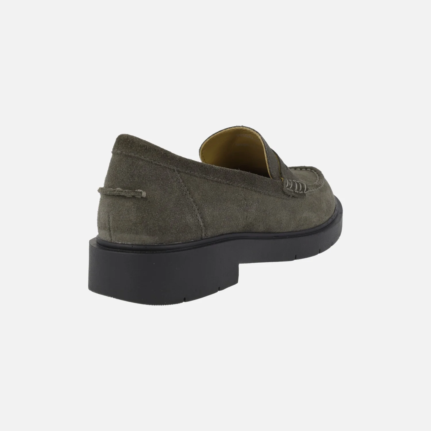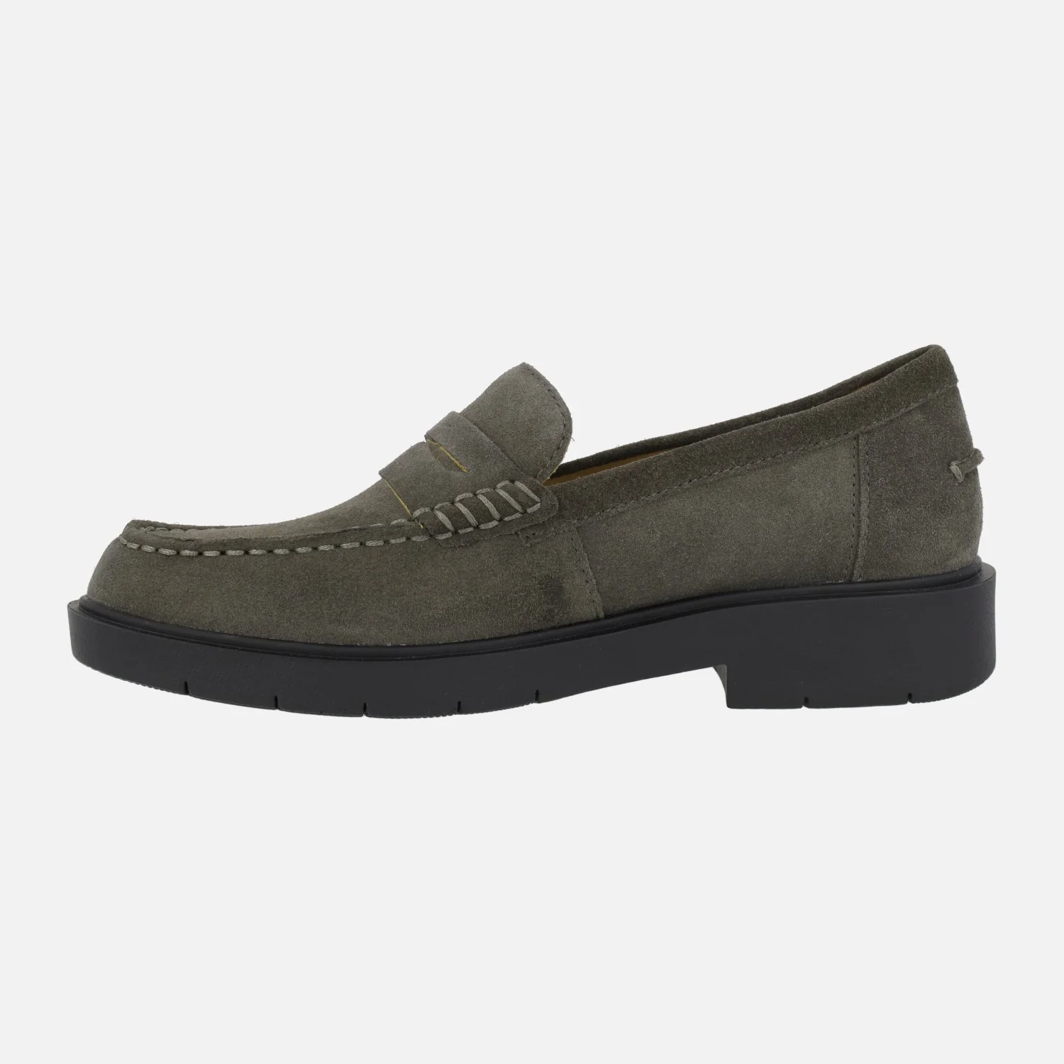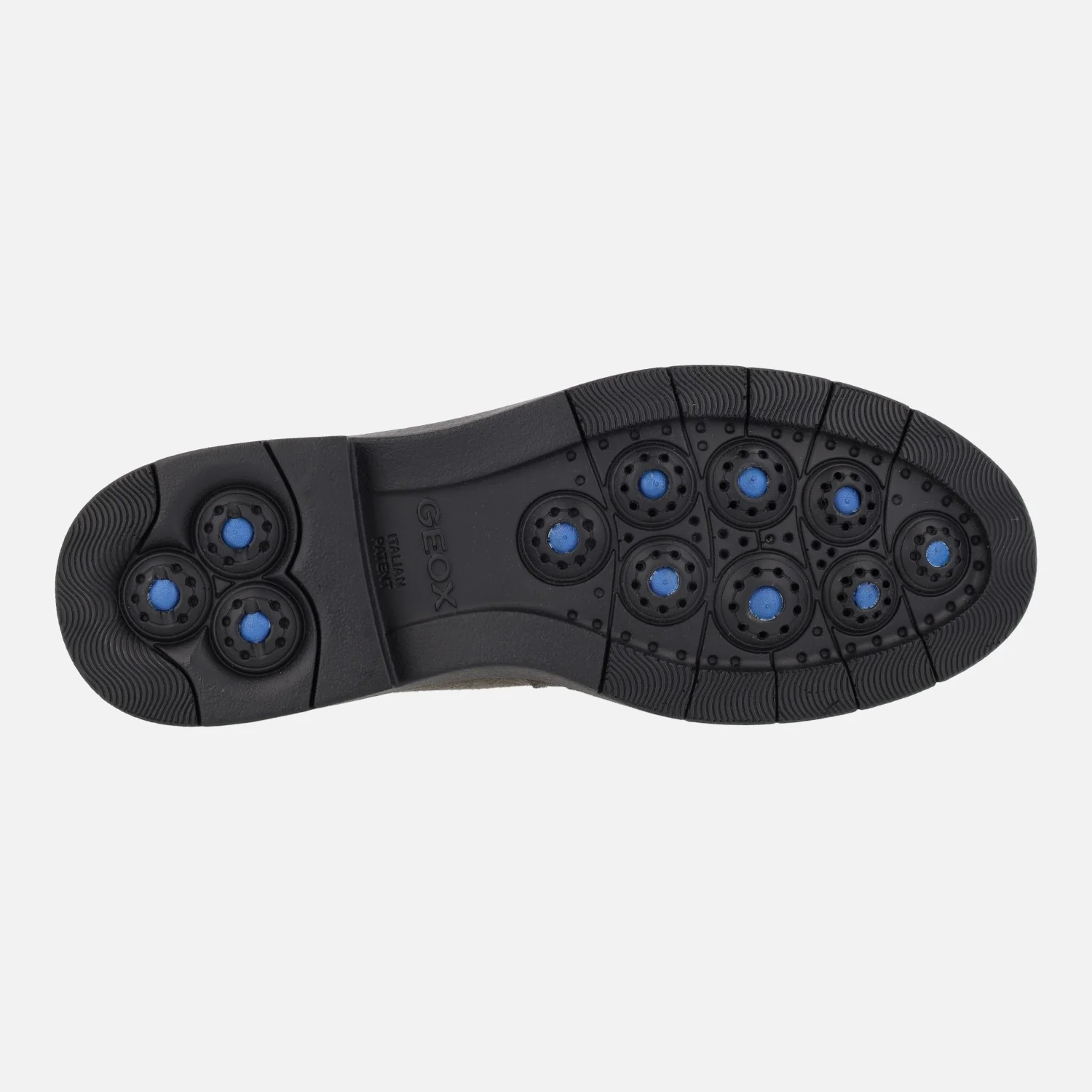 Mocasines para mujer con adorno de antifaz de la marca Geox, modelo D25QRA Spherica EC1, disponibles en piel negra o en ante gris oscuro. Zapatos de estilo masculino, piso de goma con tecnología Zero Shock System, de esferas ultramullidas y gran amortiguación. Muy ligeros. Interior mixto de piel y otros materiales (80% cuero 20% sintéticos), plantillas de piel 100%, extraíbles. Muy transpirables. Altura de 3 cms en la parte trasera (1 cm parte delantera). Geox, italian made.