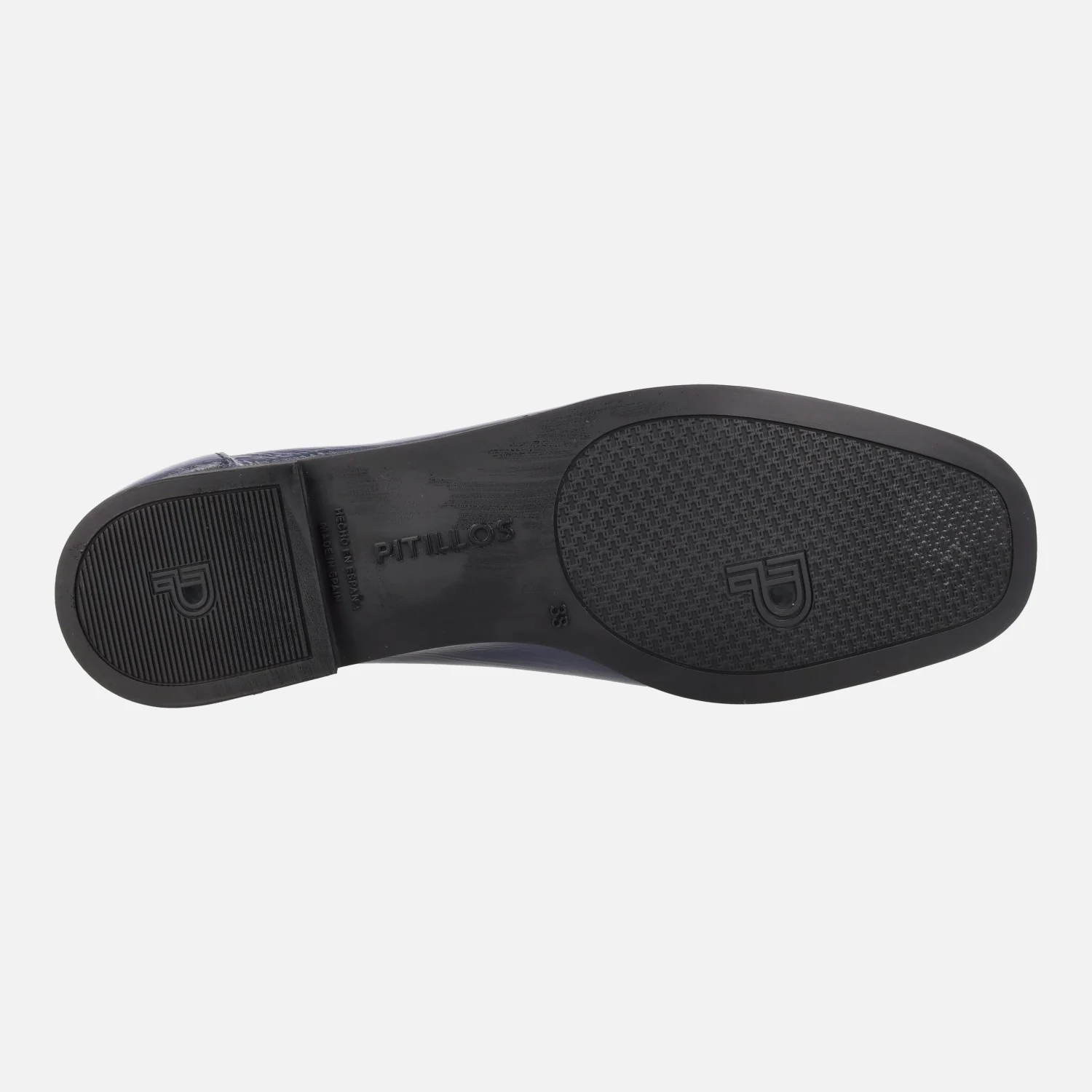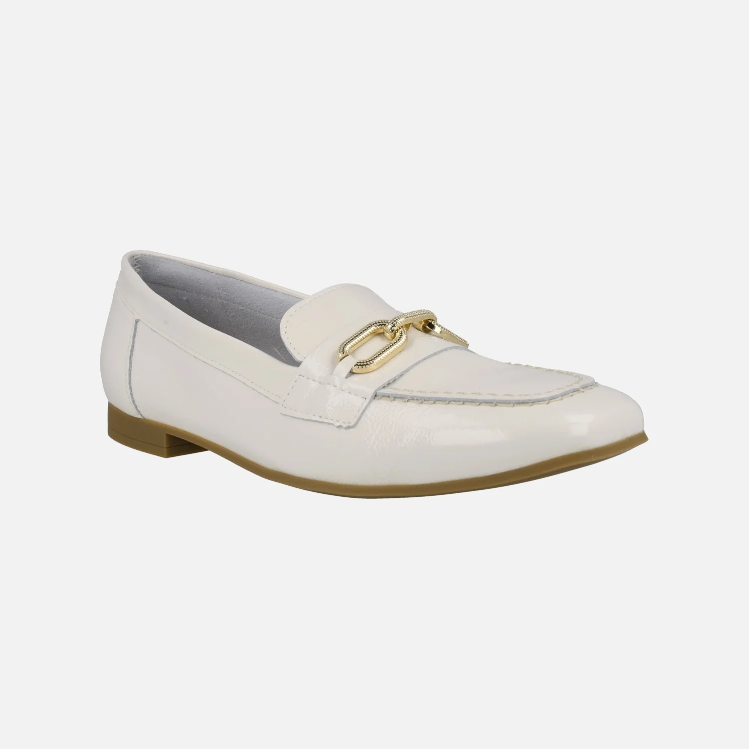 Elegantes mocasines en piel charol de la marca Pitillos, modelo 10474 disponibles en azul marino y en glacial (blanco roto). Mocasines de piel charol, con adorno de cadena metálica dorada en la pala. Interior textil. Piso plano, de apenas 1cm de tacón. Made in Spain.