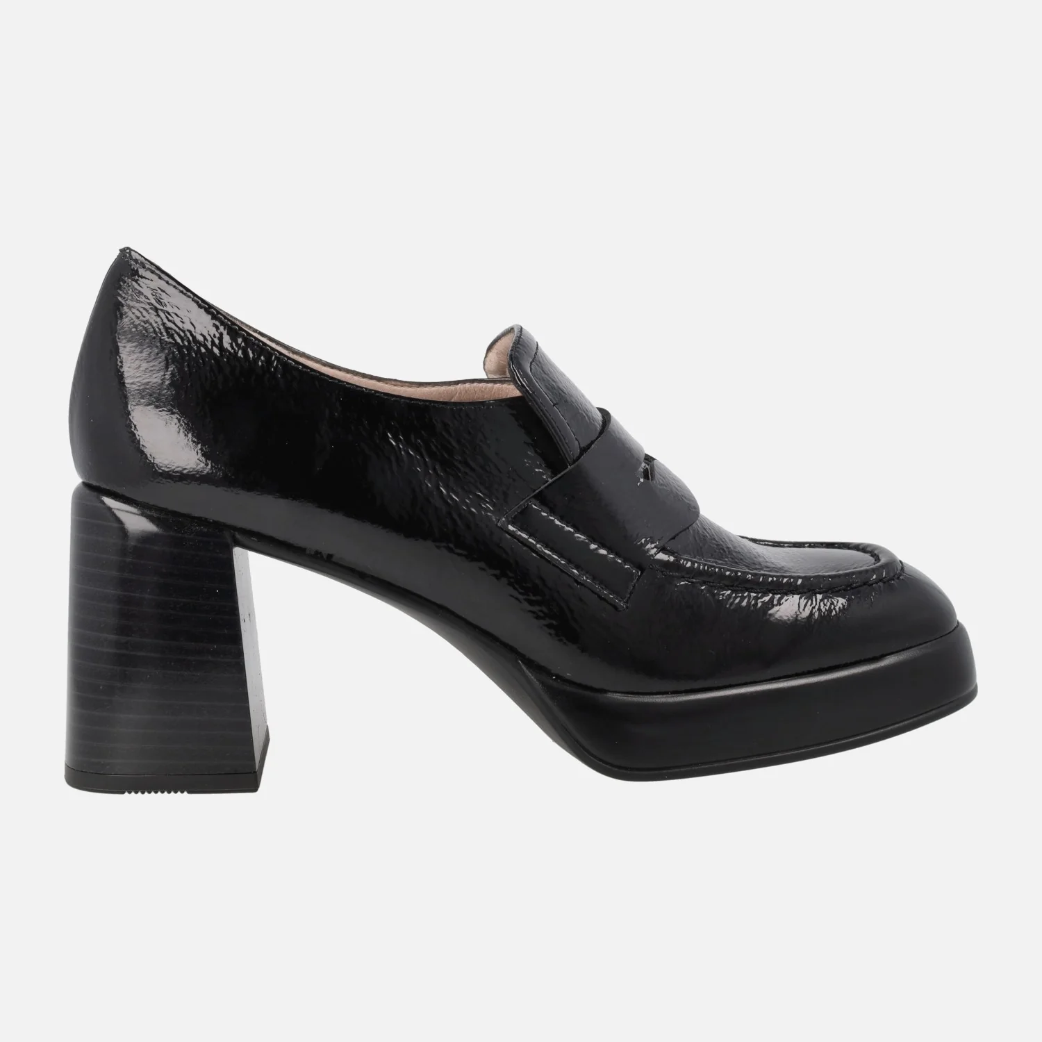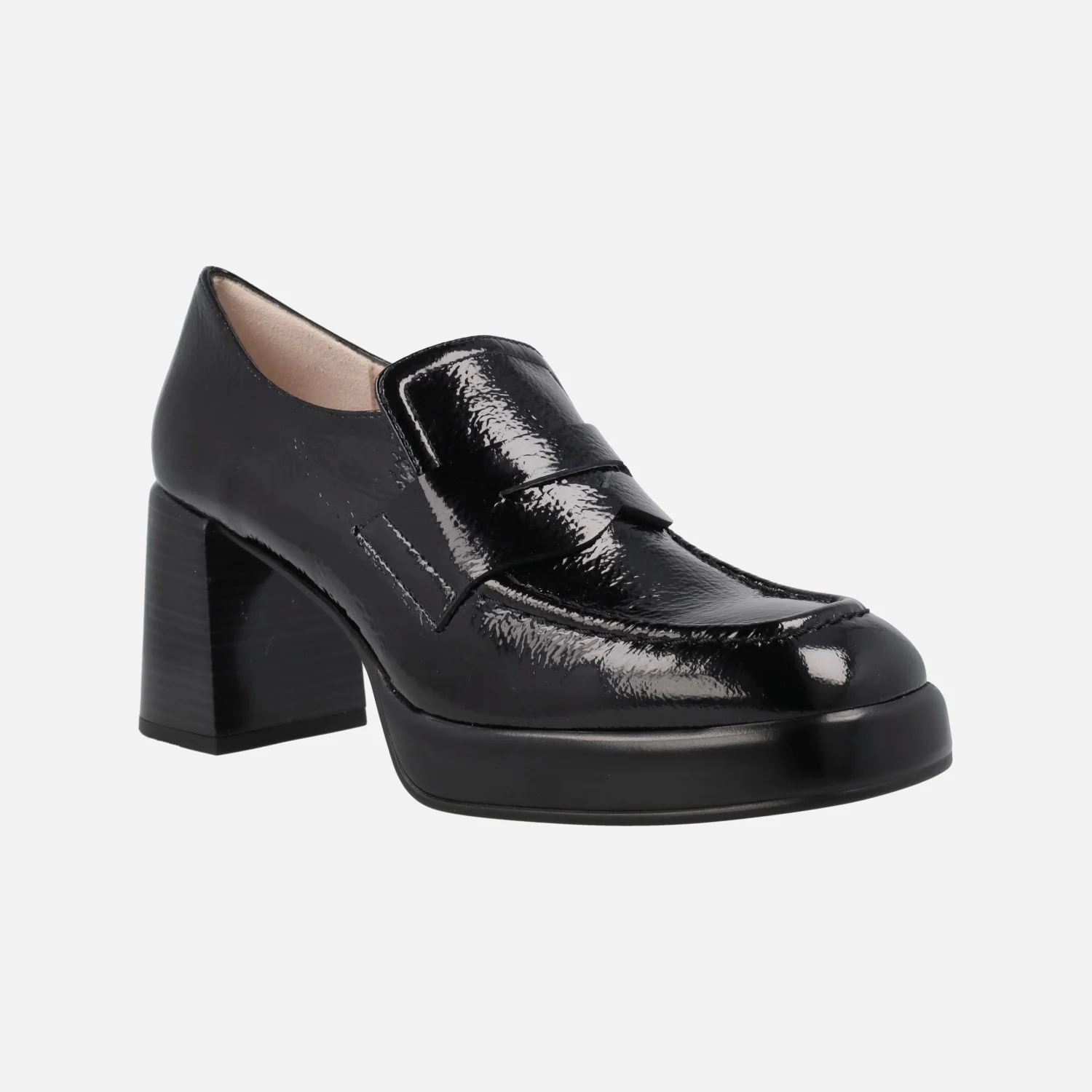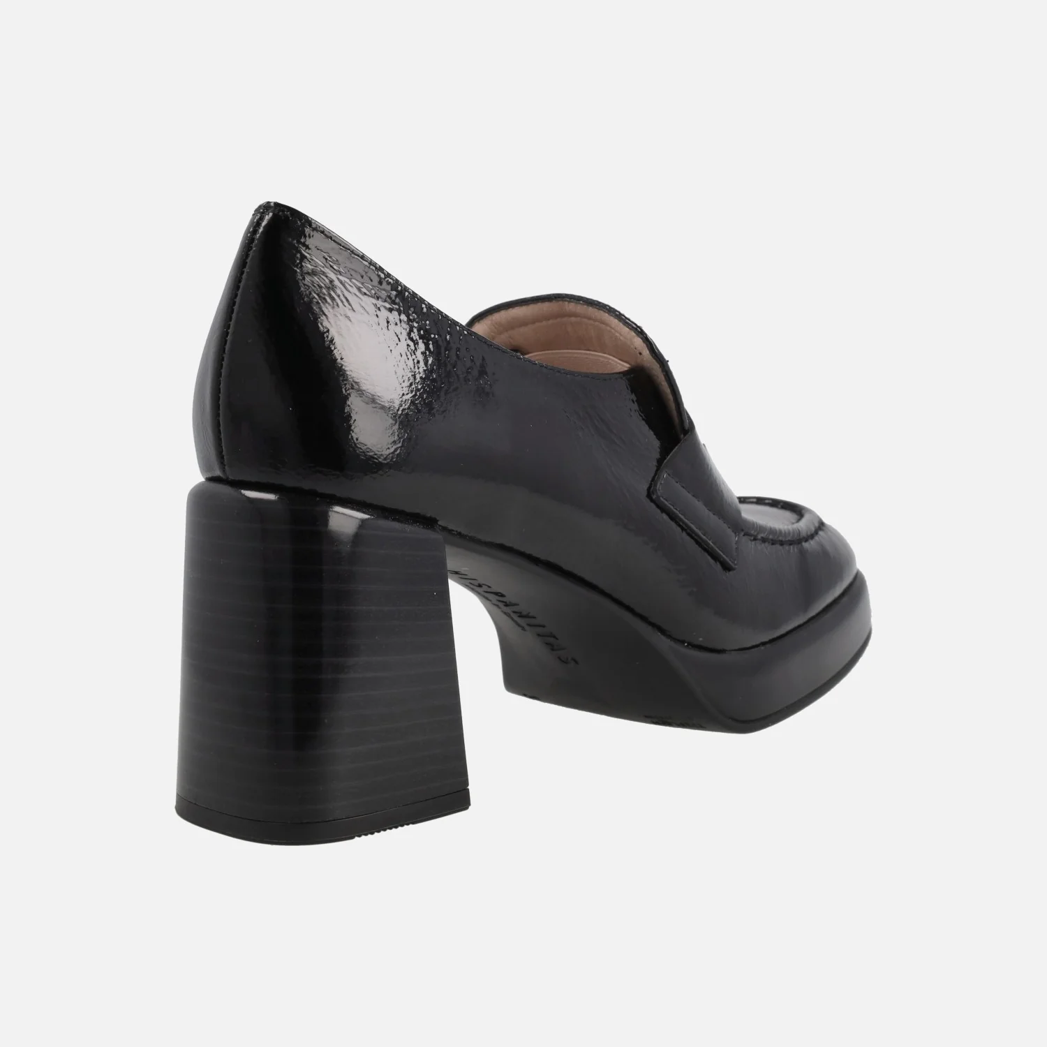 Zapatos mocasines para mujer de la marca Hispanitas modelo HI243696, disponibles en cuero y en negro. Mocasines de tacón alto y plataforma, elaborados en piel charol con adorno de antifaz. Interiores en microfibra. Tacones de 7,5 cms de altura (2 cms plataforma delantera). Sistema TRIFLOW de triple almohadillado, para un gran confort a la hora de caminar. Made in Spain.